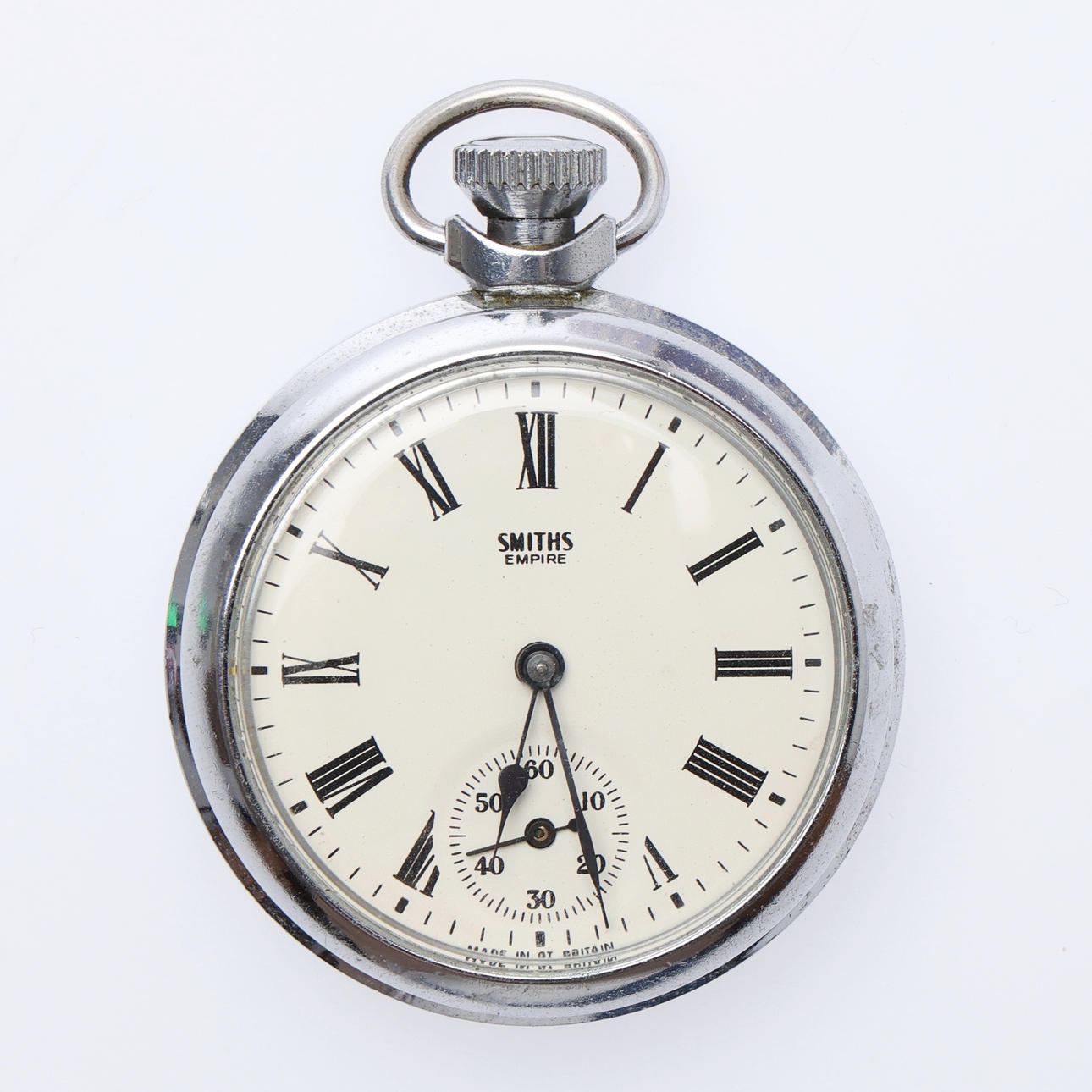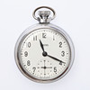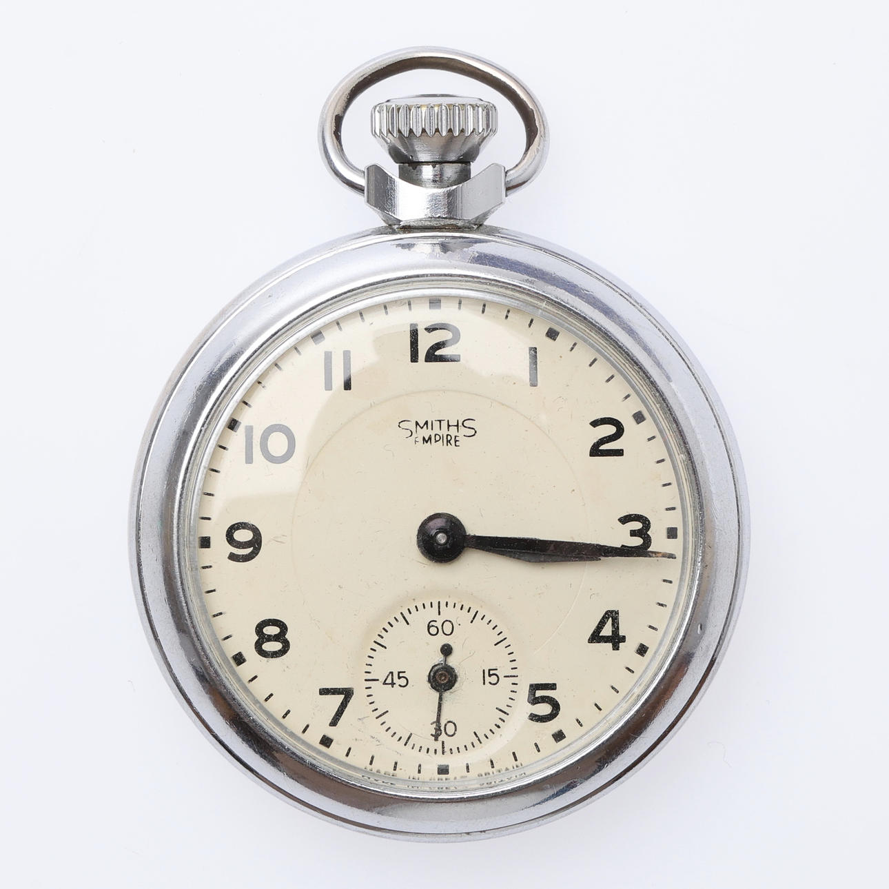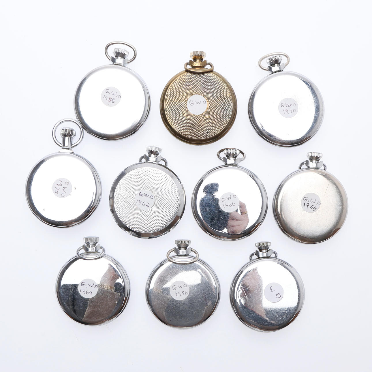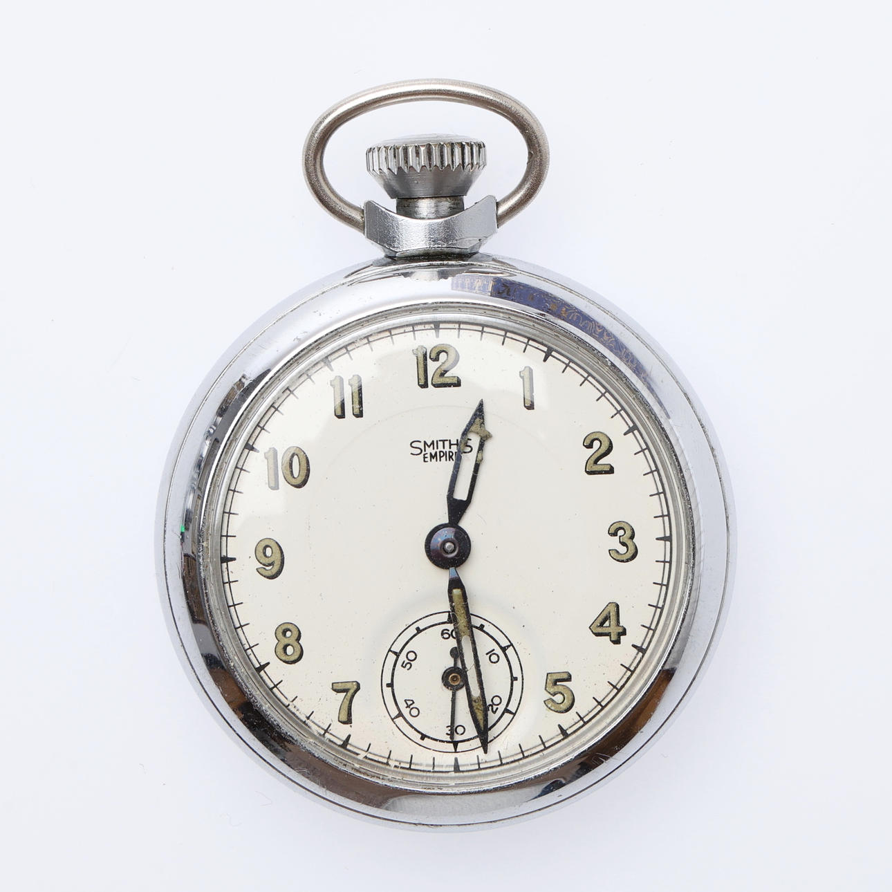 Each with a top wind movement, including 6 "Empire" examples, all but one with white/cream dials, in chromed cases, the last with a black dial in a brass case, Dia.50mm approx. (10).