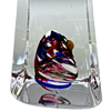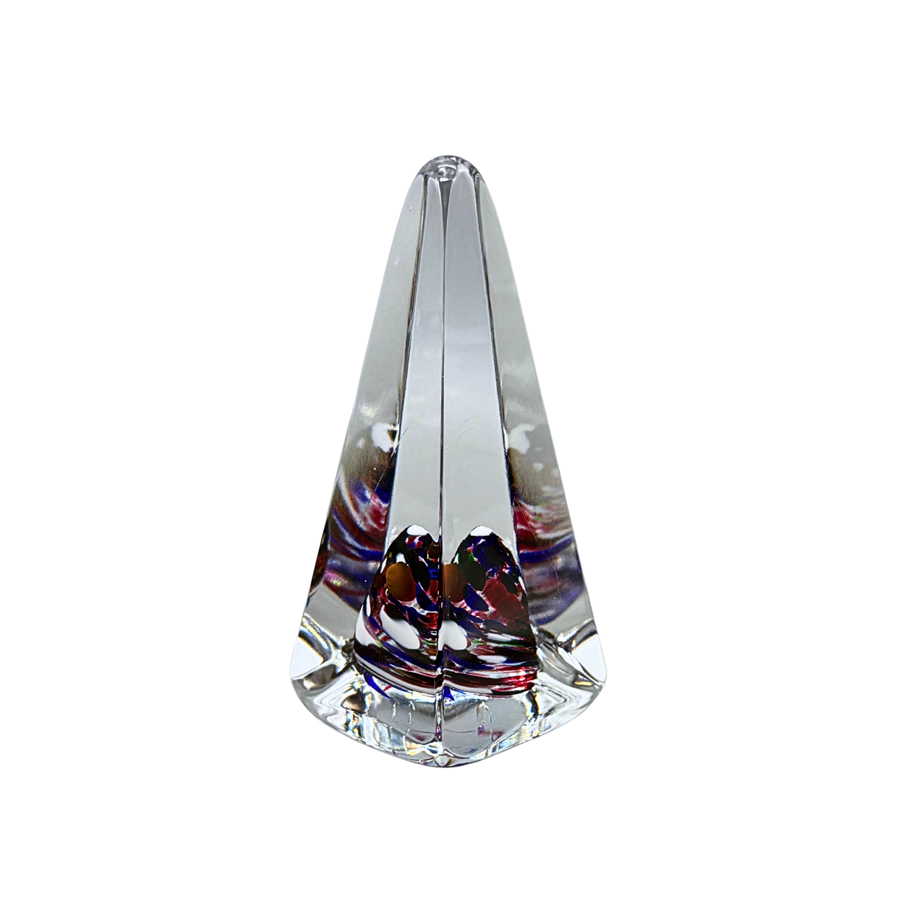A handmade paperweight made of art glass in an obelisk-shaped shape.