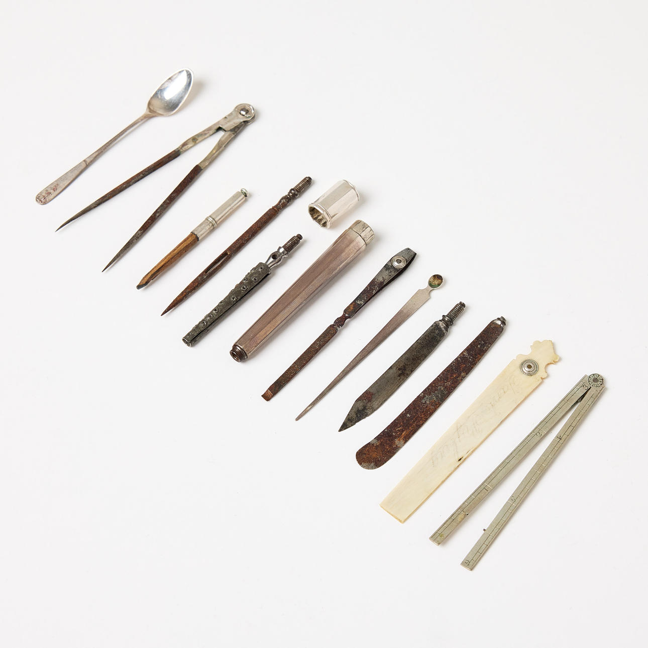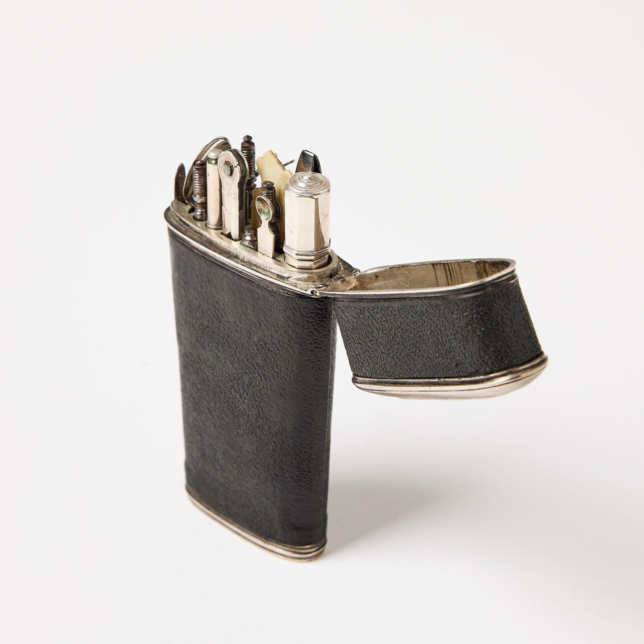 CASE, leather-covered, with utensils, circa 1800.