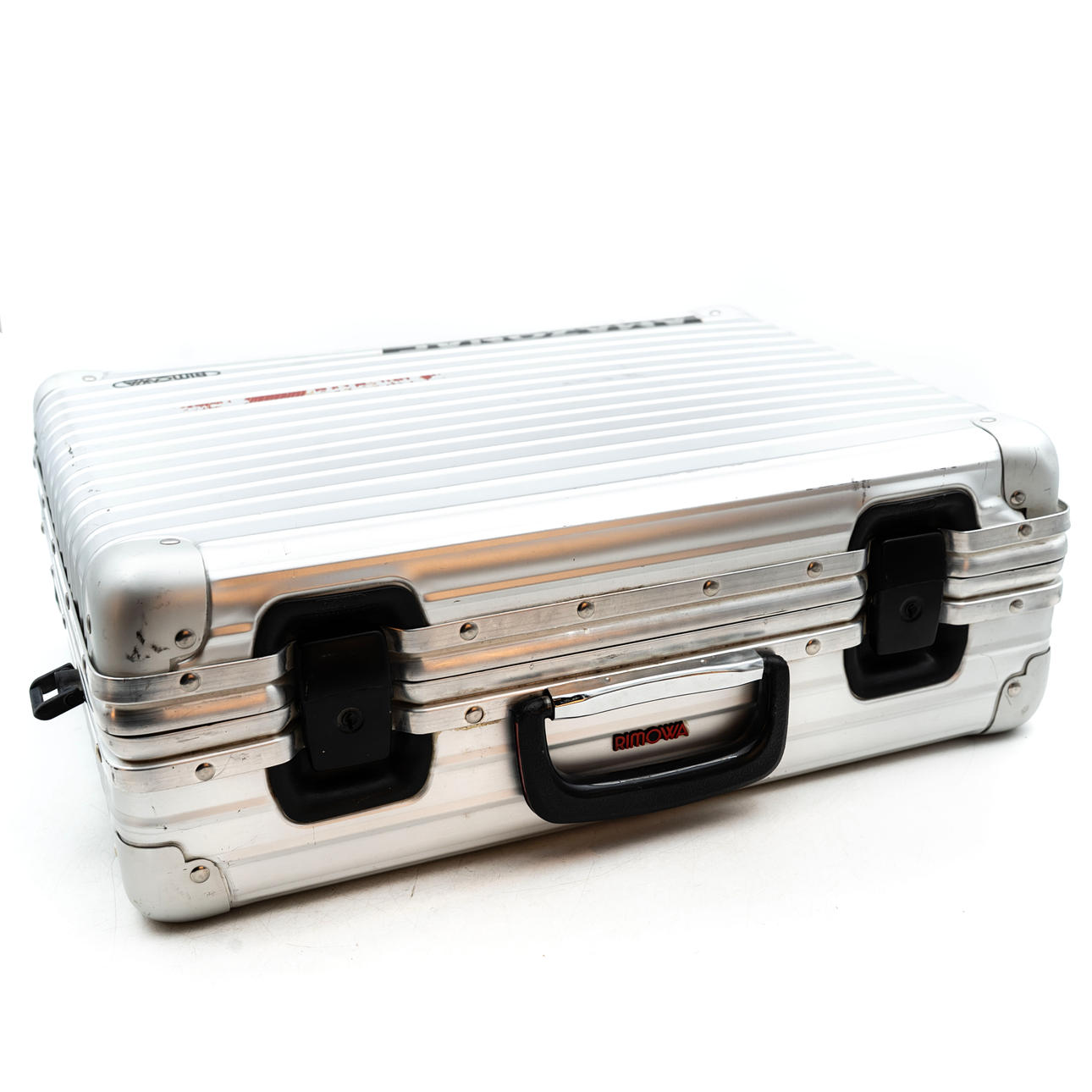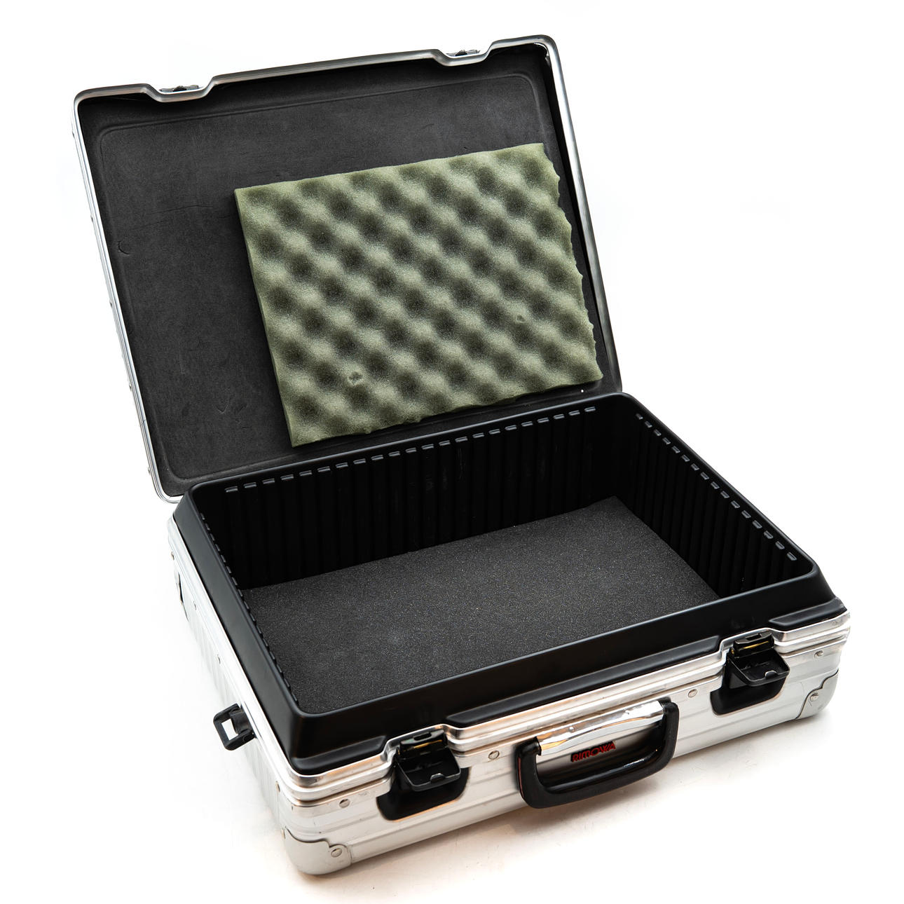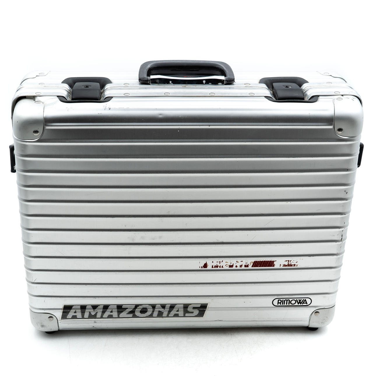 Aluminum case with plastic handle. Height: about 38 cm Length: about 47,5 cm Width: about 18 cm.
