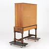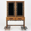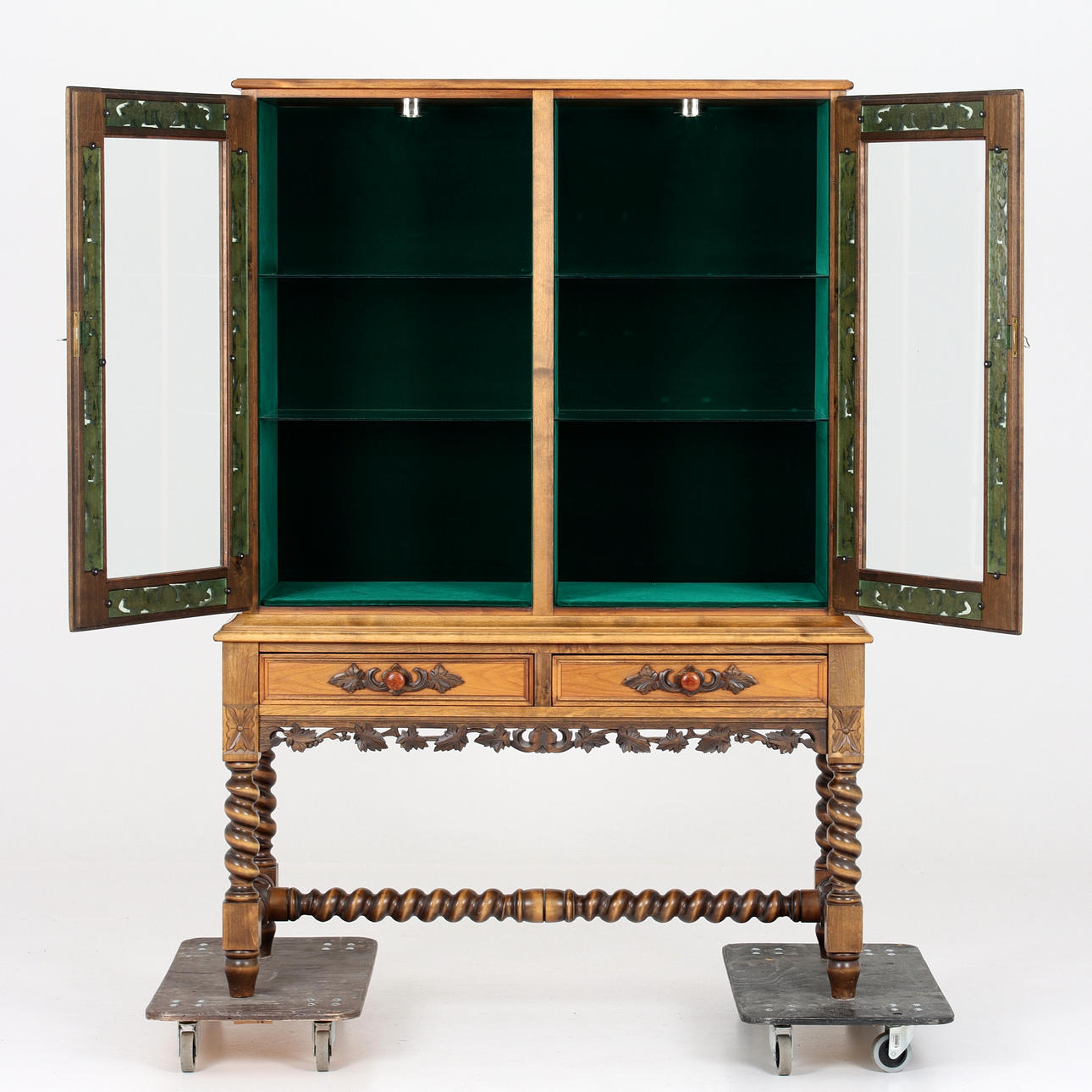 Cabinet with glazed door pair. Inside dressed in green plush, shelves made of glass. Wood carved decor with spiral turned leg stand. Divisible into upper and lower parts.