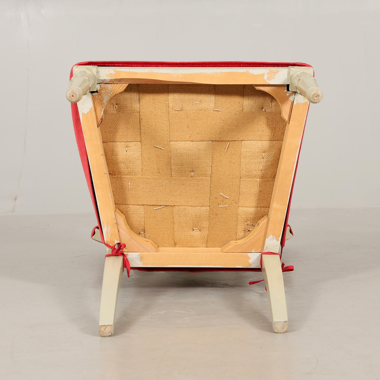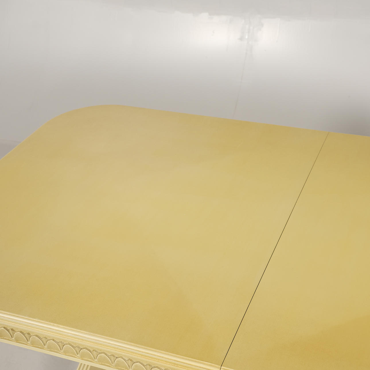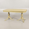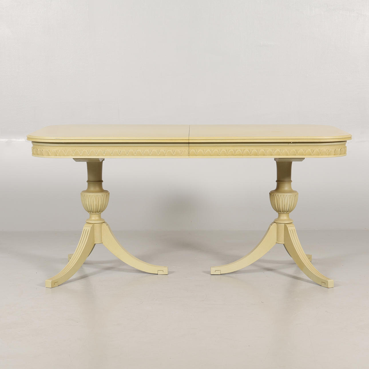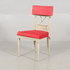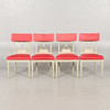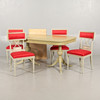 table top slightly yellowed, chairs with cover on textiles, covers slightly bleached, chairs in good condition, table sharpens slightly when pulled out to put in the boards.