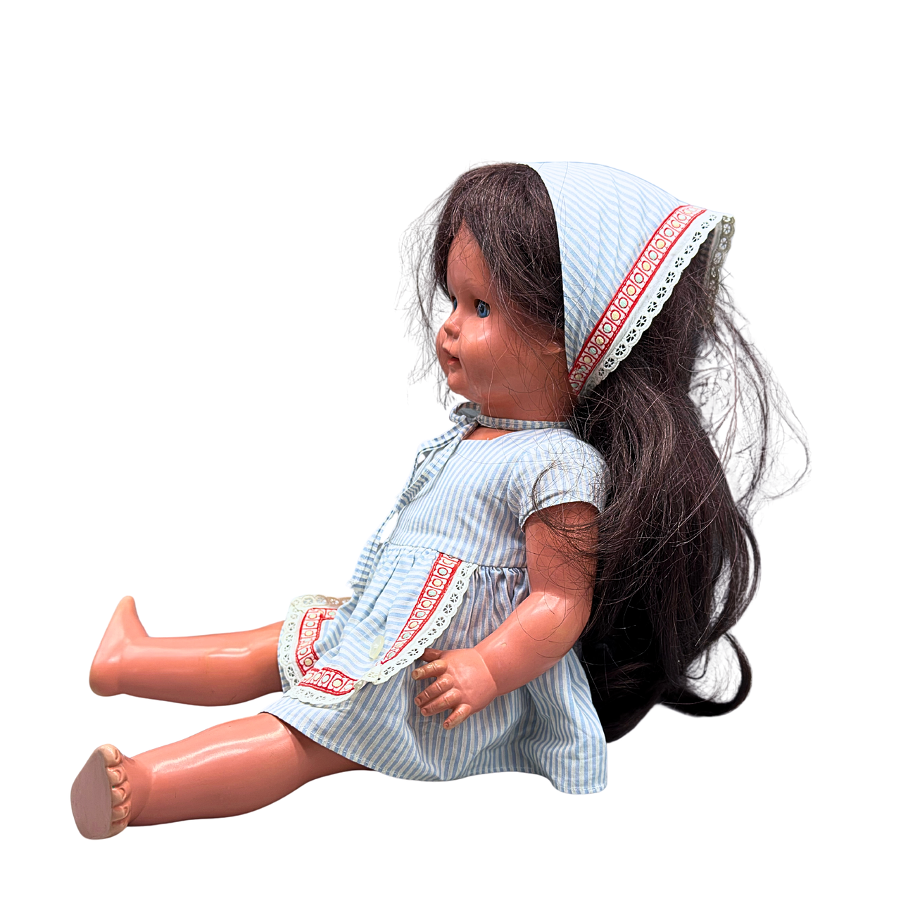 A big doll from the brand Schildkröt with brown hair and blue eyes.