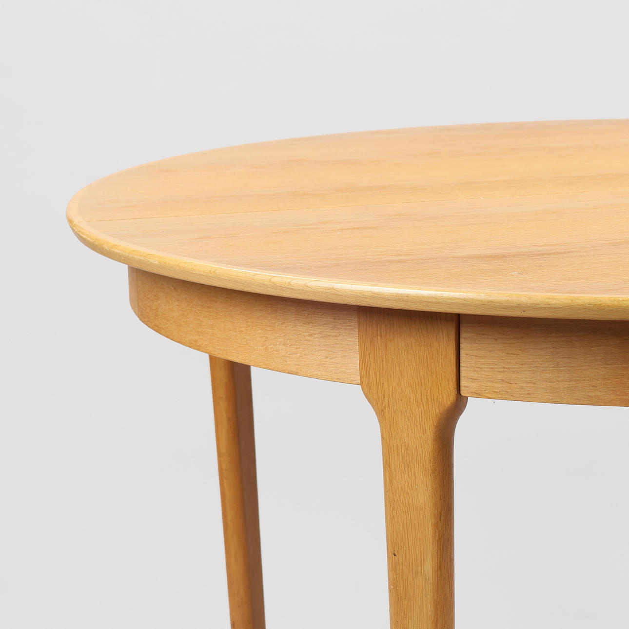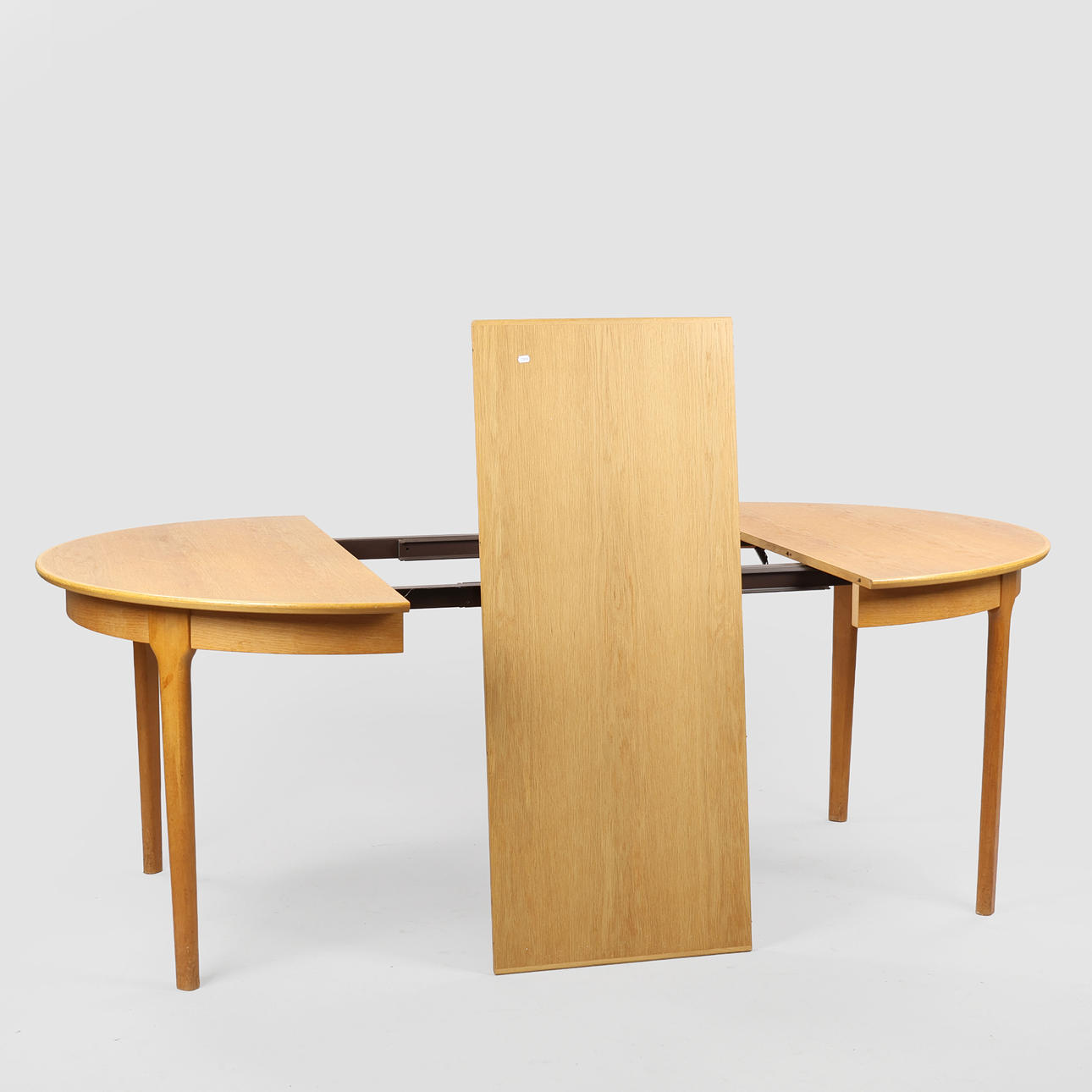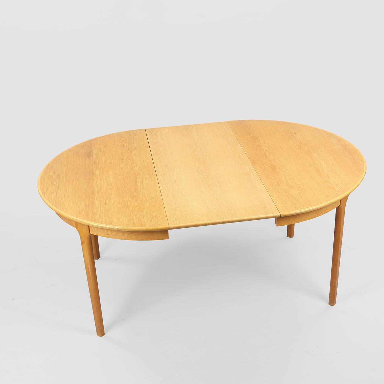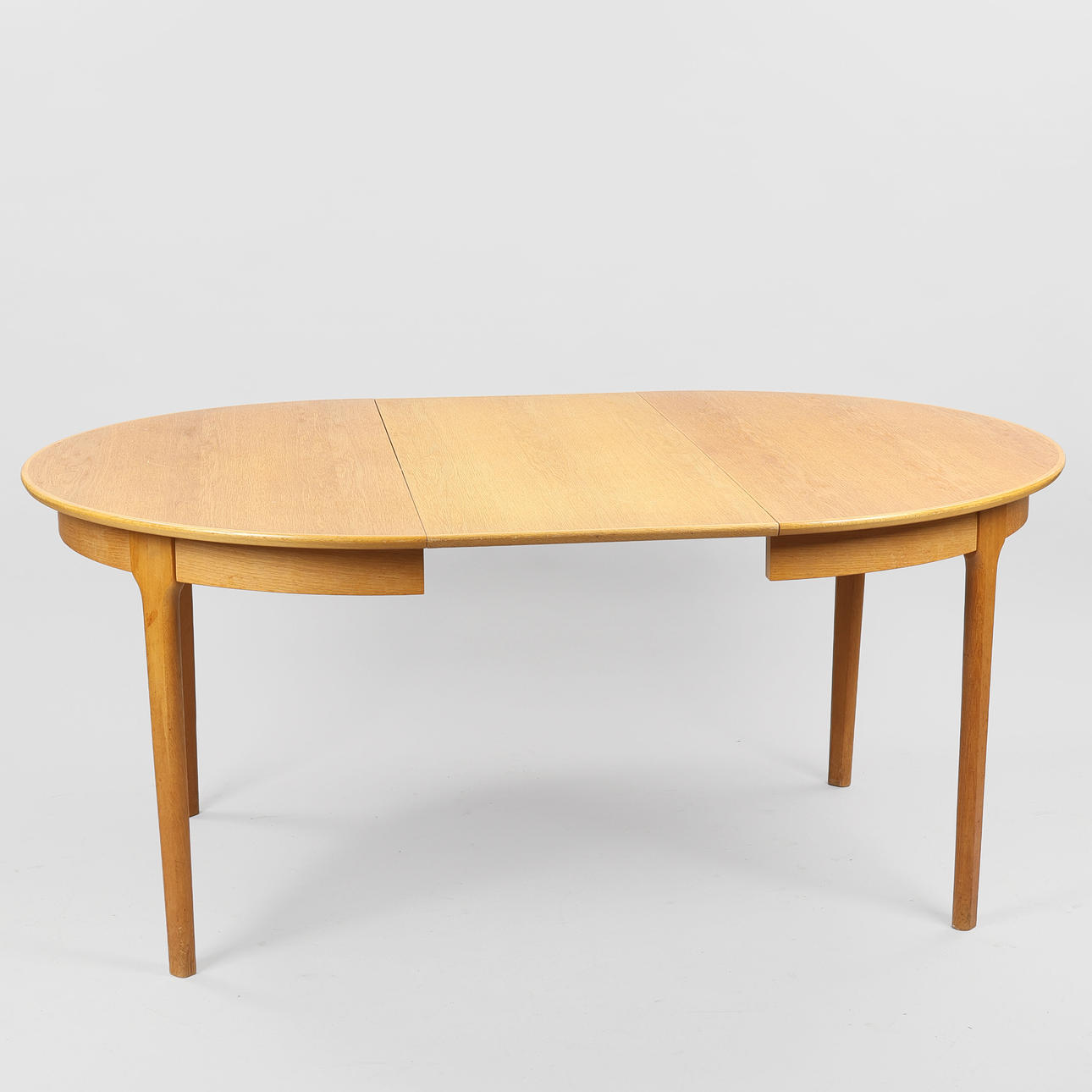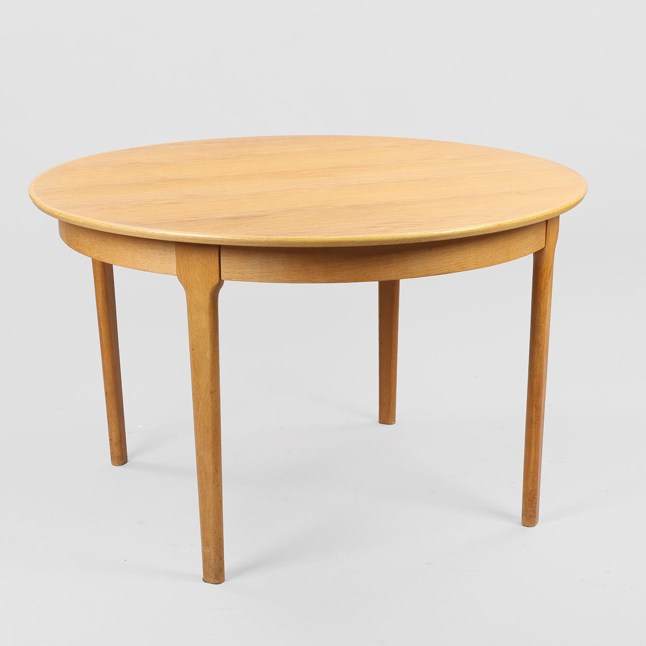 Circular pull-out table made of oak with an additional plate Model 62. Designed 1958. Made at Sorø Stolefabrik. H. 72.5. Diameter I'm 120. L. 170. (2nd).