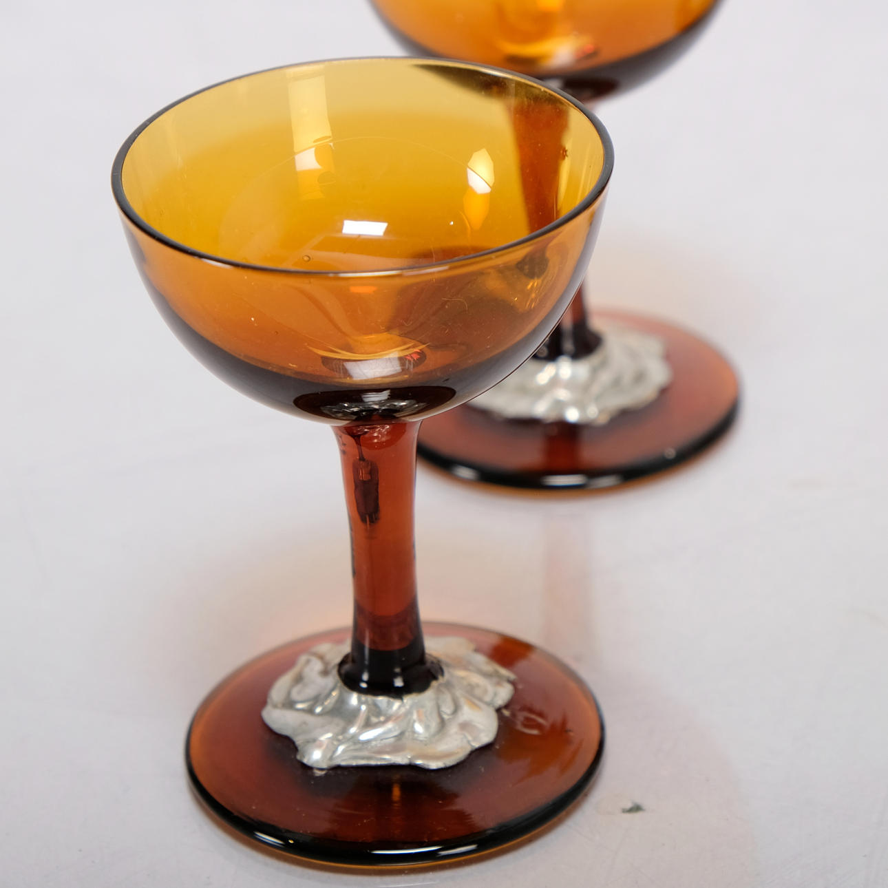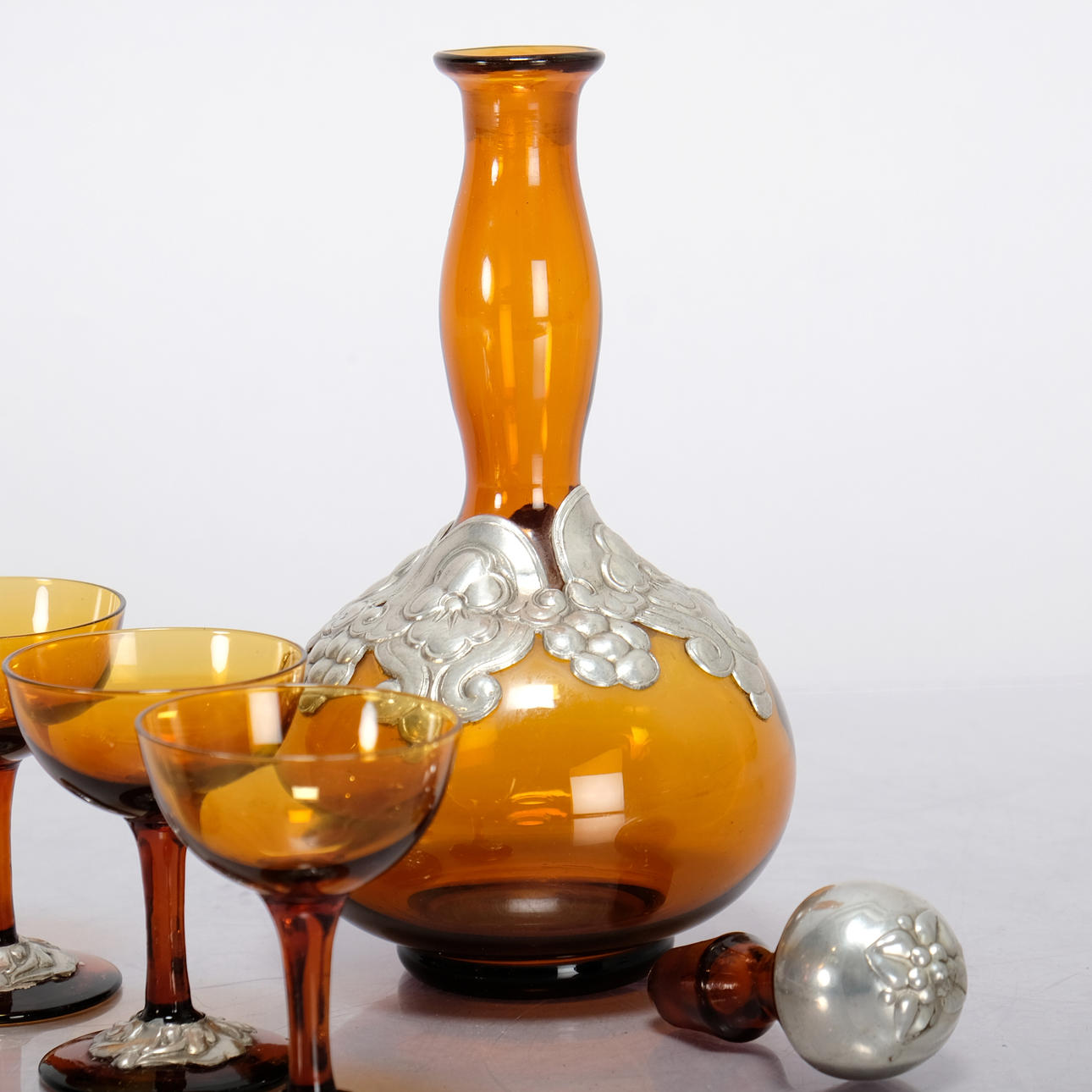 Made of glass with tin decor. Consists of 1 Decanter, height: about 25 cm 6 Liqueur glass, height: approx. 8.5 cm.
