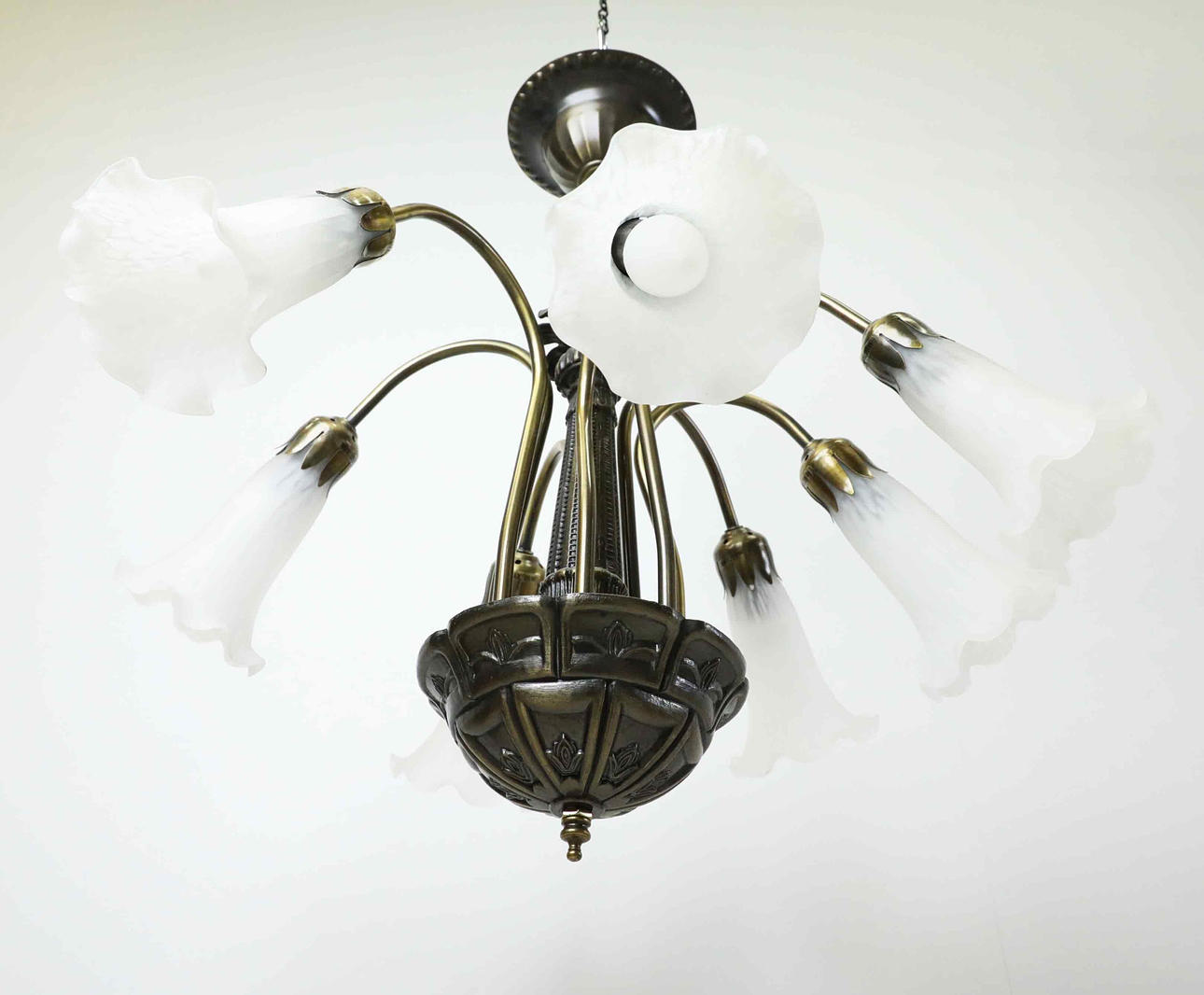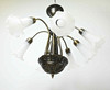 Seven bright spots, patinated metal, glass cups. Width 54 cm.