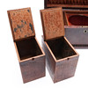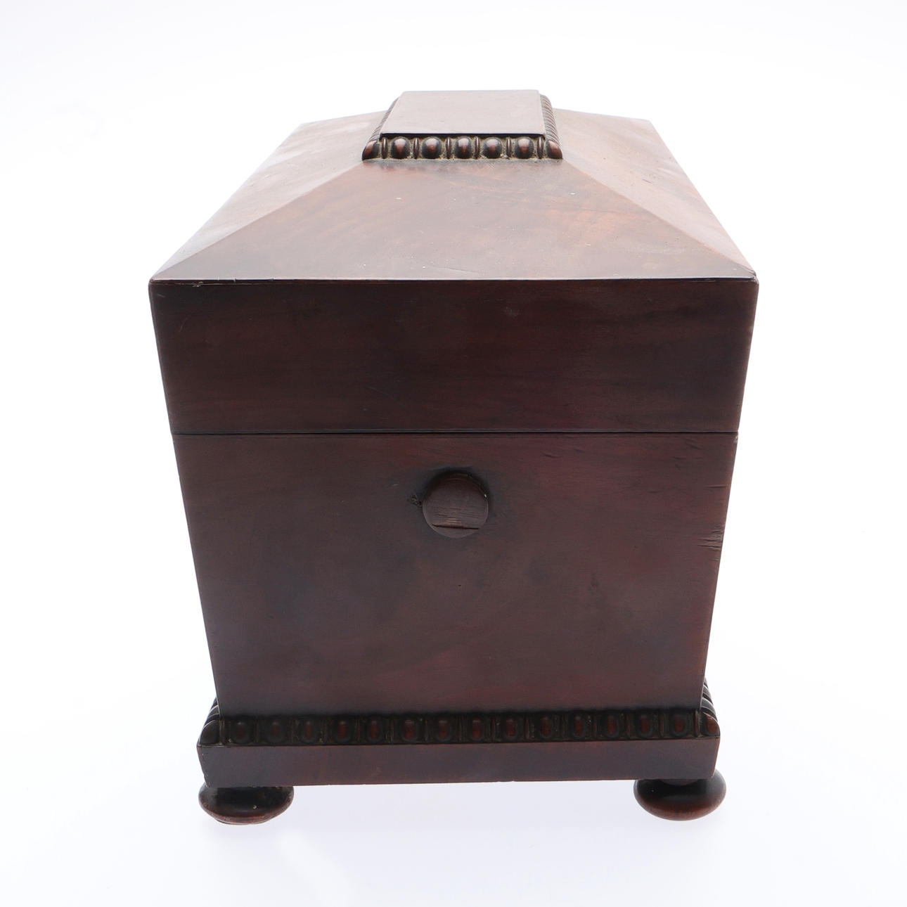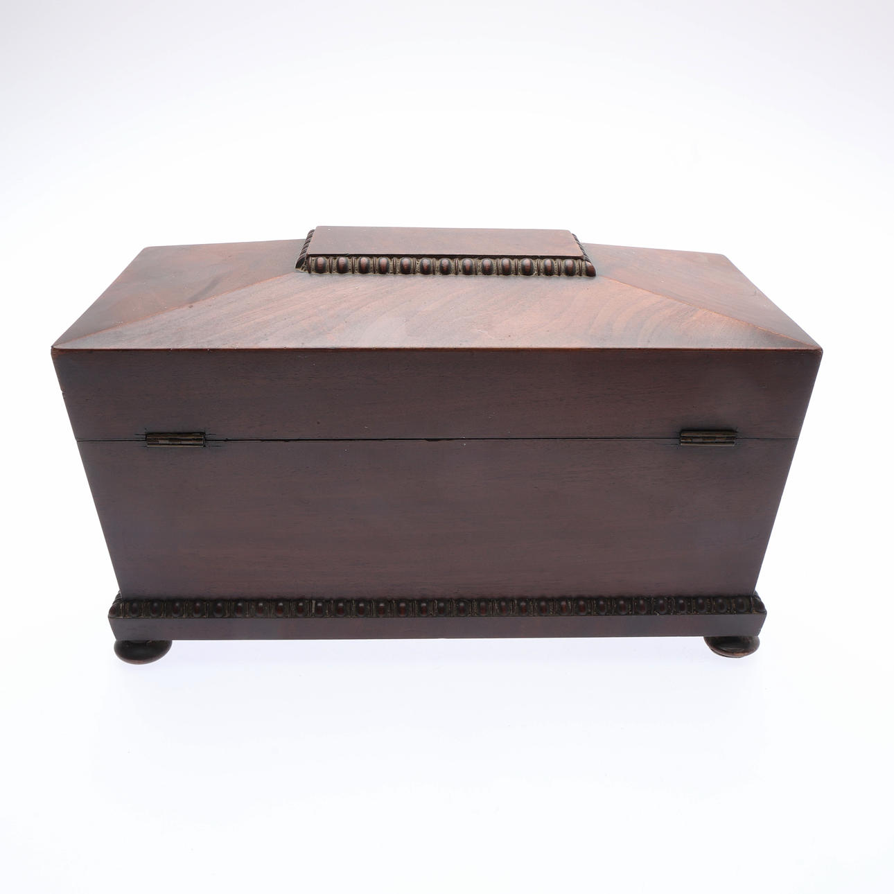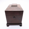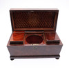 Of sarcophagus form, with straight gadrooned decoration, the hinged cover enclosing a central well flanked by 2 removable rectangular caddies, on bun feet, H.19.5 x W.33 x D.16.5cm overall.