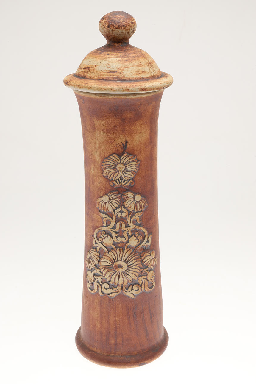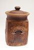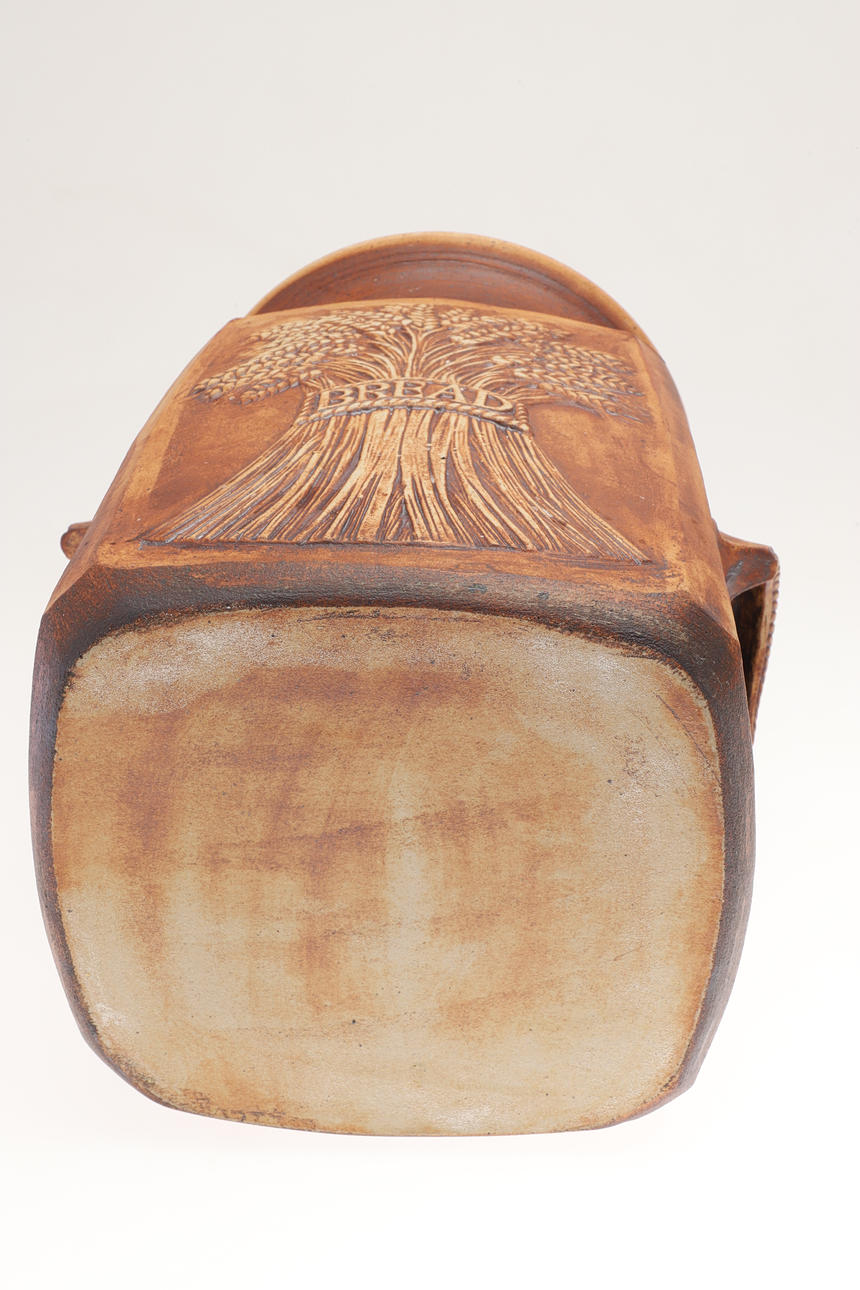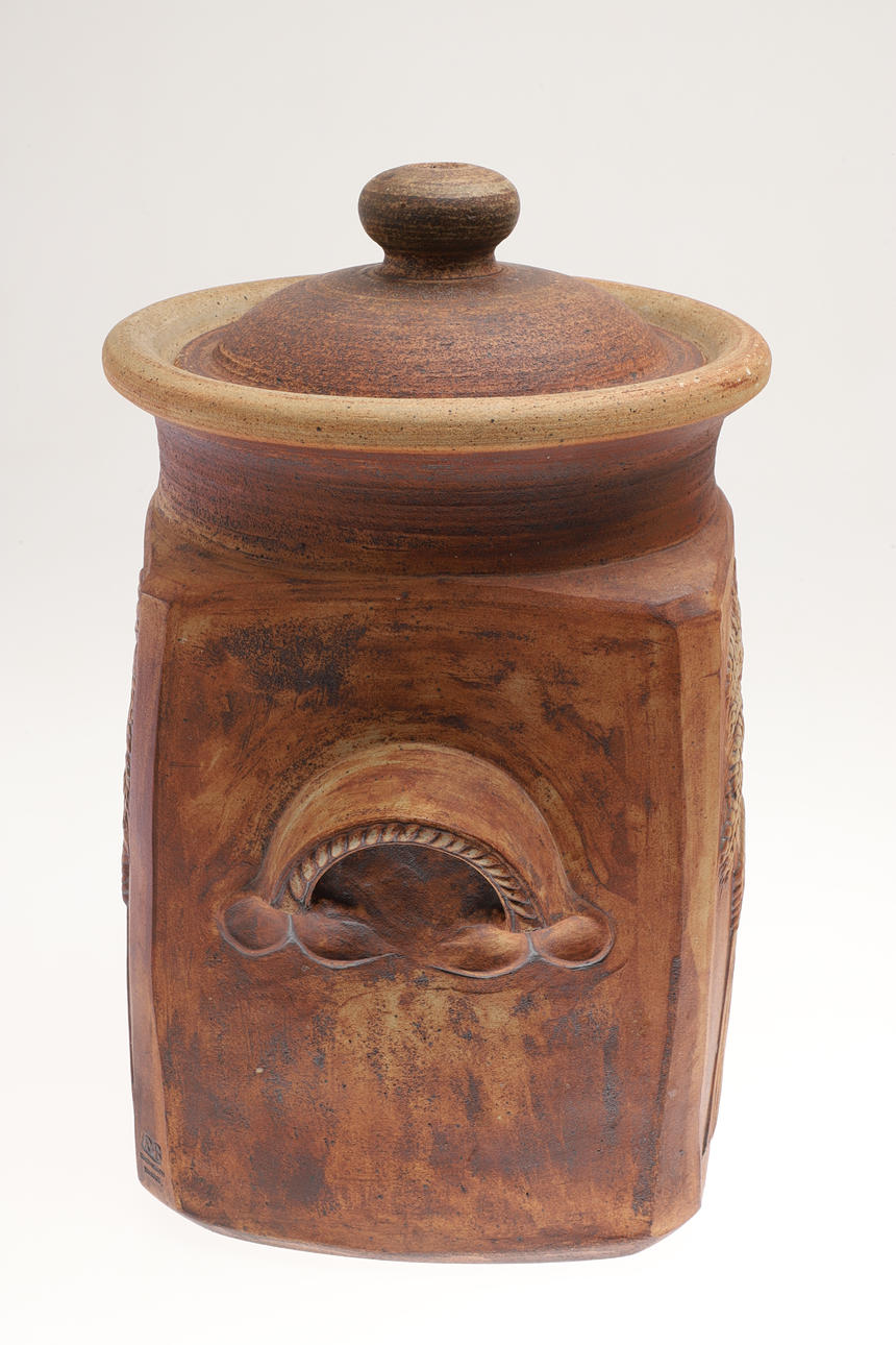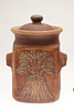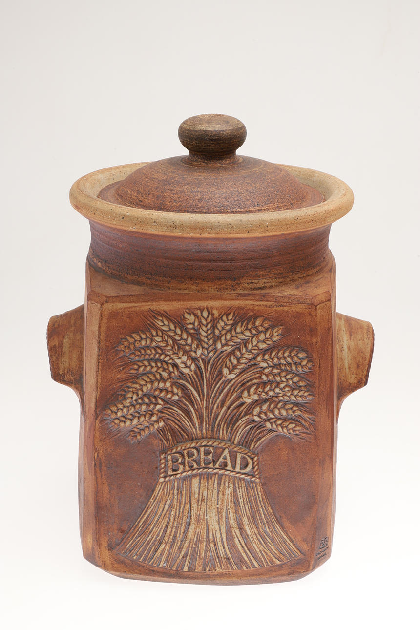 Including a very large lidded bread bin, with carrying handles on each side and tenmoku glaze to the interior (42cms high), and a large lidded jar (52cms high). (2).