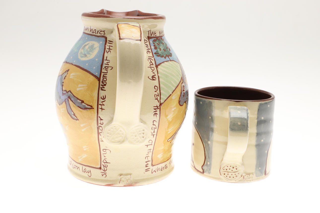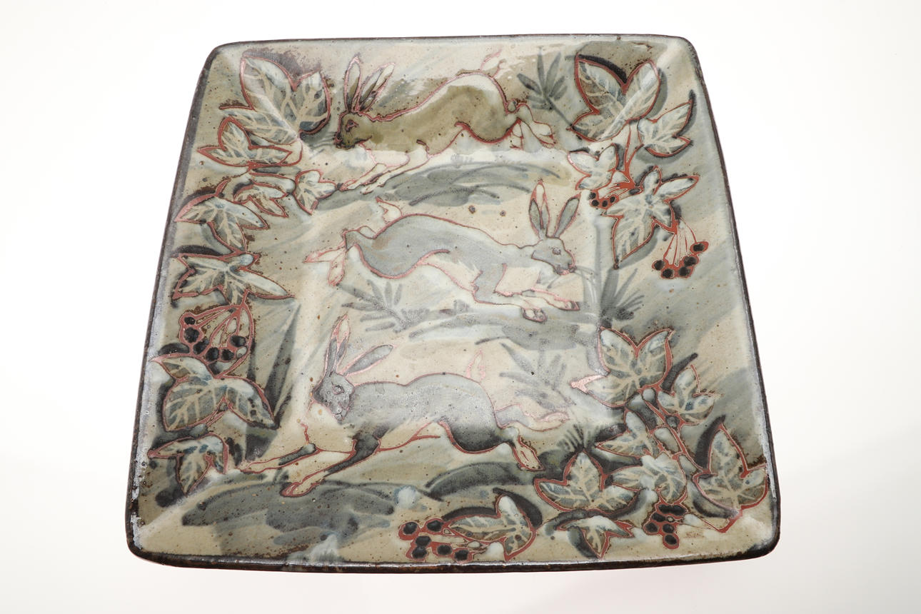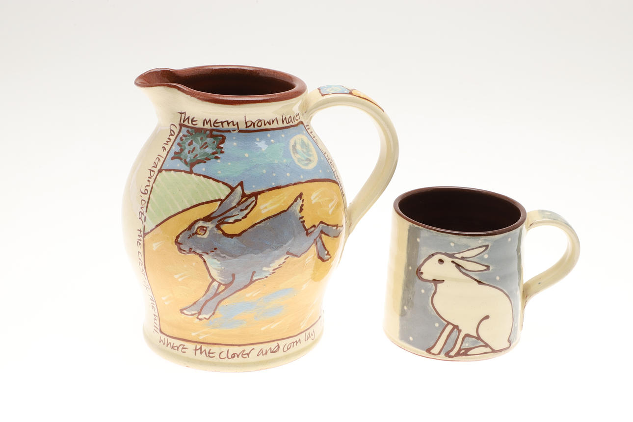 Three slipware pottery items by Clio Graham, including a dish painted with a hare in the centre and verse around the rim (28cms diameter), a jug with hare design (16cms high) and mug (8.5cms high). Also with a pottery glazed dish by Jill Holland (26.5cms diameter), and a stoneware dish painted with hares and foliage (29cms square). (5).
