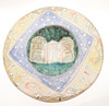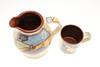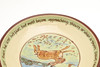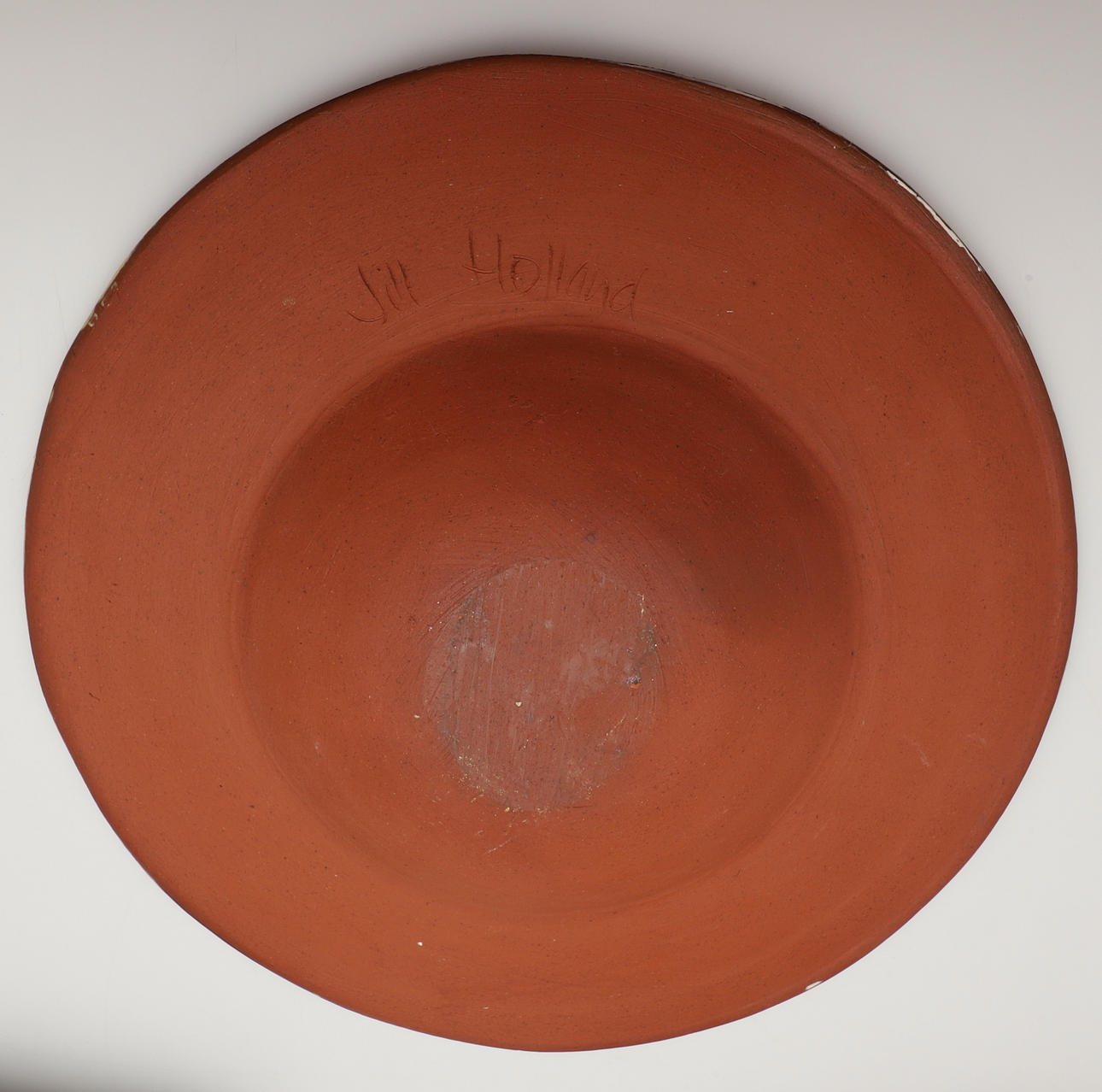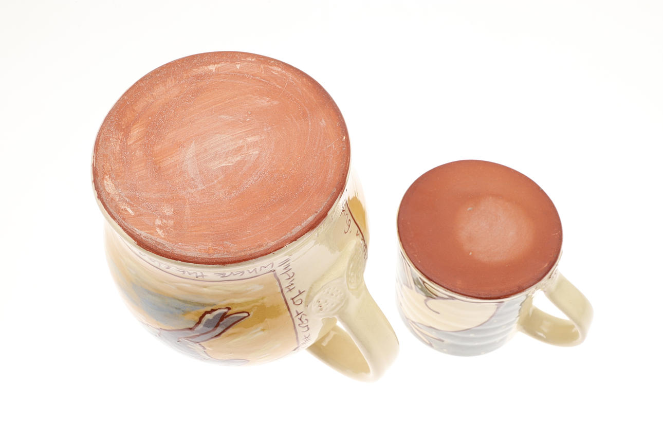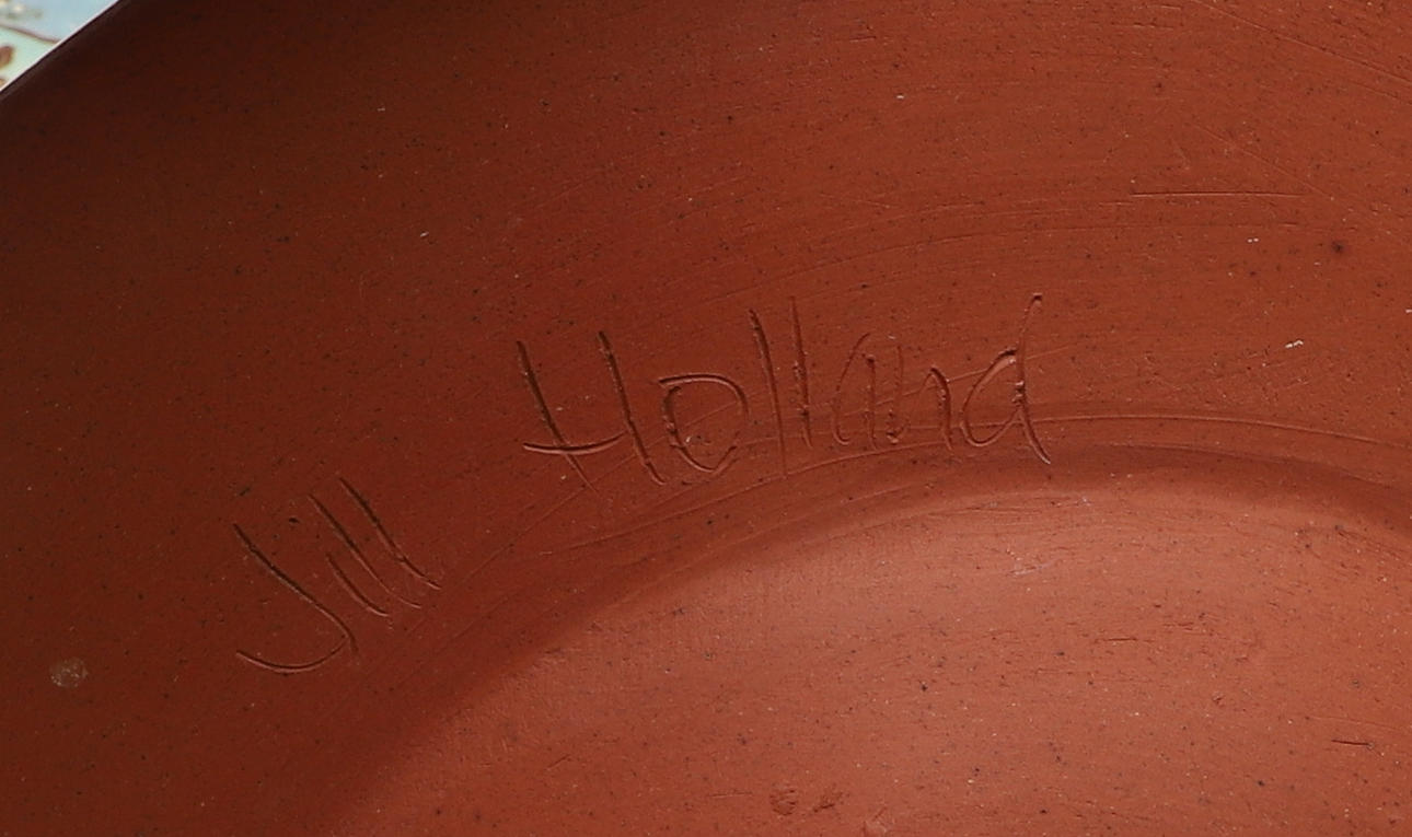 Three slipware pottery items by Clio Graham, including a dish painted with a hare in the centre and verse around the rim (28cms diameter), a jug with hare design (16cms high) and mug (8.5cms high). Also with a pottery glazed dish by Jill Holland (26.5cms diameter), and a stoneware dish painted with hares and foliage (29cms square). (5).
