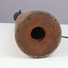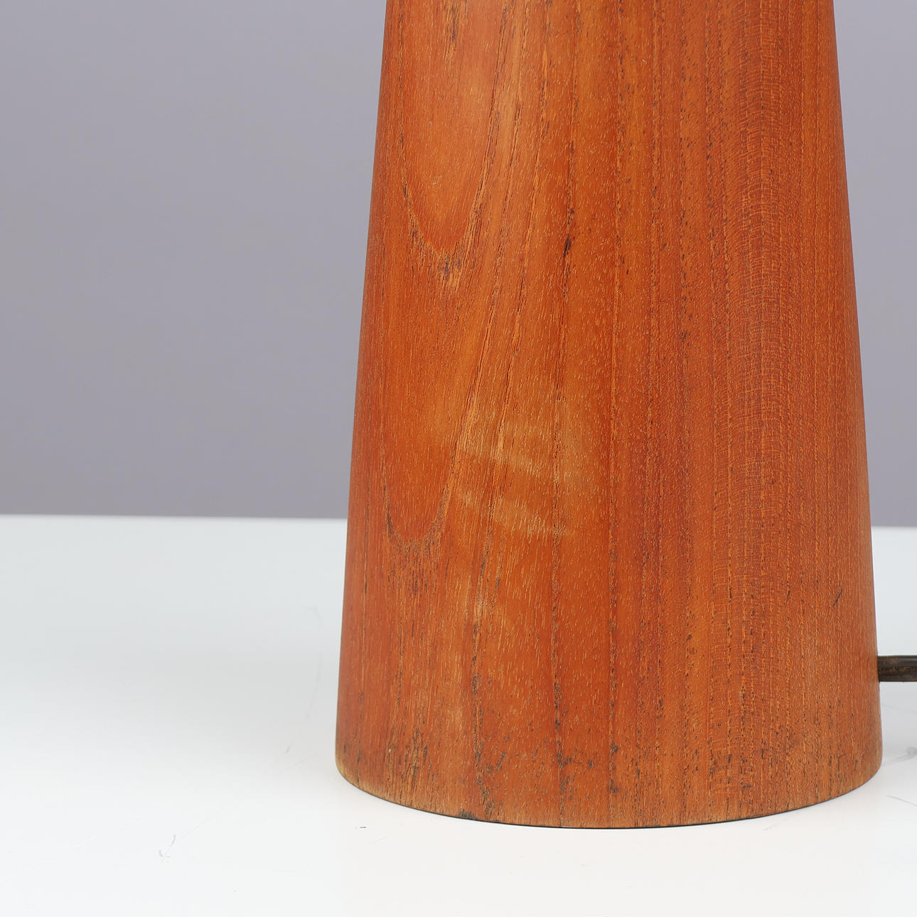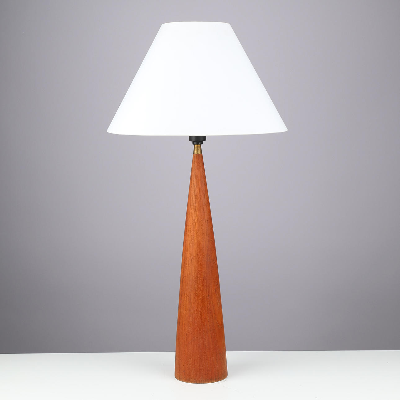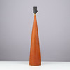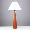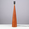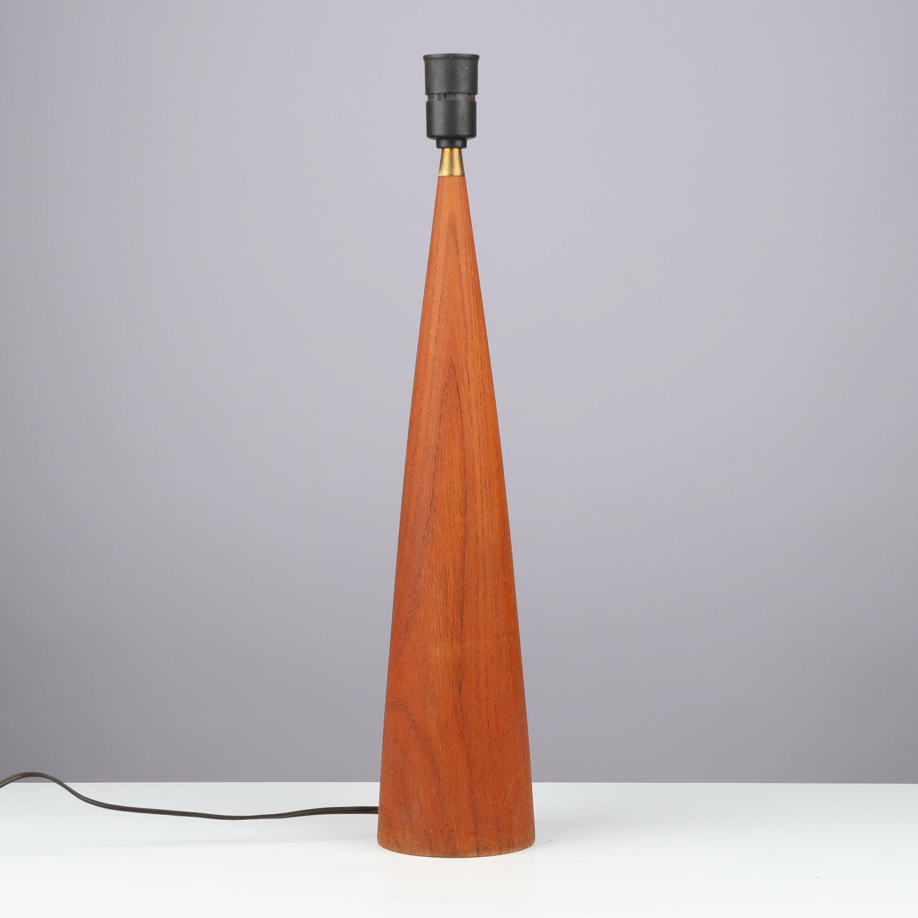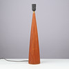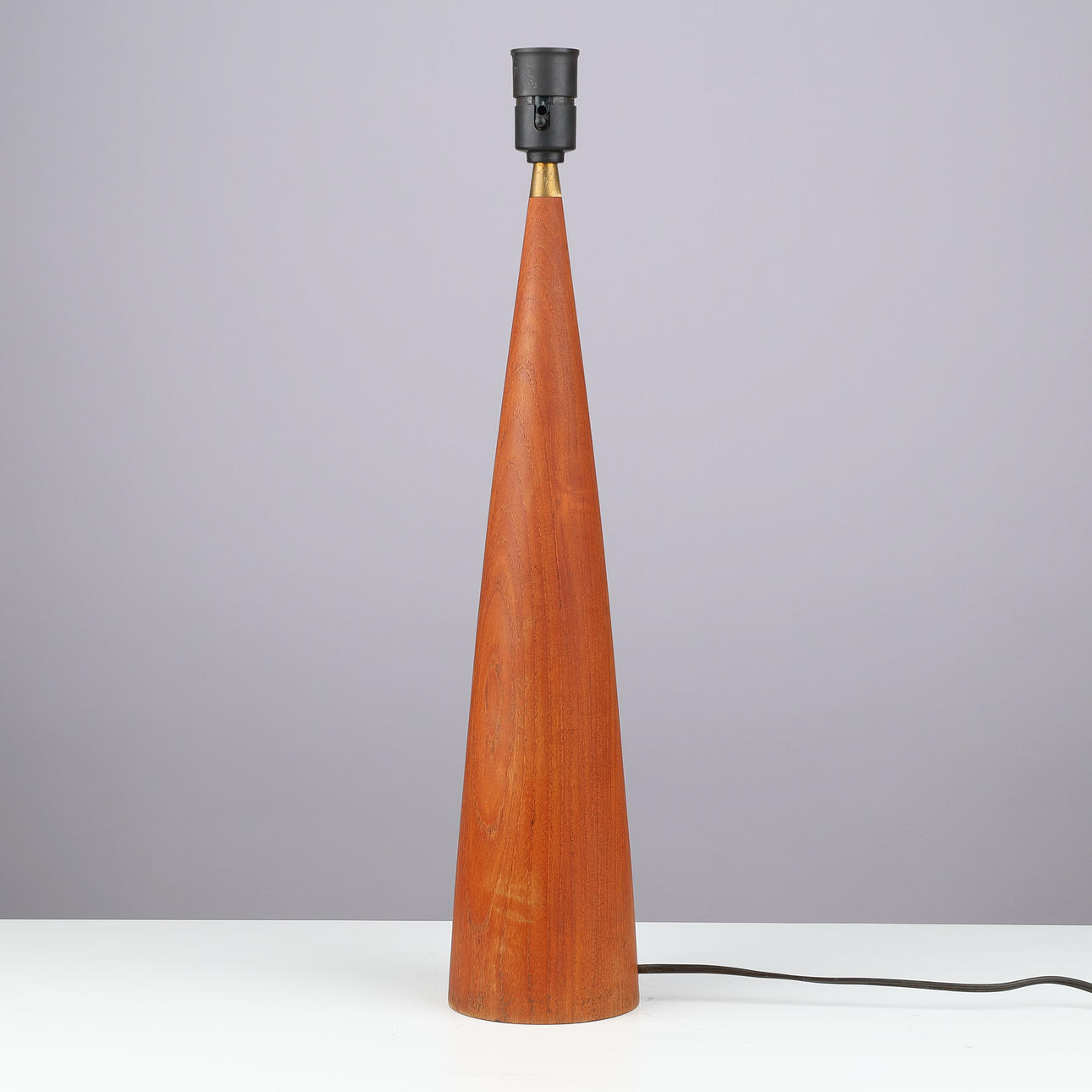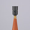 Tapered teak table lamp, black plastic socket and brass mounting.