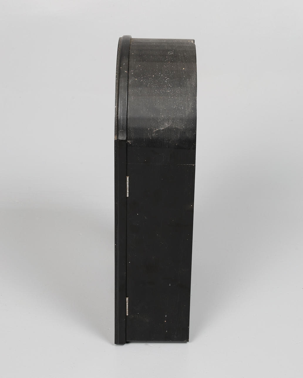With a circular white enamelled dial, black Arabic numerals, day and date aperture below, enclosing a 30 day movement striking every half hour on 2 straight gongs, in an arched ebonised case, H.43.5 x W.25.5cm overall.