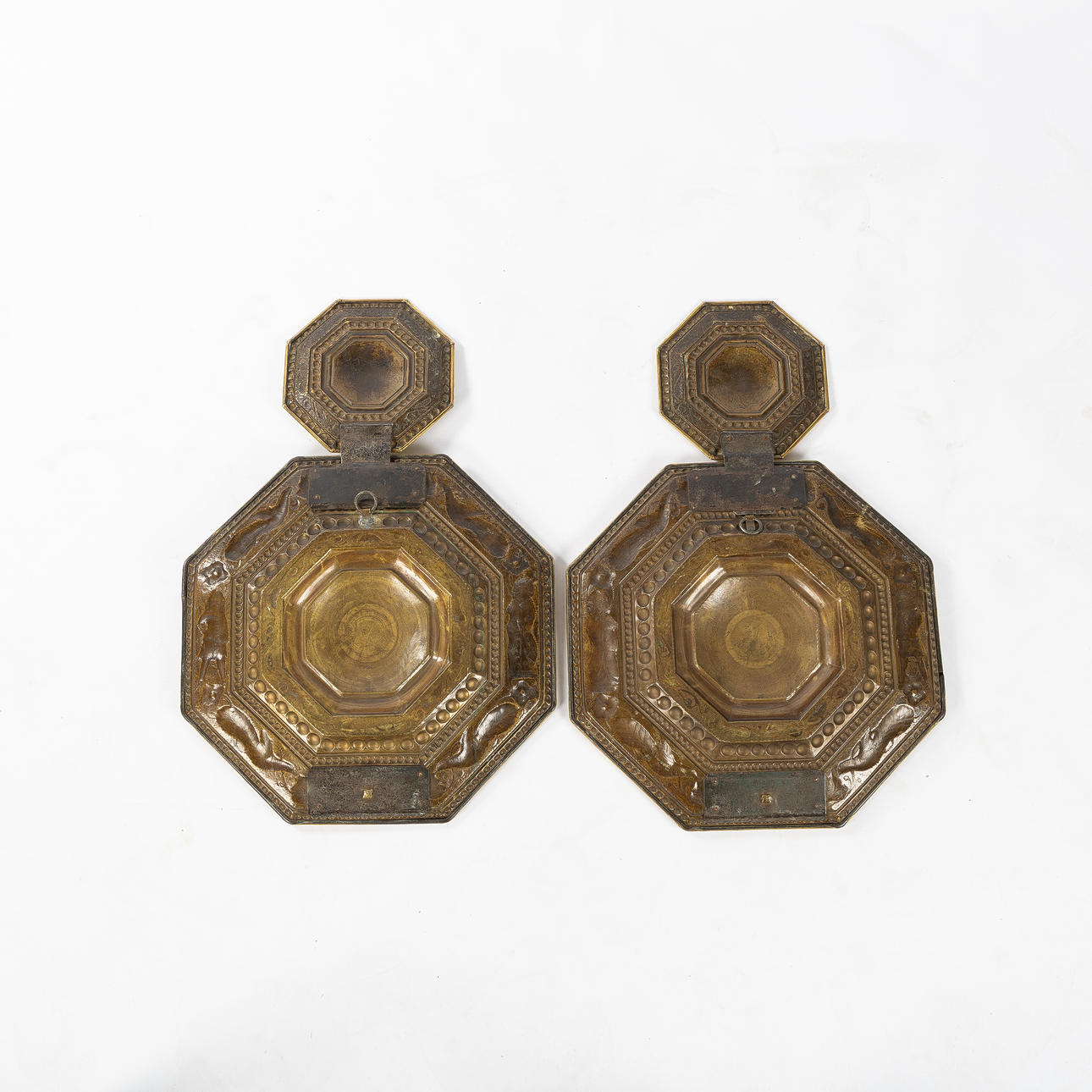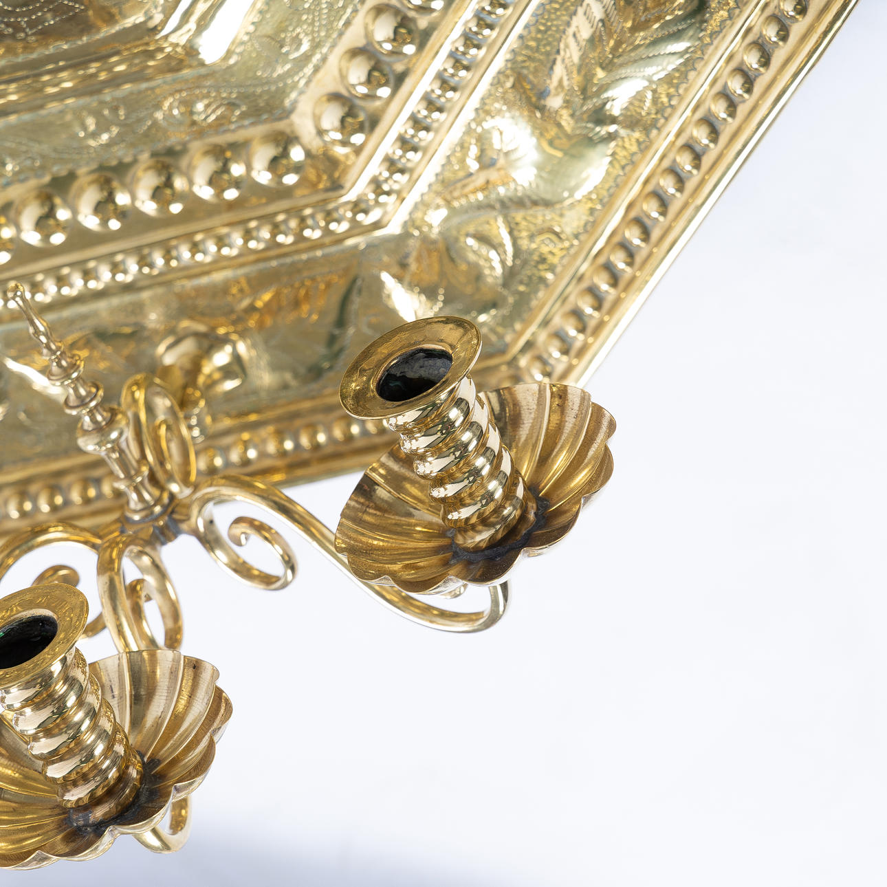 Ciseled, repoussed and punched decoration of nobles, doves, lions, pigeons etc. Light arms for three candles.