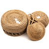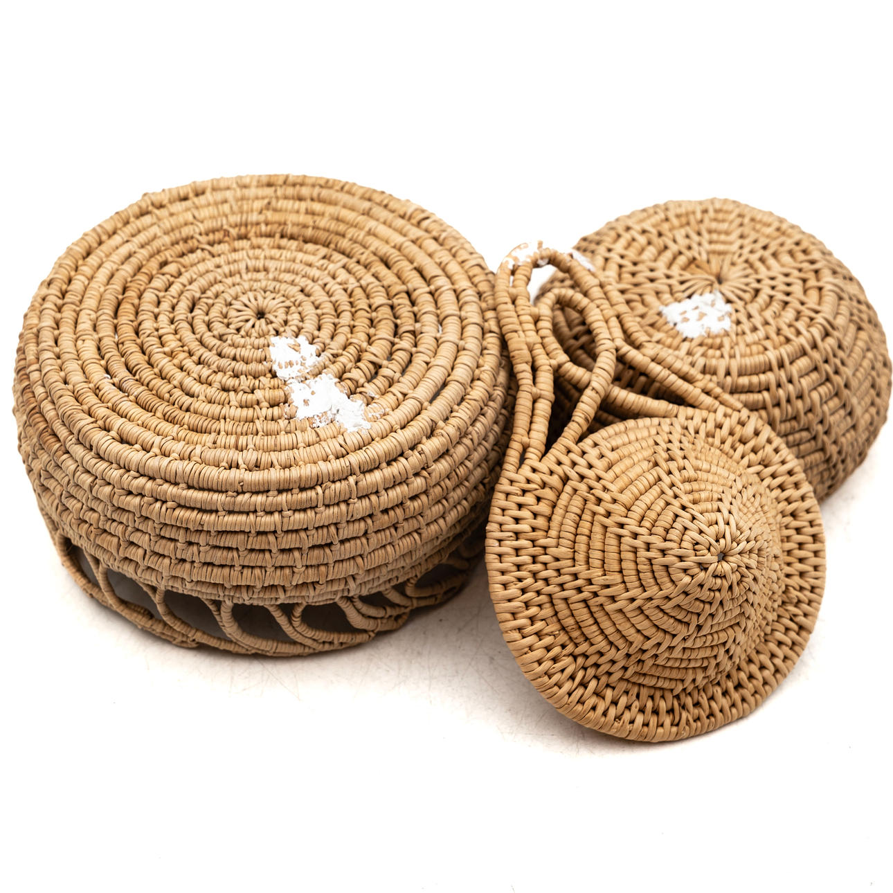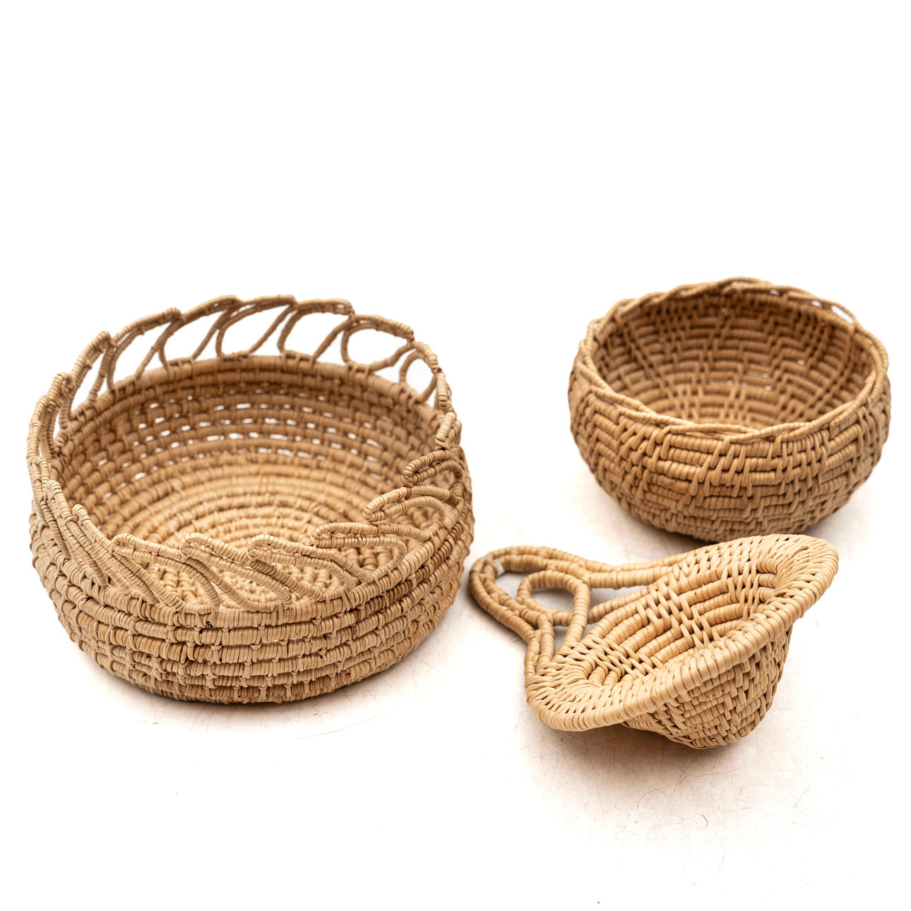 Attributed to Astrid Lind. Assorted size baskets as well as a tea strainer in rootwork.