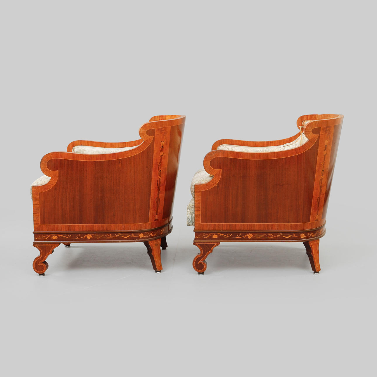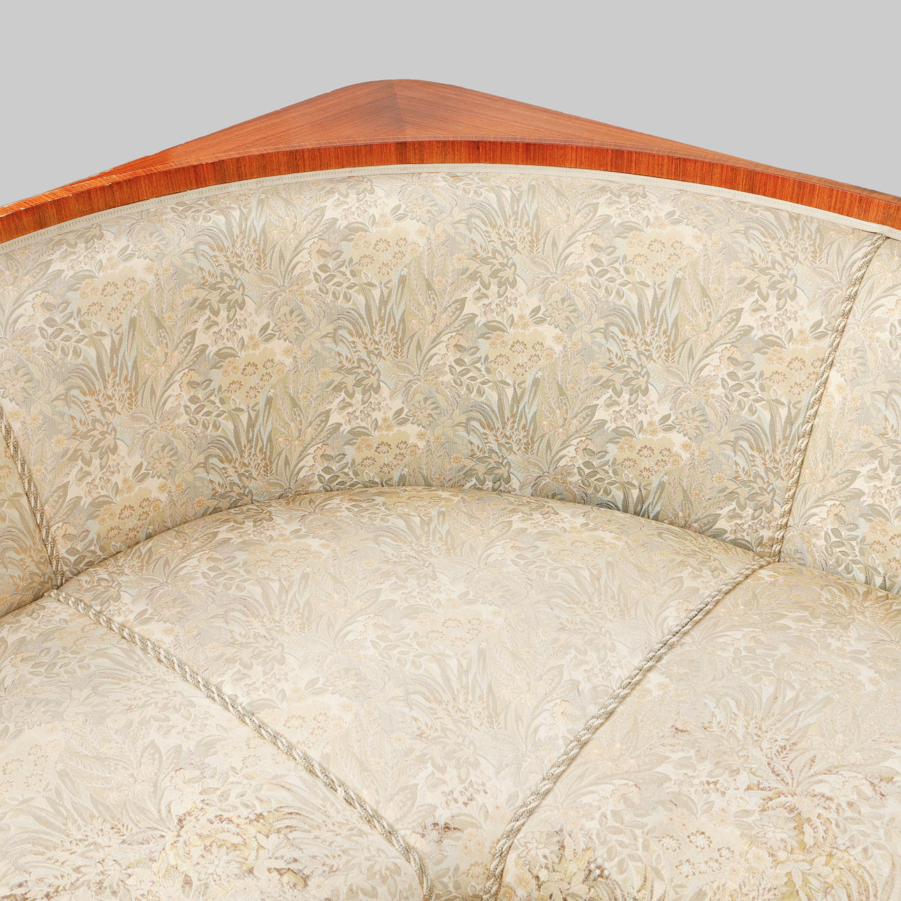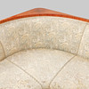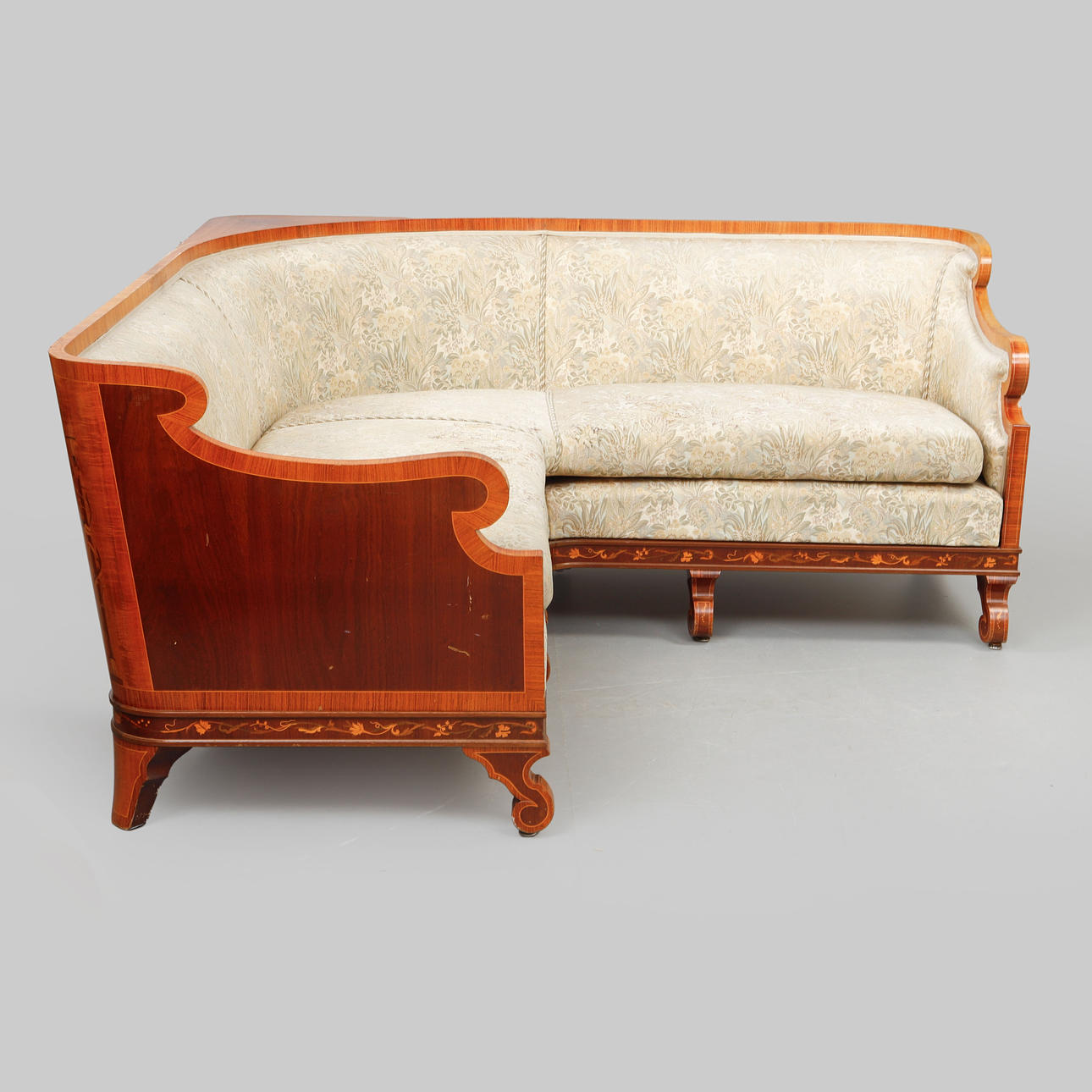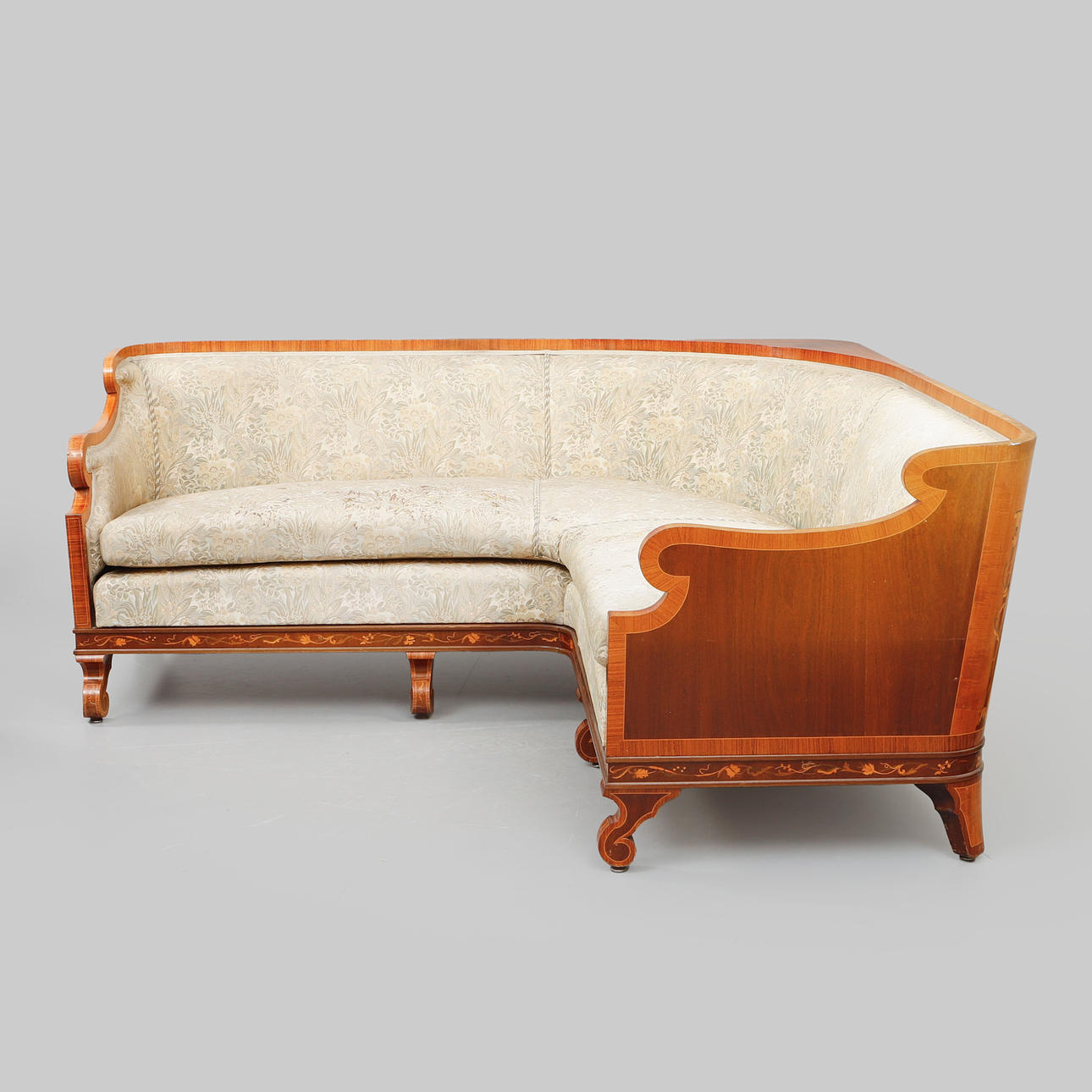 Different types of wood. Sofa seat height approx. 50 cm, back height approx. 82 cm, length ca 201 cm + 187 cm, depth approx. 85 cm. 2 armchairs seat height approx. 45 cm, back height approx. 79 cm, width approx. 70 cm, depth approx. 80 cm x 2. Table diameter approx. 100 cm, height approx. 71 cm.