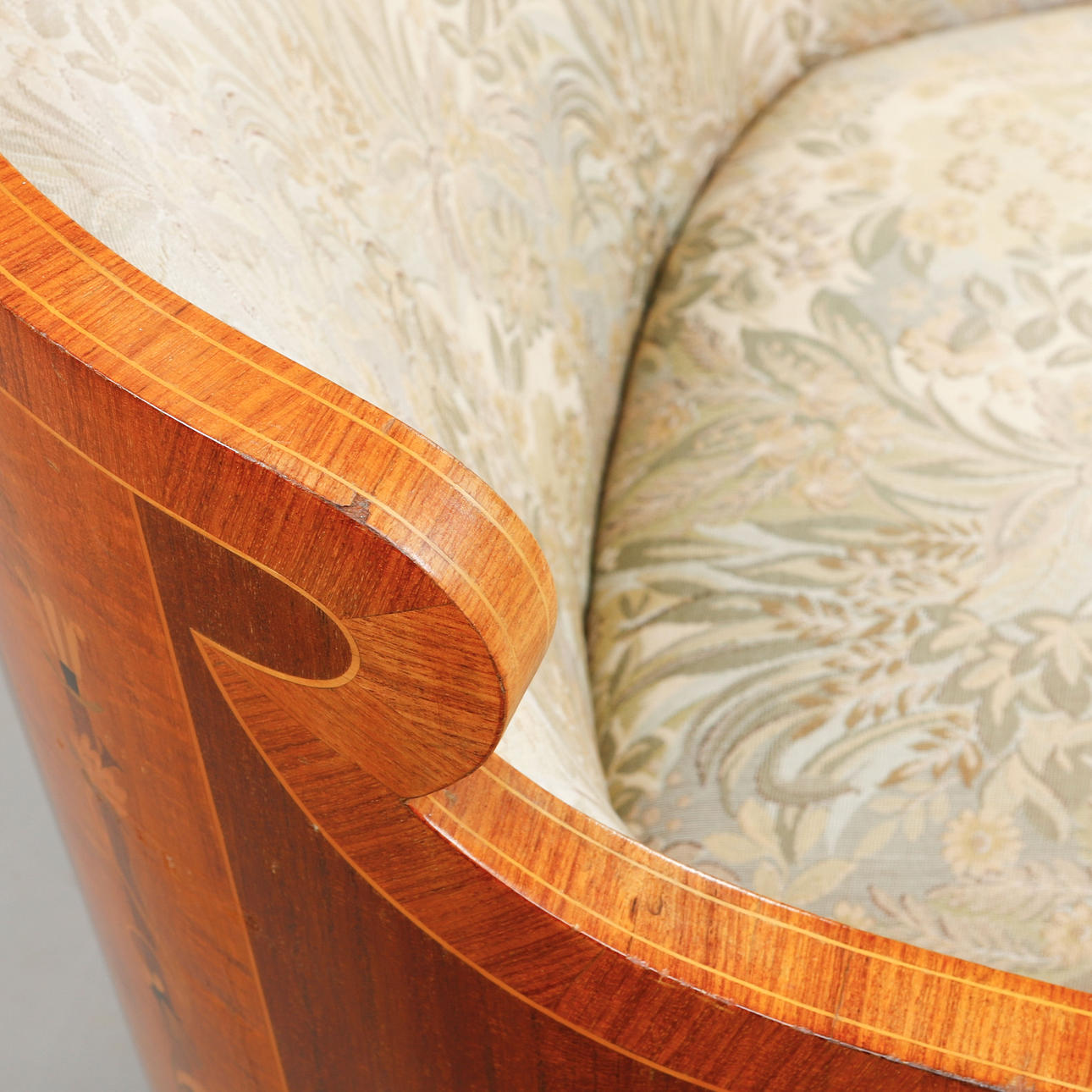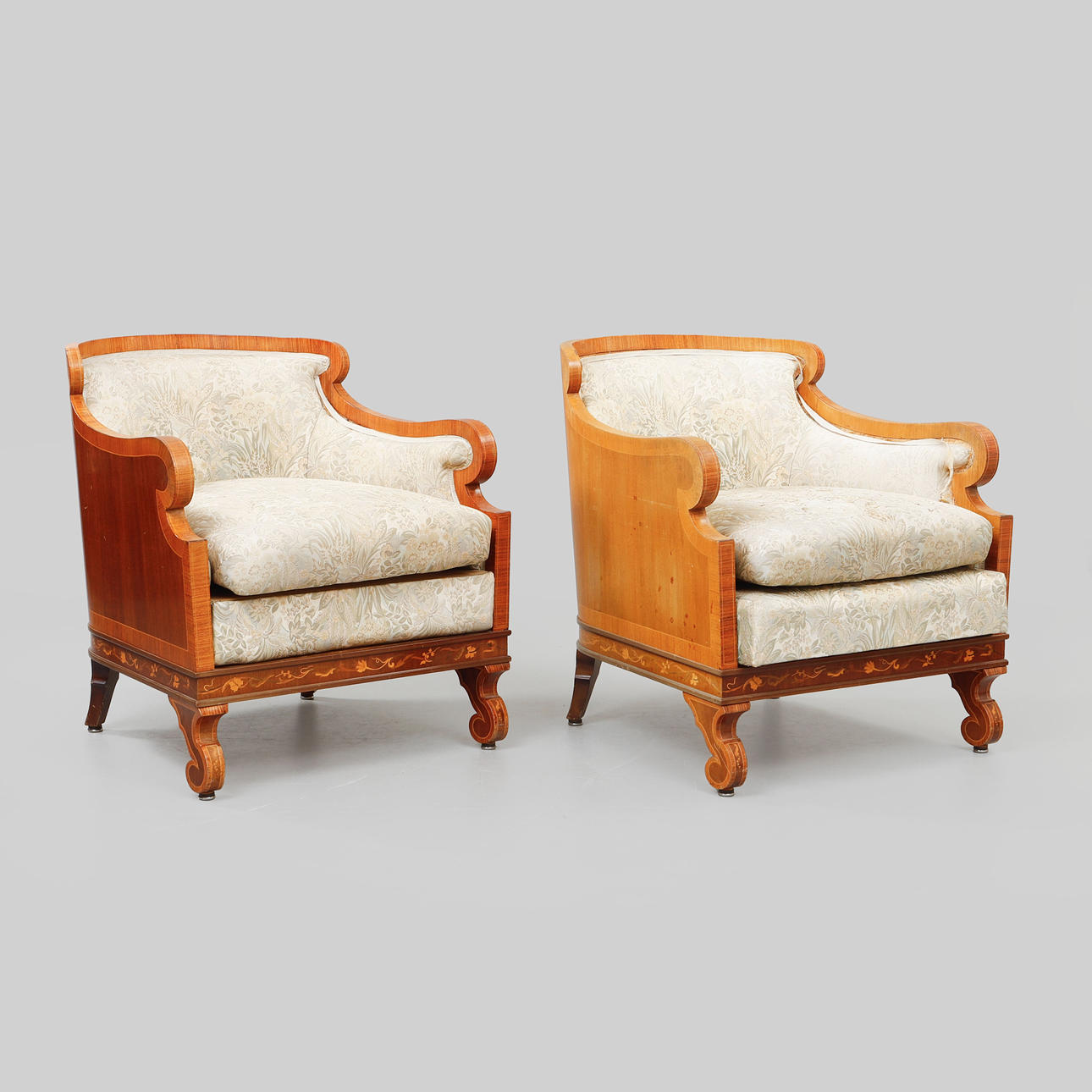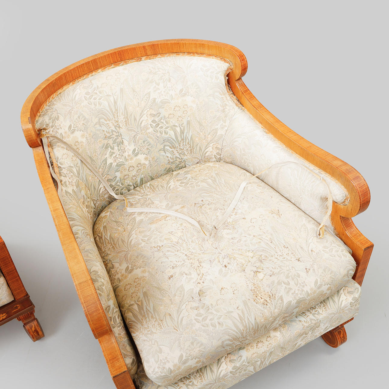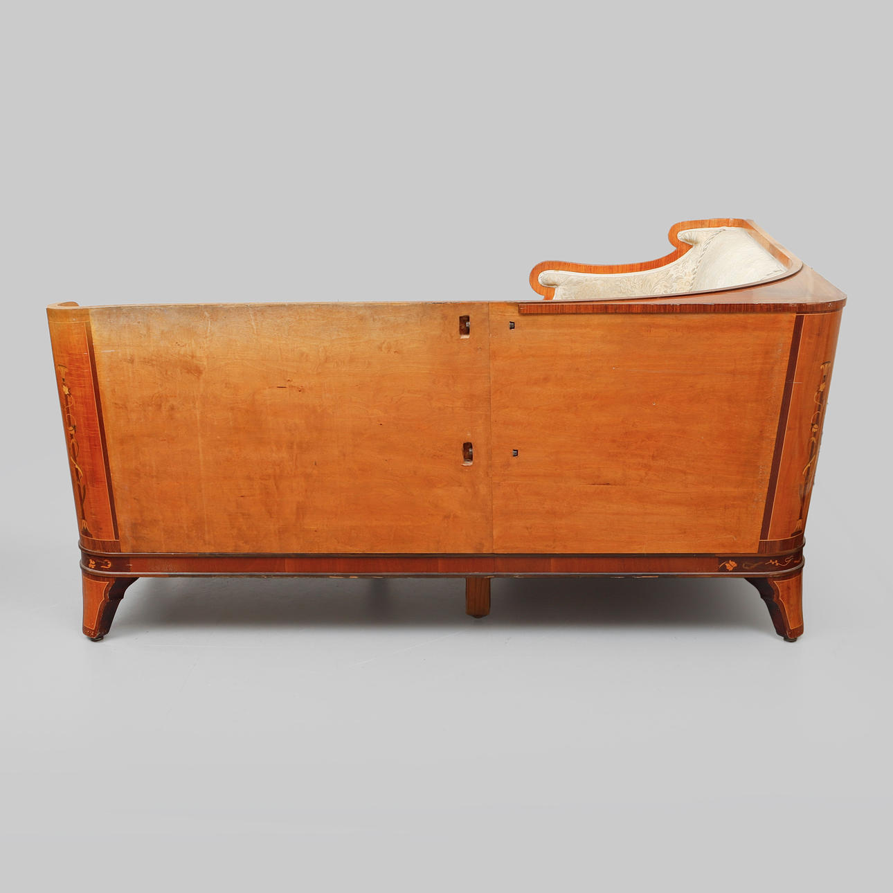 Different types of wood. Sofa seat height approx. 50 cm, back height approx. 82 cm, length ca 201 cm + 187 cm, depth approx. 85 cm. 2 armchairs seat height approx. 45 cm, back height approx. 79 cm, width approx. 70 cm, depth approx. 80 cm x 2. Table diameter approx. 100 cm, height approx. 71 cm.