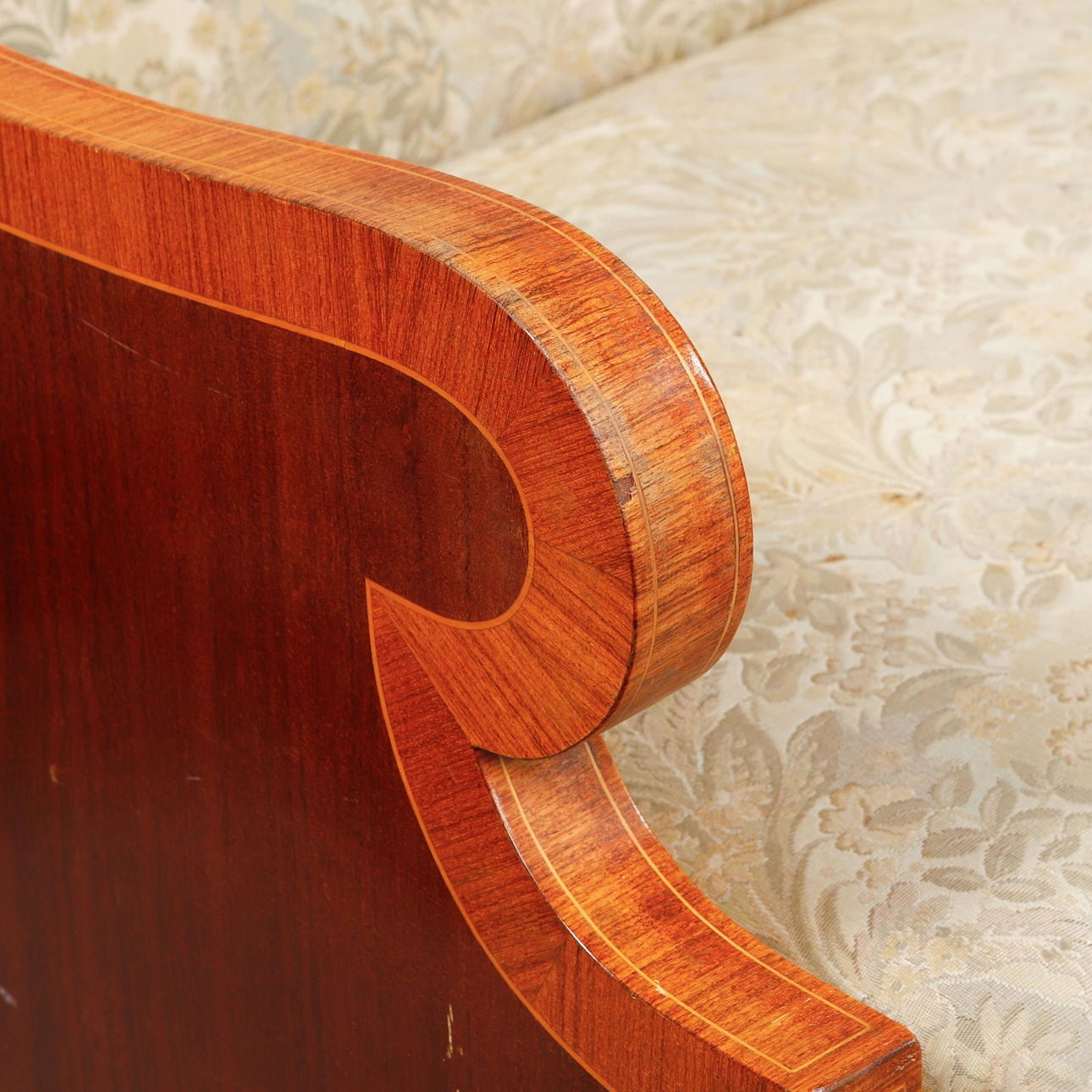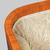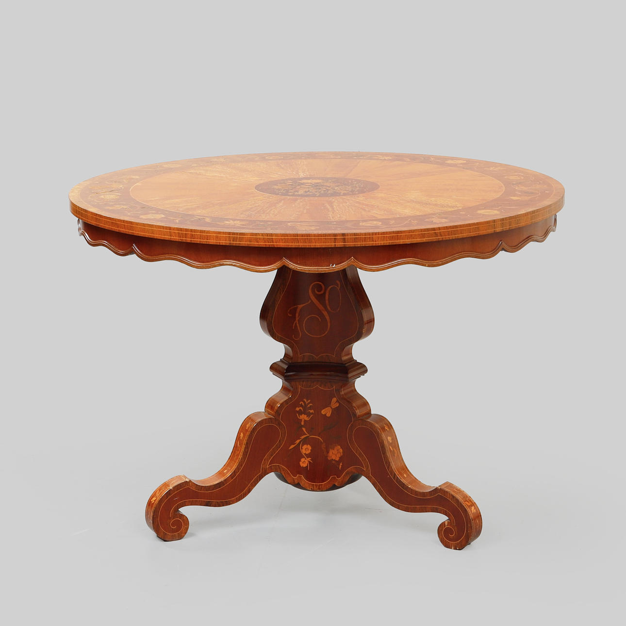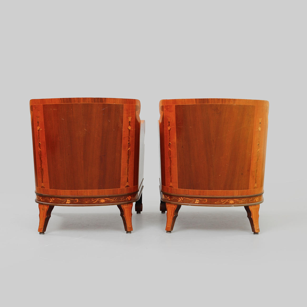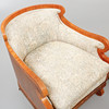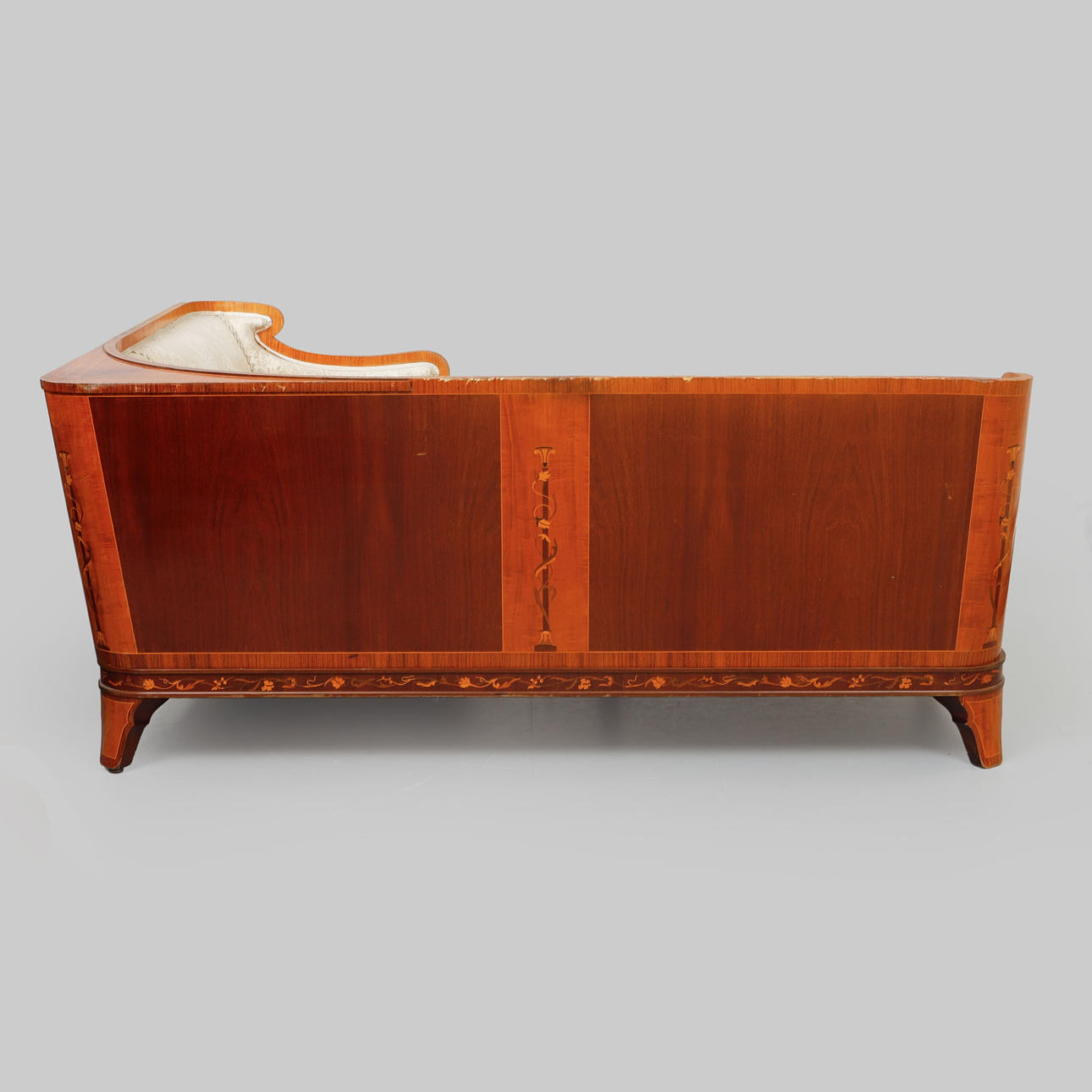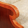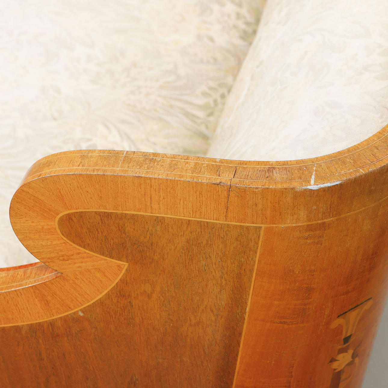 Different types of wood. Sofa seat height approx. 50 cm, back height approx. 82 cm, length ca 201 cm + 187 cm, depth approx. 85 cm. 2 armchairs seat height approx. 45 cm, back height approx. 79 cm, width approx. 70 cm, depth approx. 80 cm x 2. Table diameter approx. 100 cm, height approx. 71 cm.