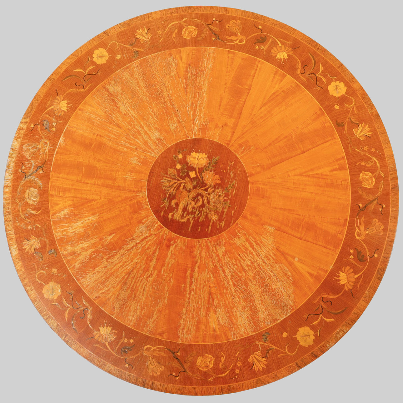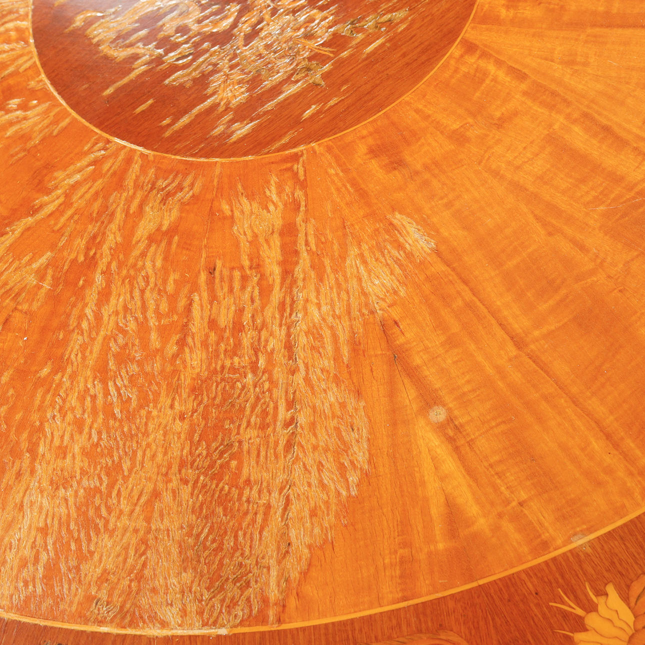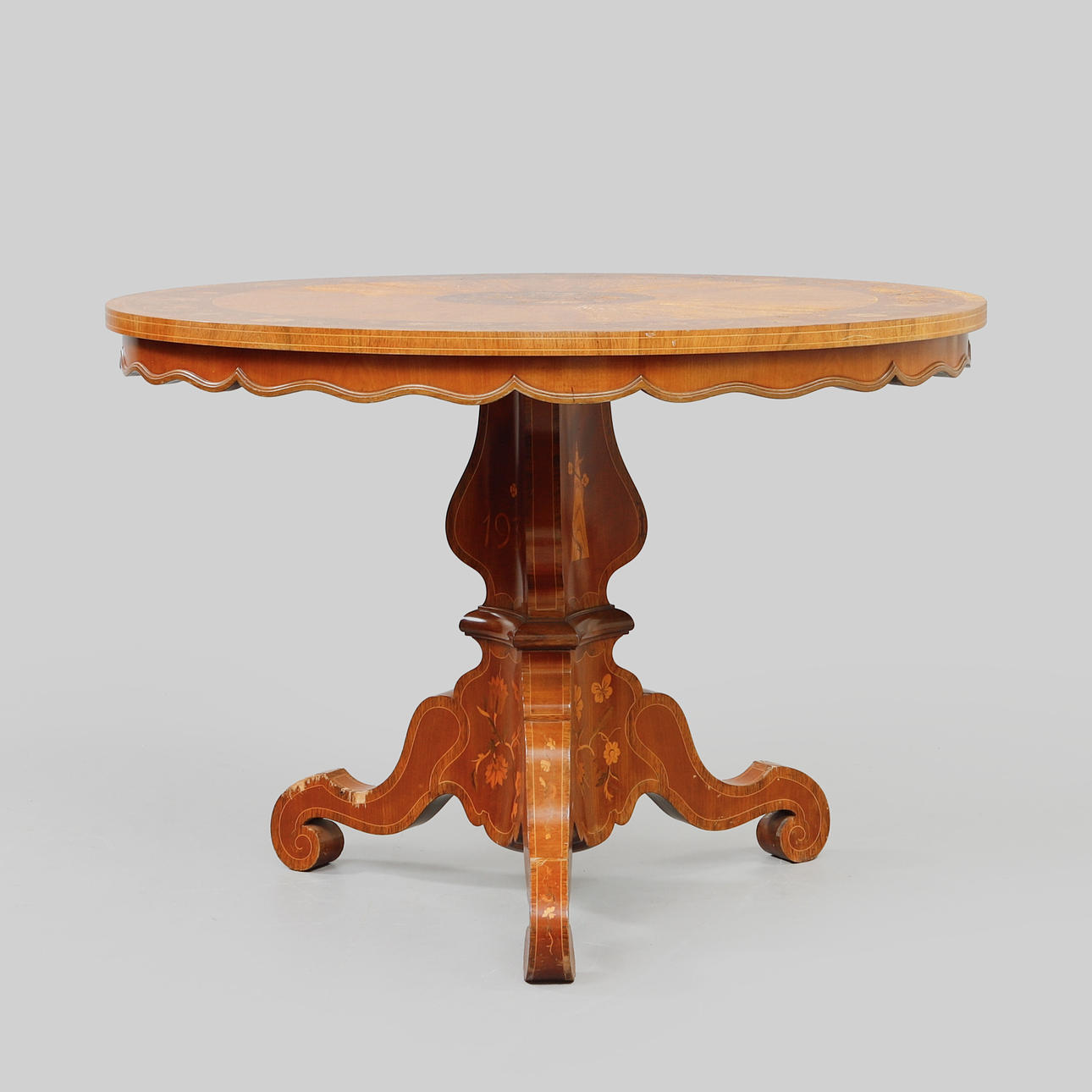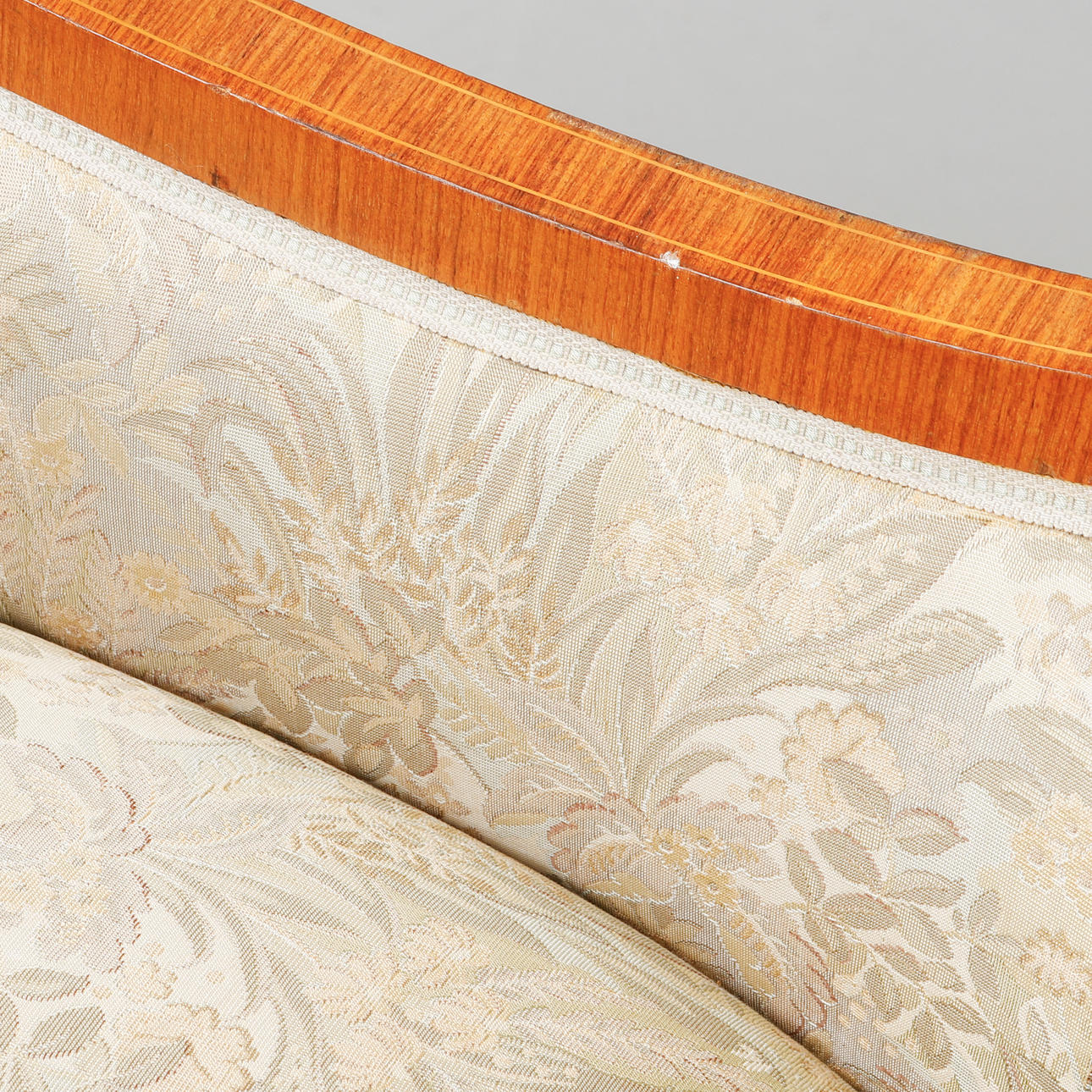 Different types of wood. Sofa seat height approx. 50 cm, back height approx. 82 cm, length ca 201 cm + 187 cm, depth approx. 85 cm. 2 armchairs seat height approx. 45 cm, back height approx. 79 cm, width approx. 70 cm, depth approx. 80 cm x 2. Table diameter approx. 100 cm, height approx. 71 cm.