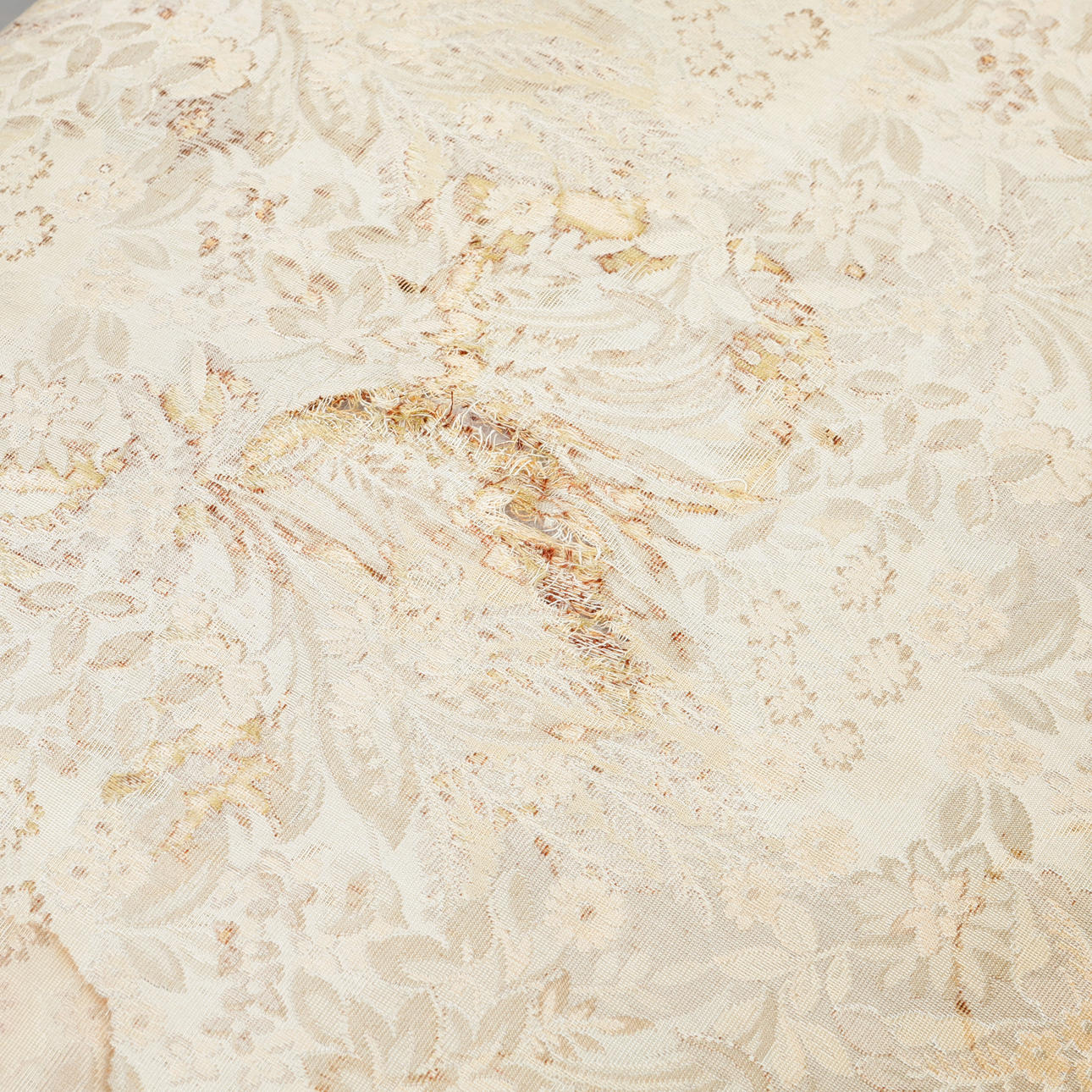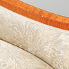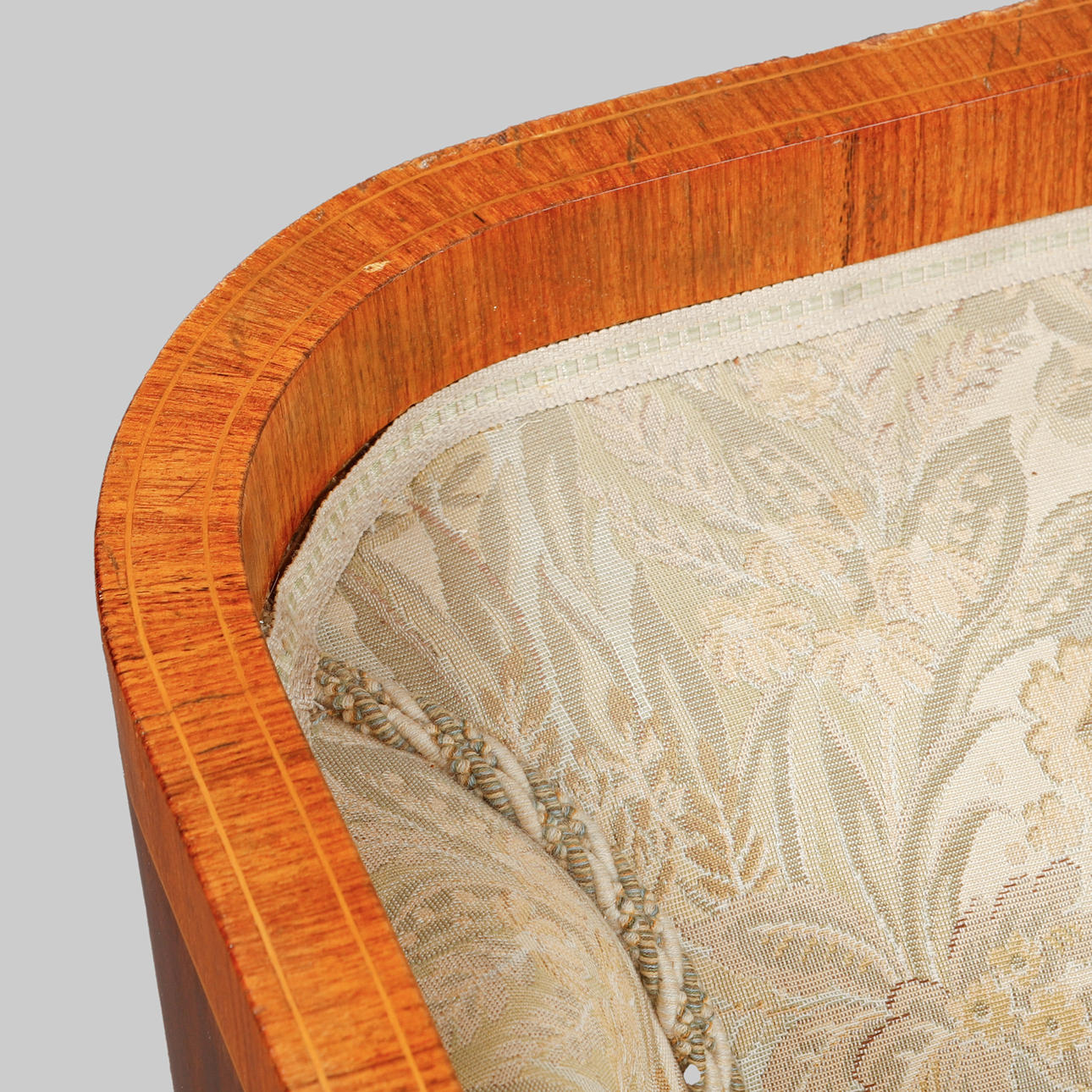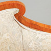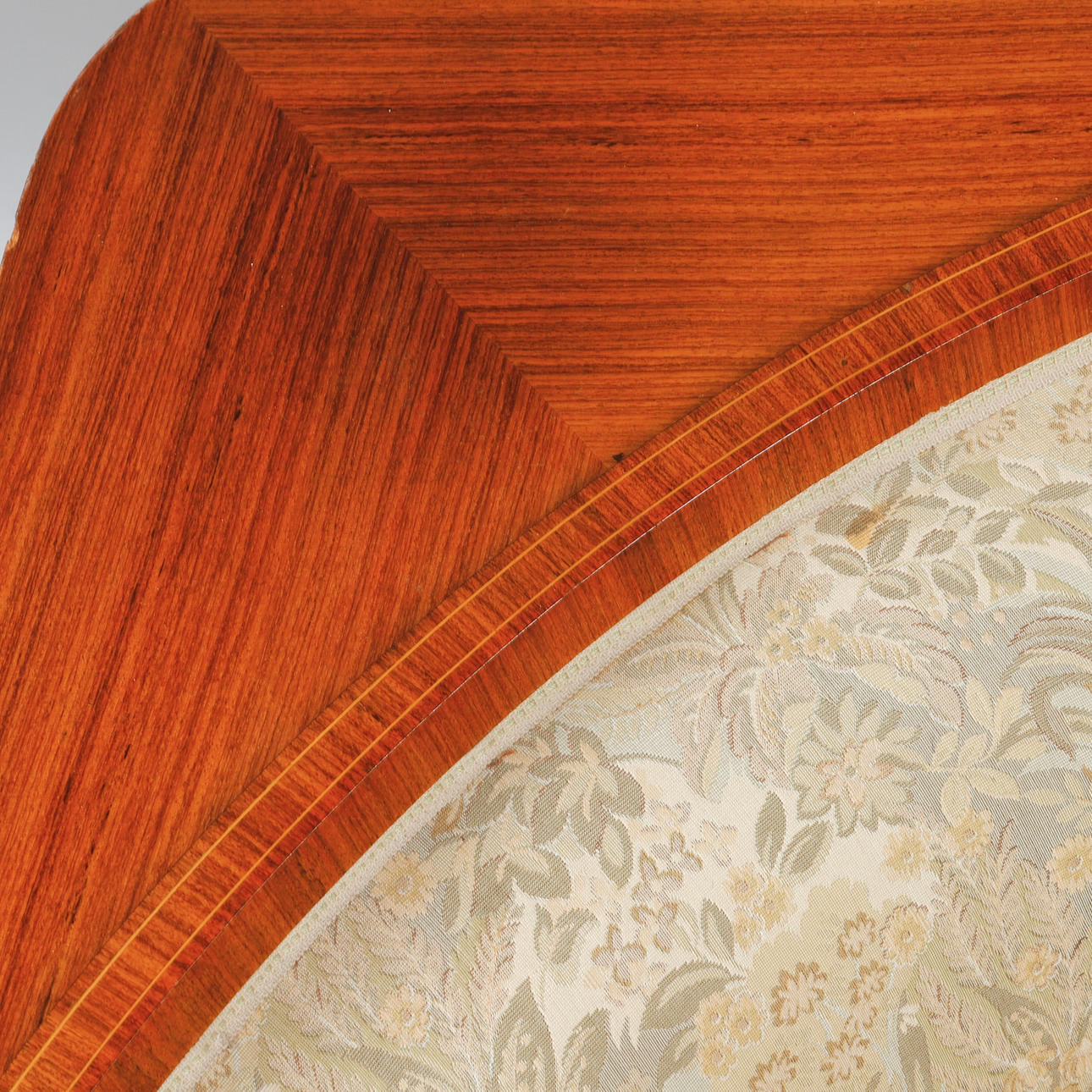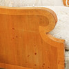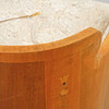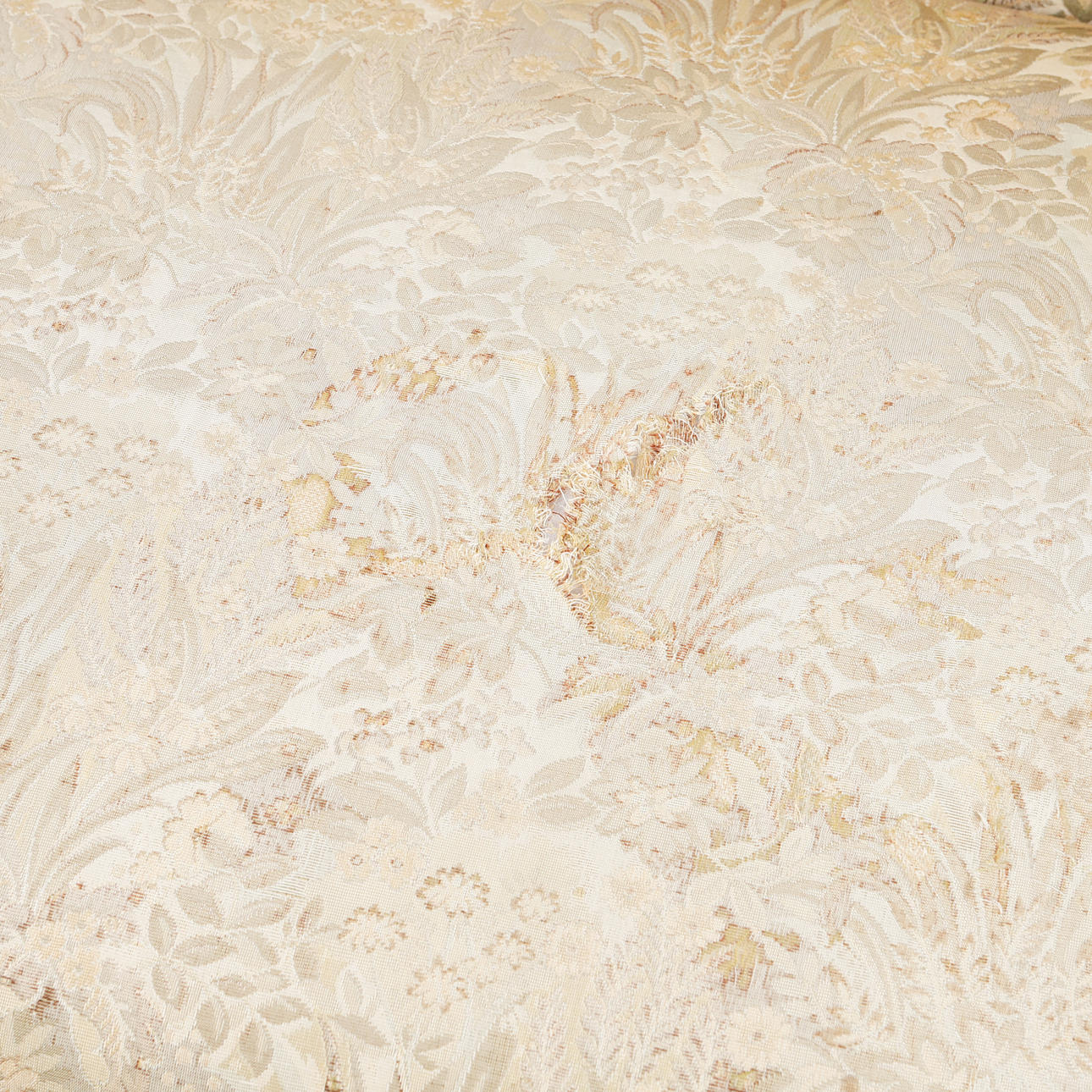 Different types of wood. Sofa seat height approx. 50 cm, back height approx. 82 cm, length ca 201 cm + 187 cm, depth approx. 85 cm. 2 armchairs seat height approx. 45 cm, back height approx. 79 cm, width approx. 70 cm, depth approx. 80 cm x 2. Table diameter approx. 100 cm, height approx. 71 cm.