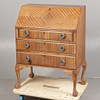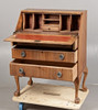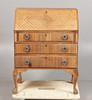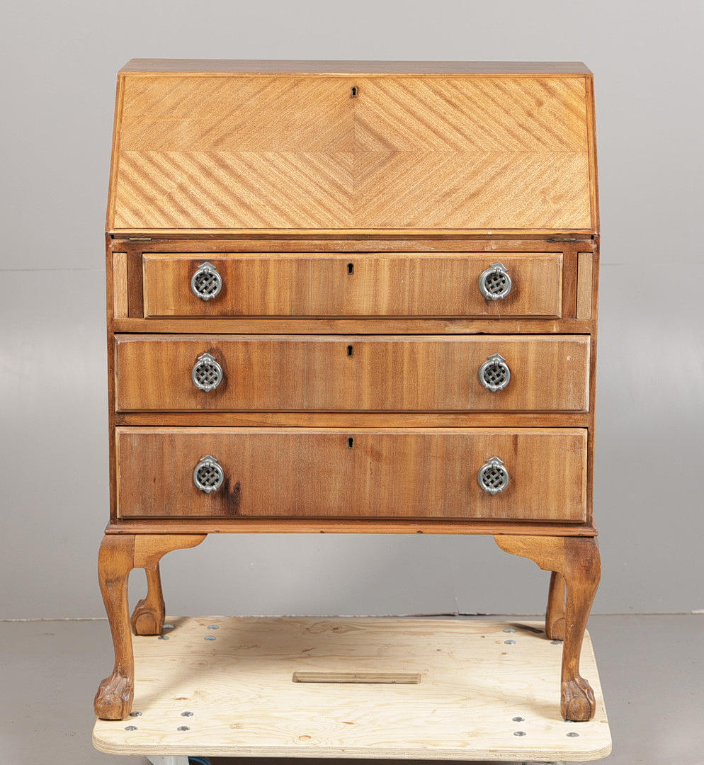 Having a sloping fall with a fitted interior, the front with three long drawers, raised on cabriole legs with ball and claw feet, 99cm high 74cm wide.