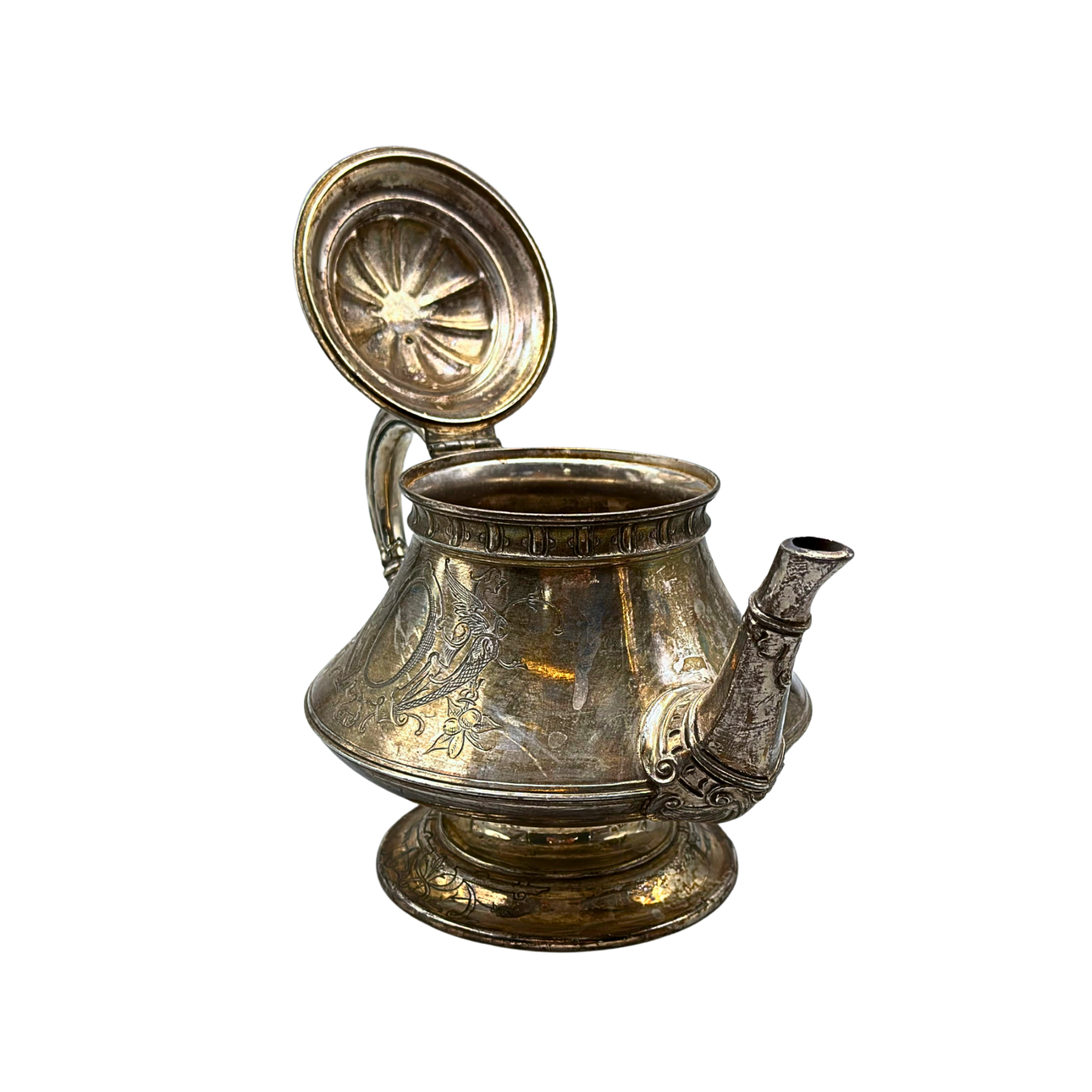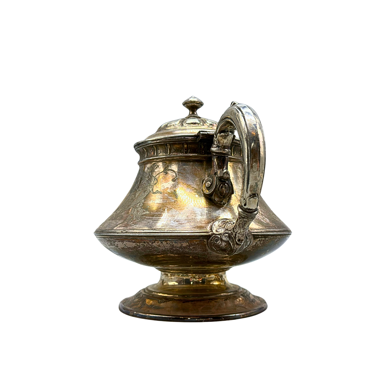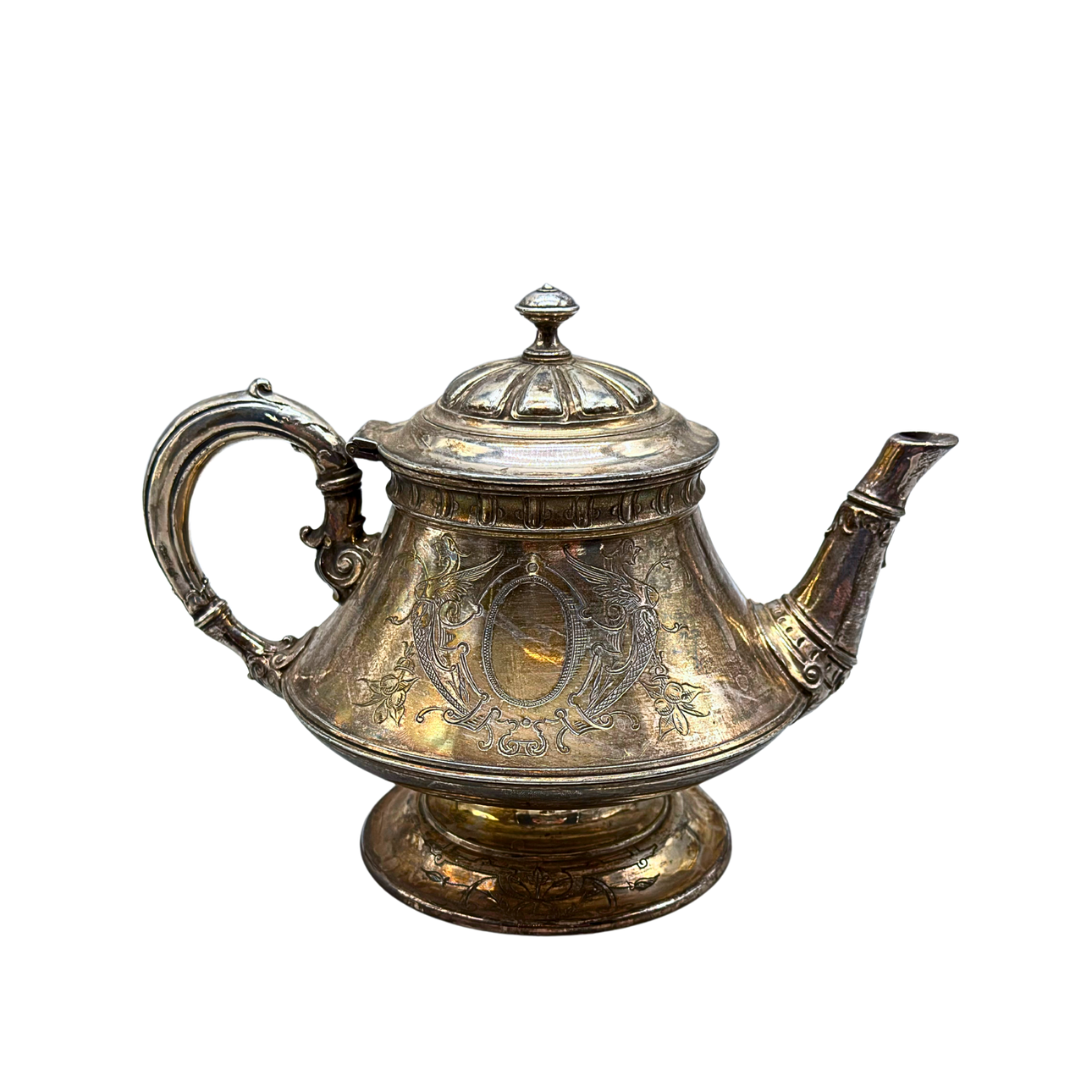 A Victorian teapot by Maple & Co. from the late 19th century. The pot is silver-plated and hallmarked multiple times on the underside.