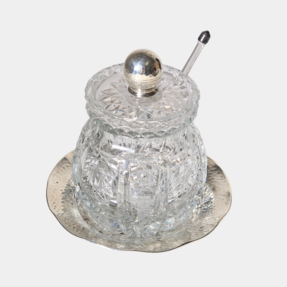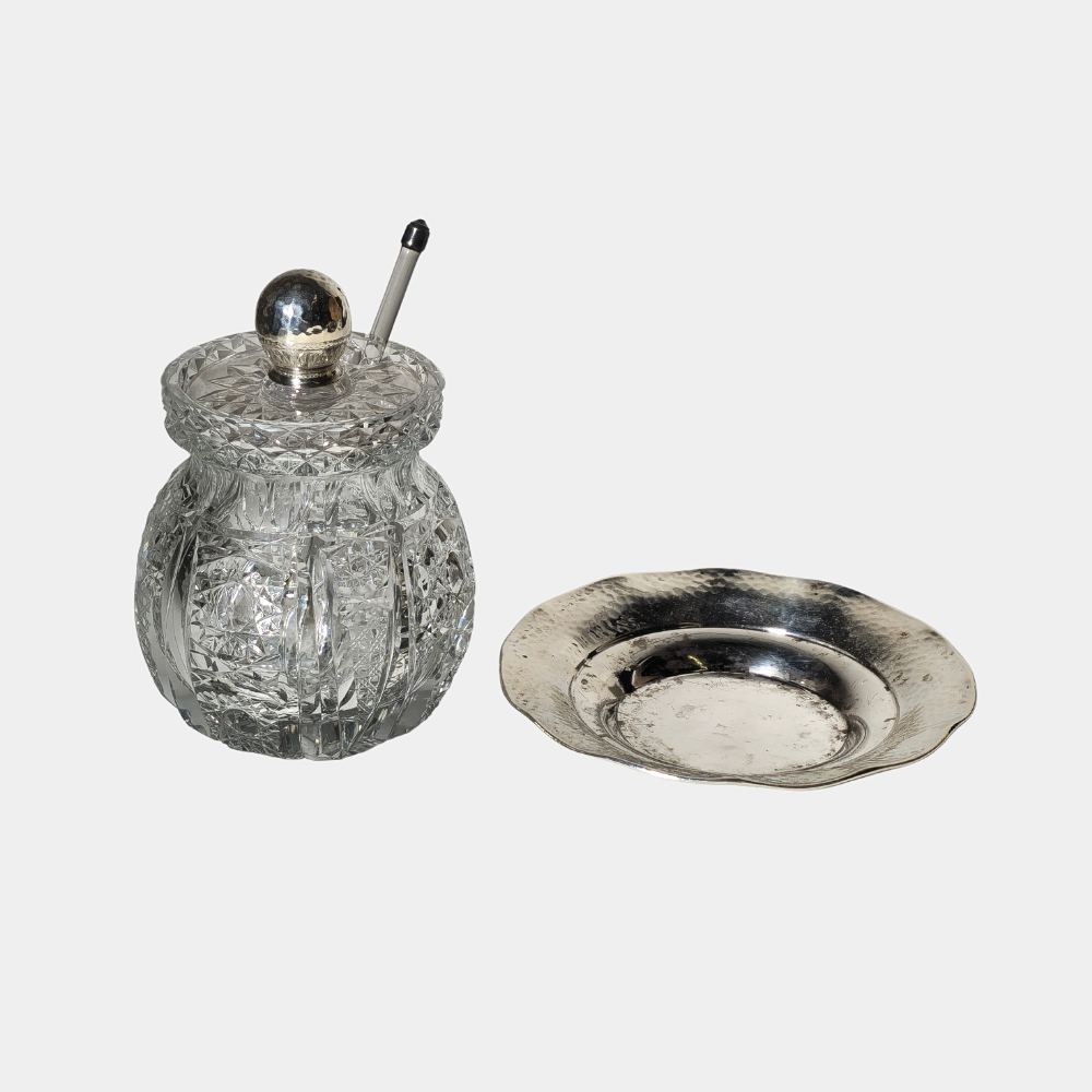 GLASS MUSTARD WITH PUNCHED SILVER PLATE.