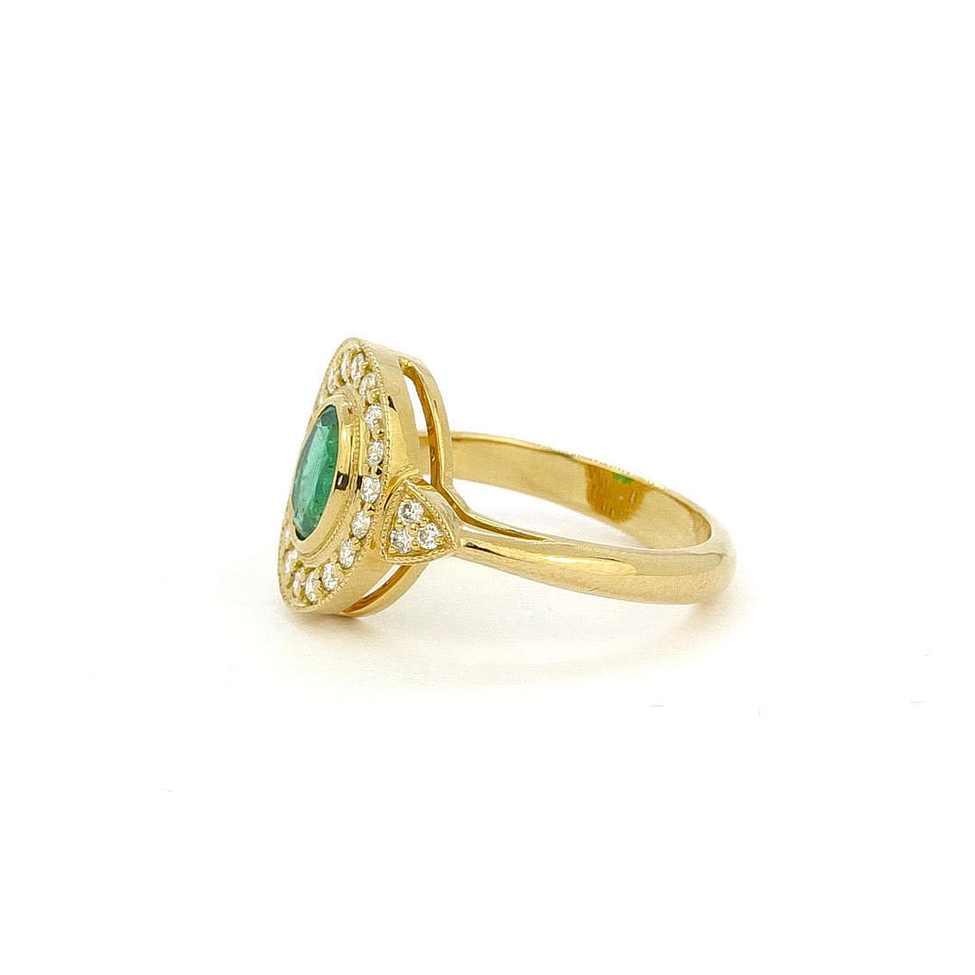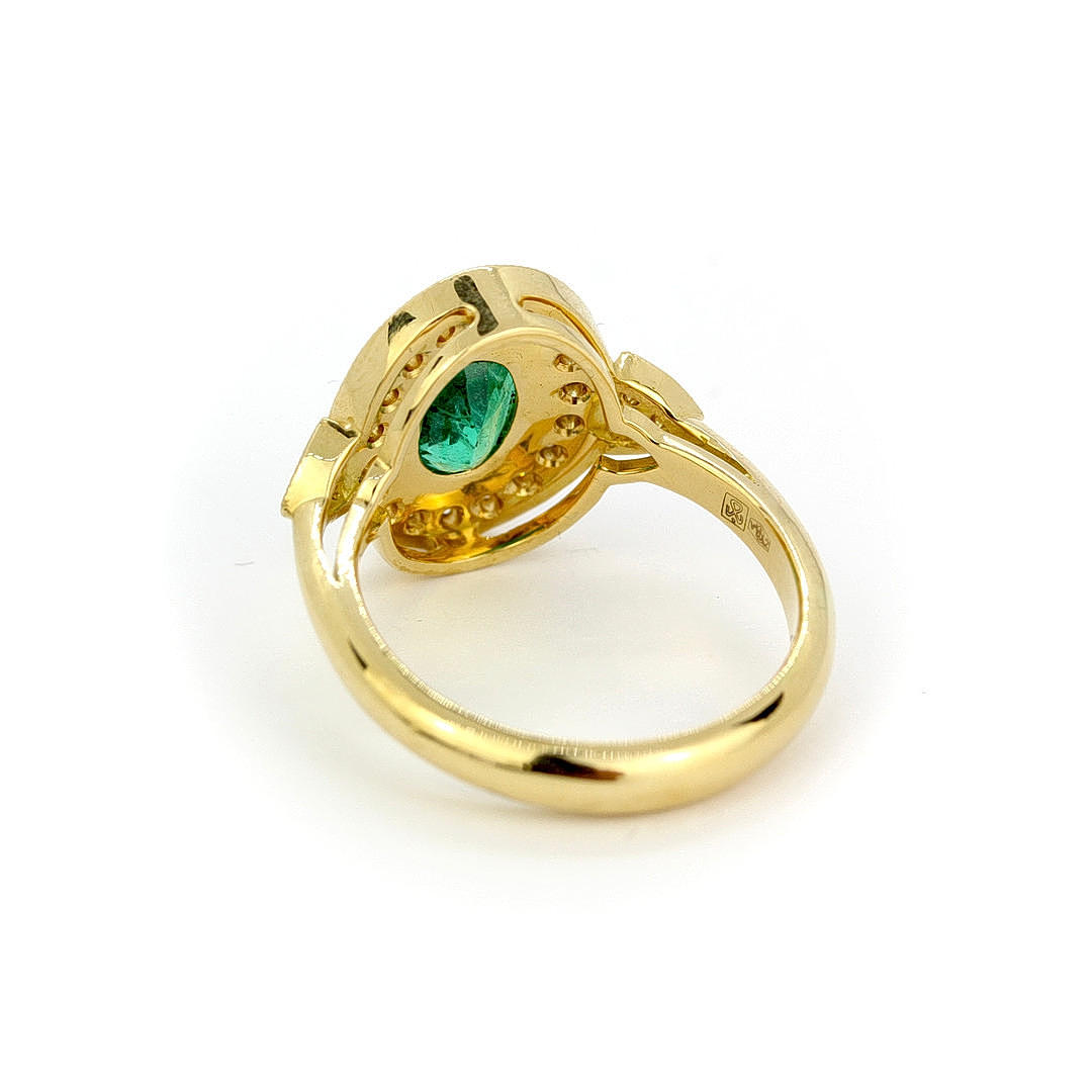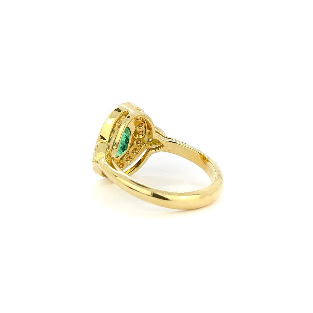 An 18ct yellow gold ring set with large emerald (1,29ct IGI certified) surrounded by eighteen diamonds with additional six on the shoulders. (approx. 0.45ct total, D-H, VS). Ring total weight: 8.14g Uk ring size: O,5.