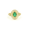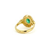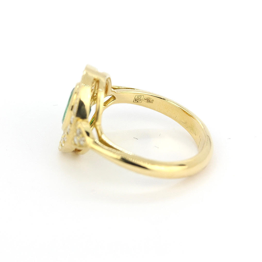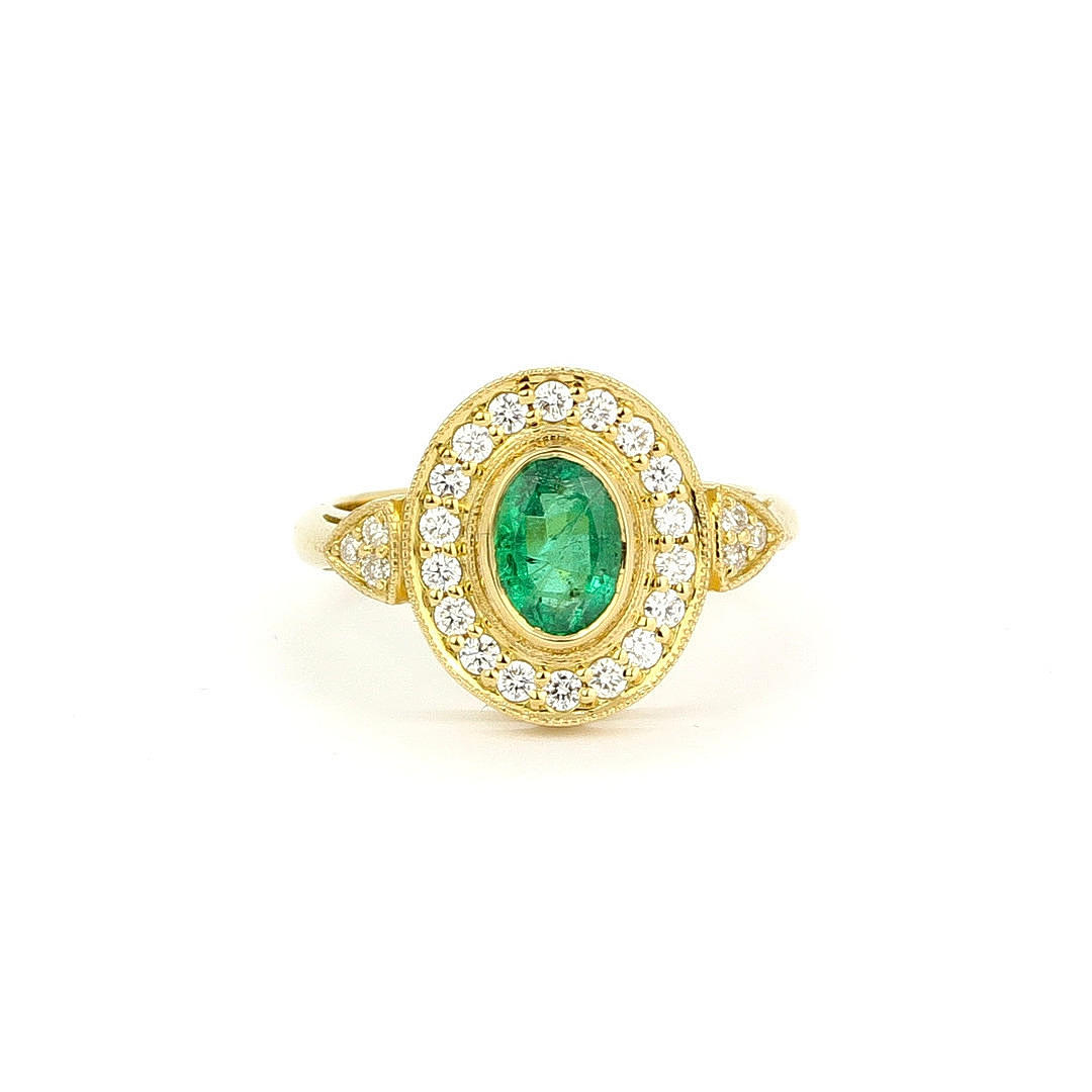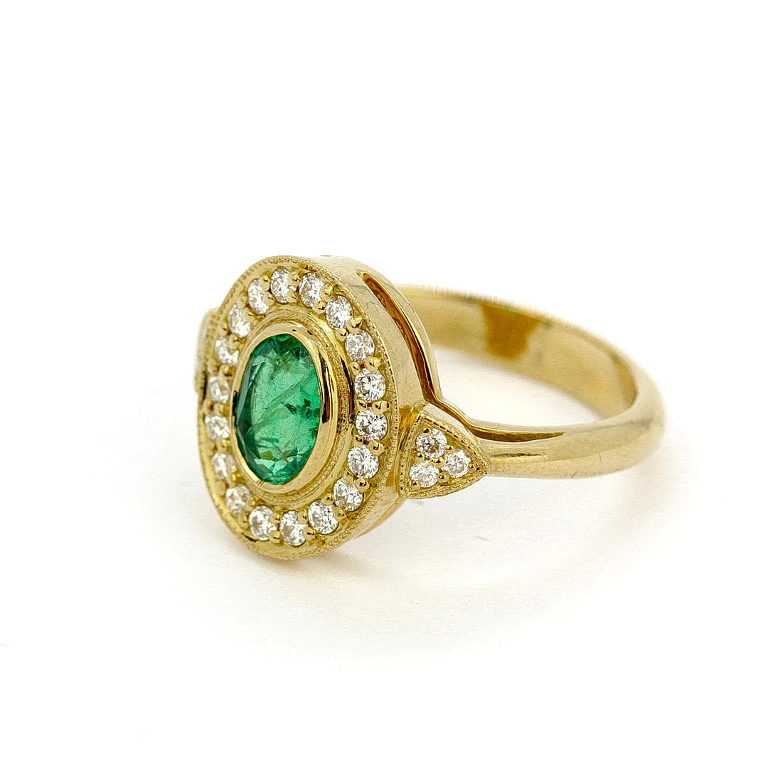 An 18ct yellow gold ring set with large emerald (1,29ct IGI certified) surrounded by eighteen diamonds with additional six on the shoulders. (approx. 0.45ct total, D-H, VS). Ring total weight: 8.14g Uk ring size: O,5.