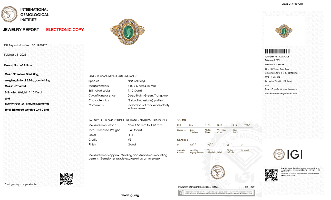 Emerald IGI certificate included. Overall IGI ring certificate included. Continental Hallmarks. Brand new custom made ring/ Newer used.