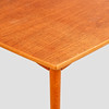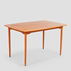 Teak veneer. 2 insert discs. Brass shod legs made of beech. Length approx. 120 + 38x2 cm, width approx. 85 cm, height approx. 74 cm.