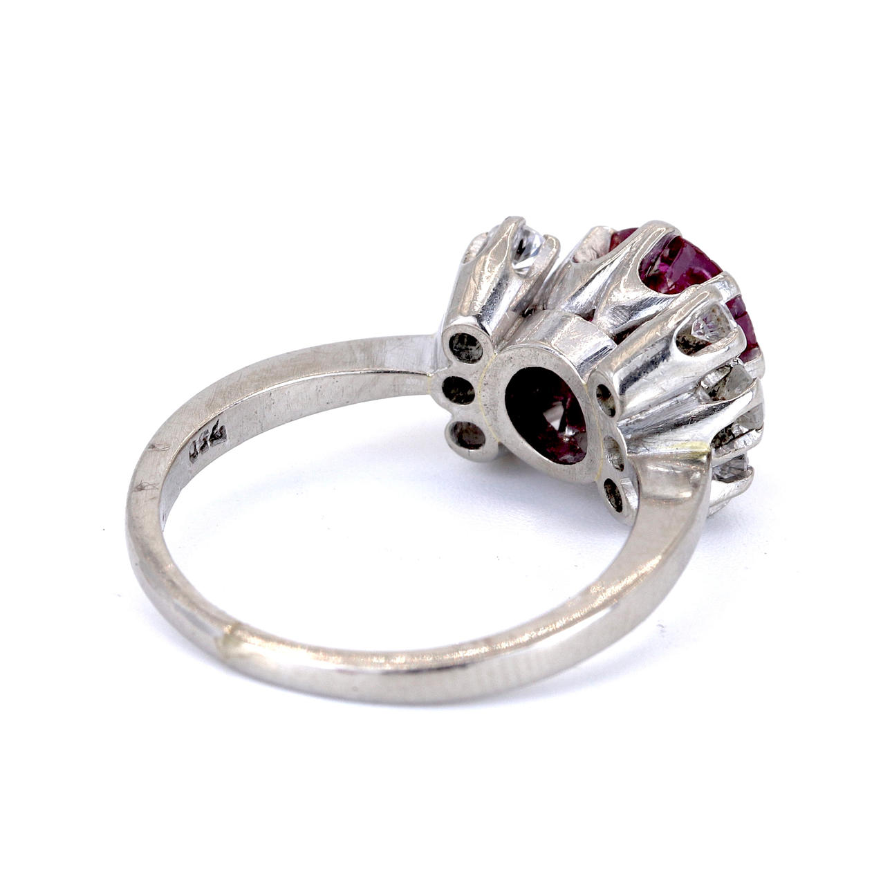 4923646. ANTIQUE 18CT WHITE GOLD RUBY & DIAMOND SET RING.
