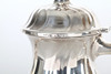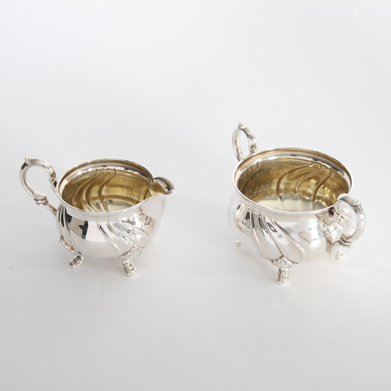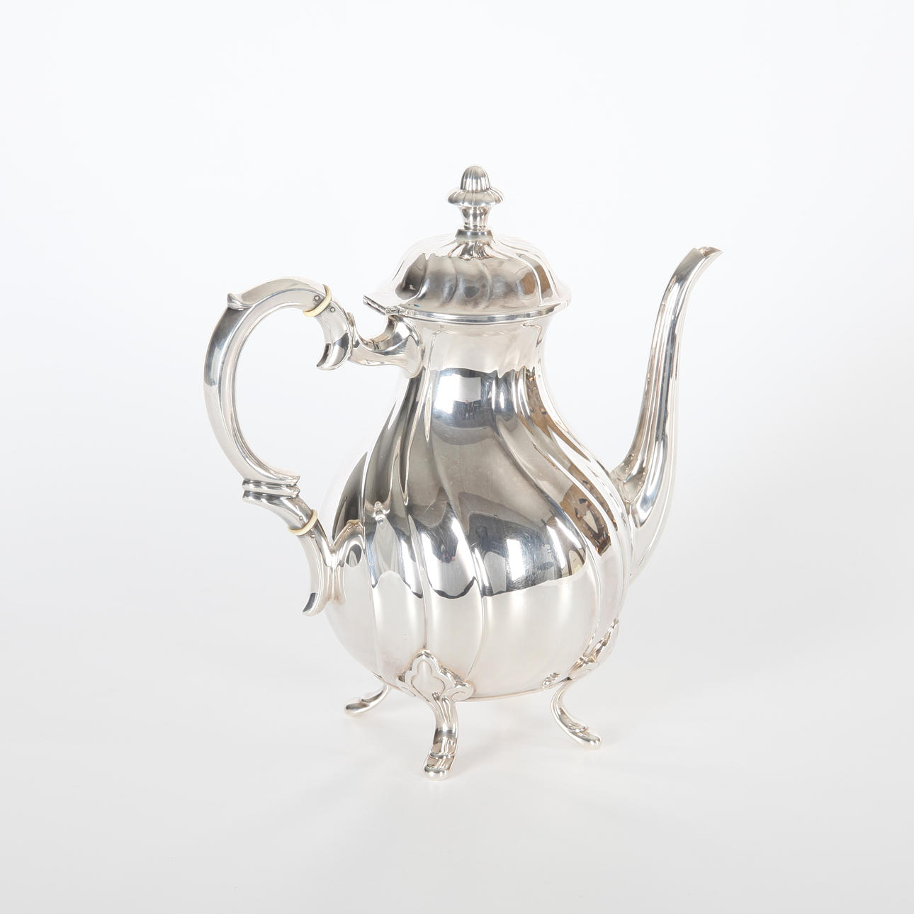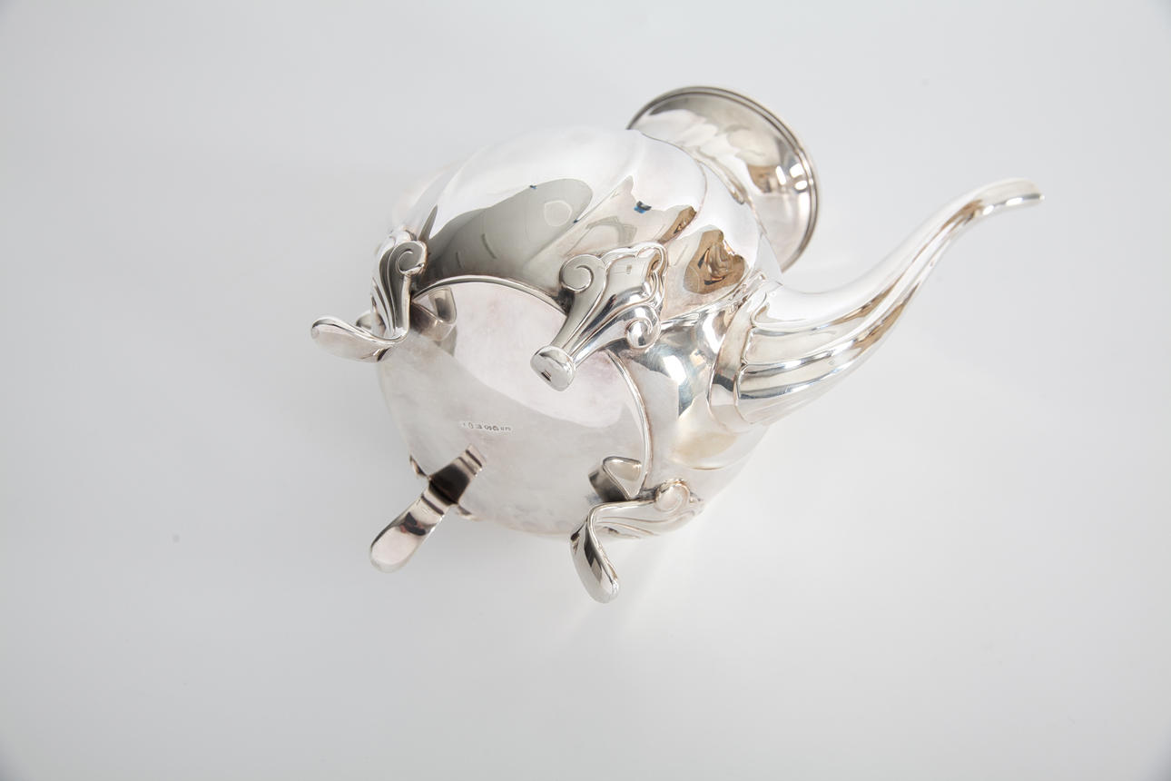 Coffee set in silver, well-crowned decor, legs in leaf shape, sugar bowl and cream jug with gilded inside. Coffee pot hanger with details in legs.