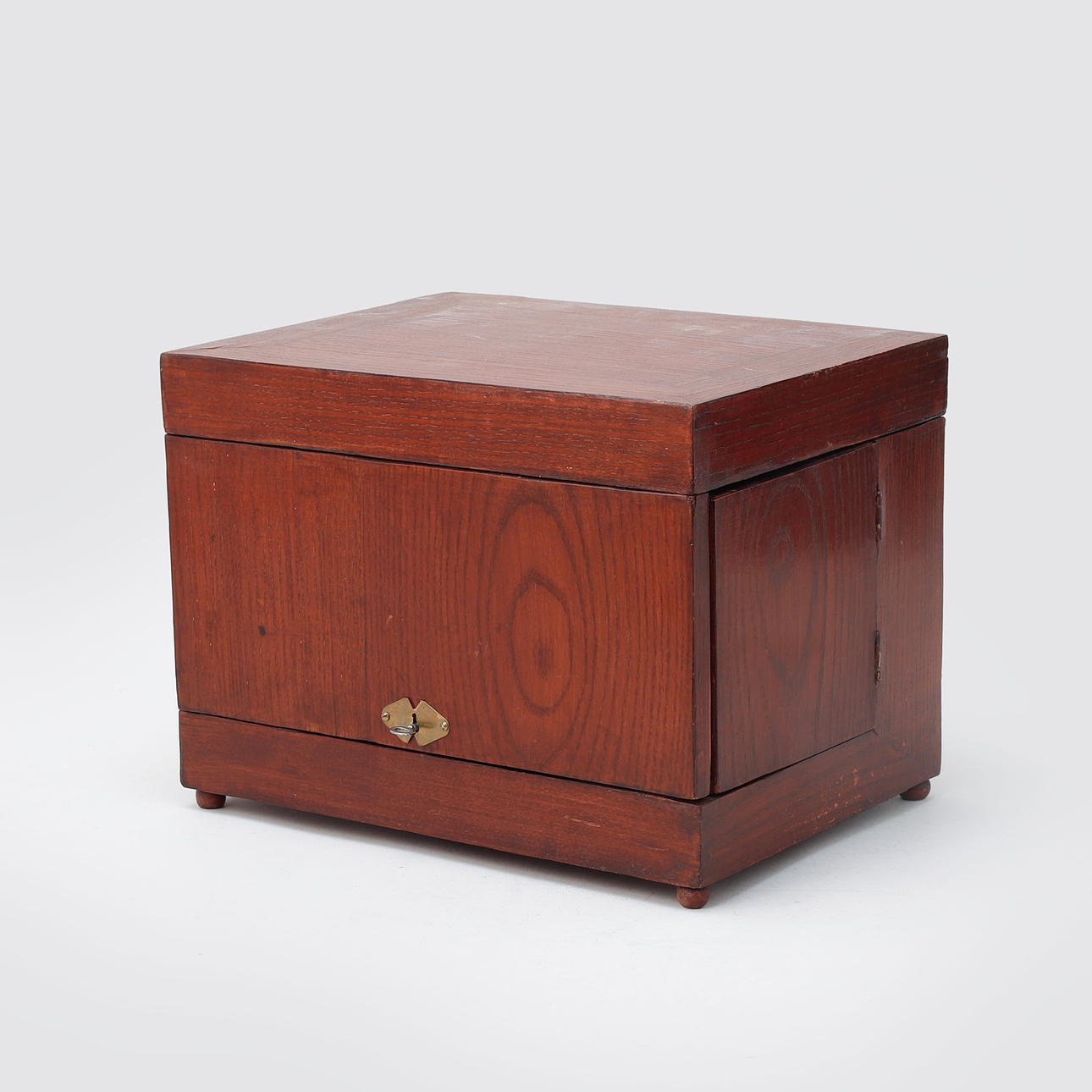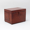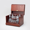 Shatull with foldable cover and sides, inside with loose stand. Four liqueur decanters and 16 liqueur glasses. Shatullet dimensions approx. 34 x 25 x 25 cm.