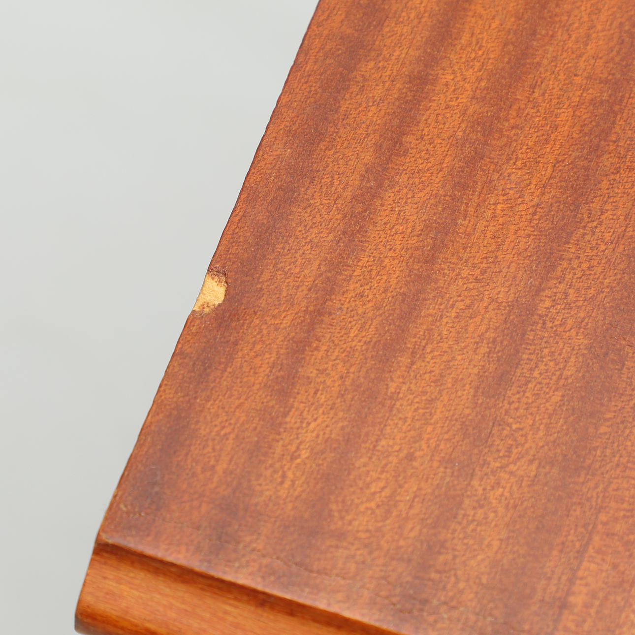 Veneered with mahogany. Pull-out drawer and bottom shelf. Canneled legs of stained beech. Width 50, depth 35, height 55 cm.