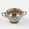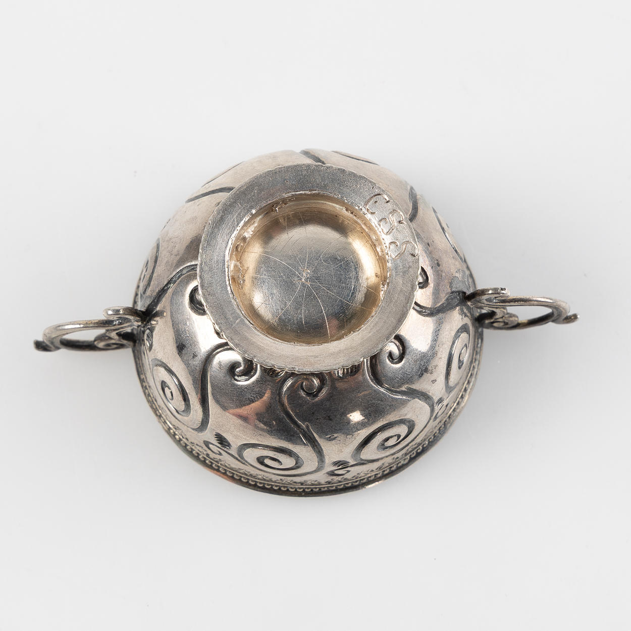 Inside traces of gilding. Marked on footring ESS. Height approx. 4 cm, diameter exl hangers 6 cm. Weight about 41 grams.