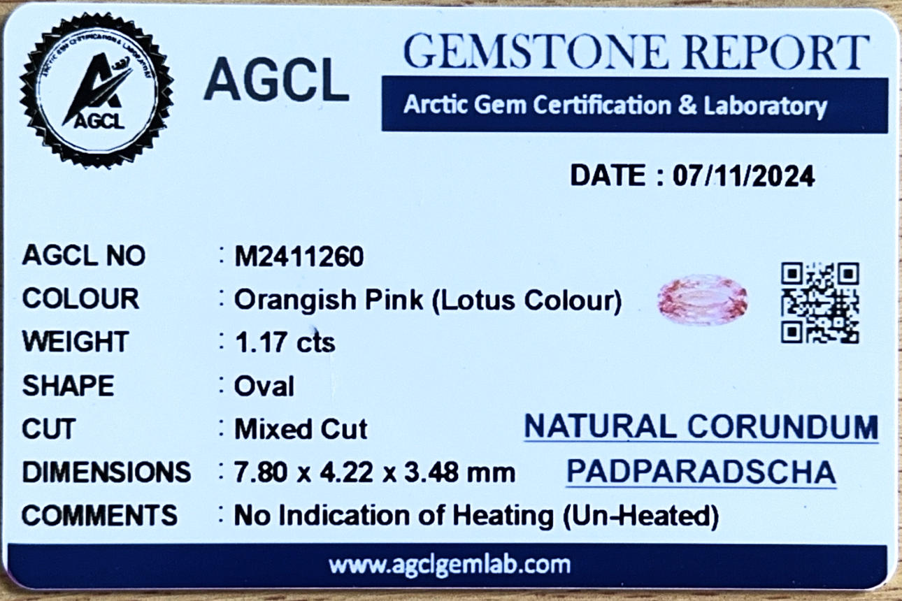 An unmounted natural unheated oval cut padparadcha sapphire. Weight: 1,17ct.