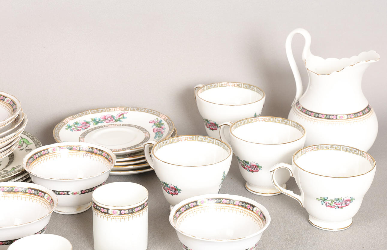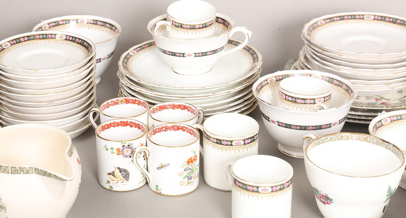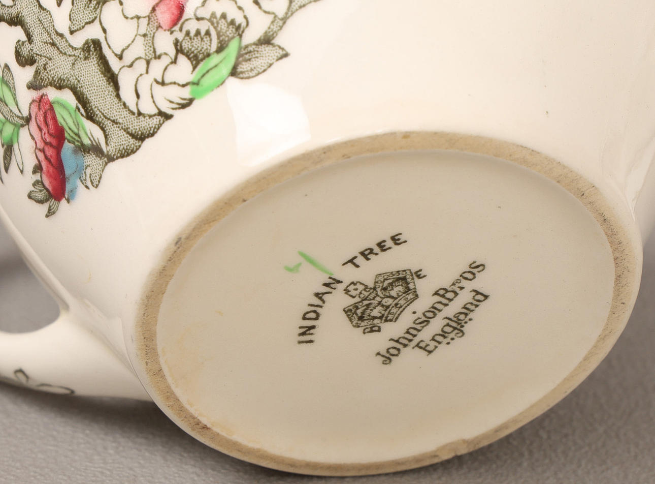 To include Plant pattern plates, saucers, cups, and a jug which measures 14cm height, together with various Johnson Bros. Indian Tree and Duchess examples. (qty).