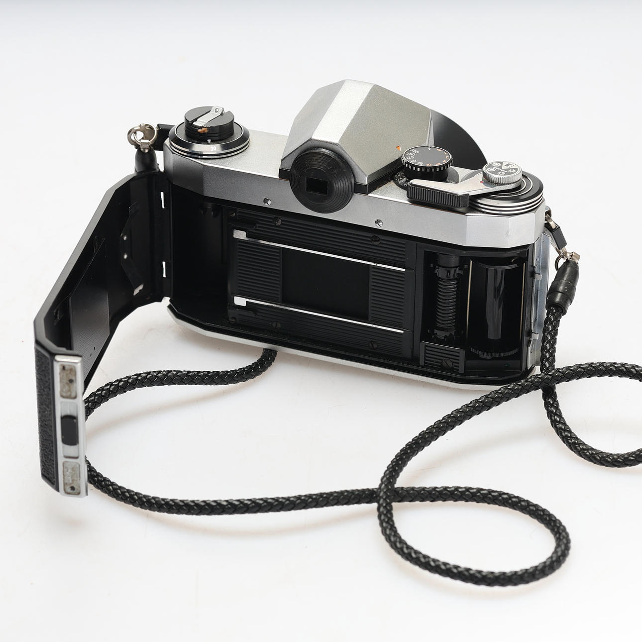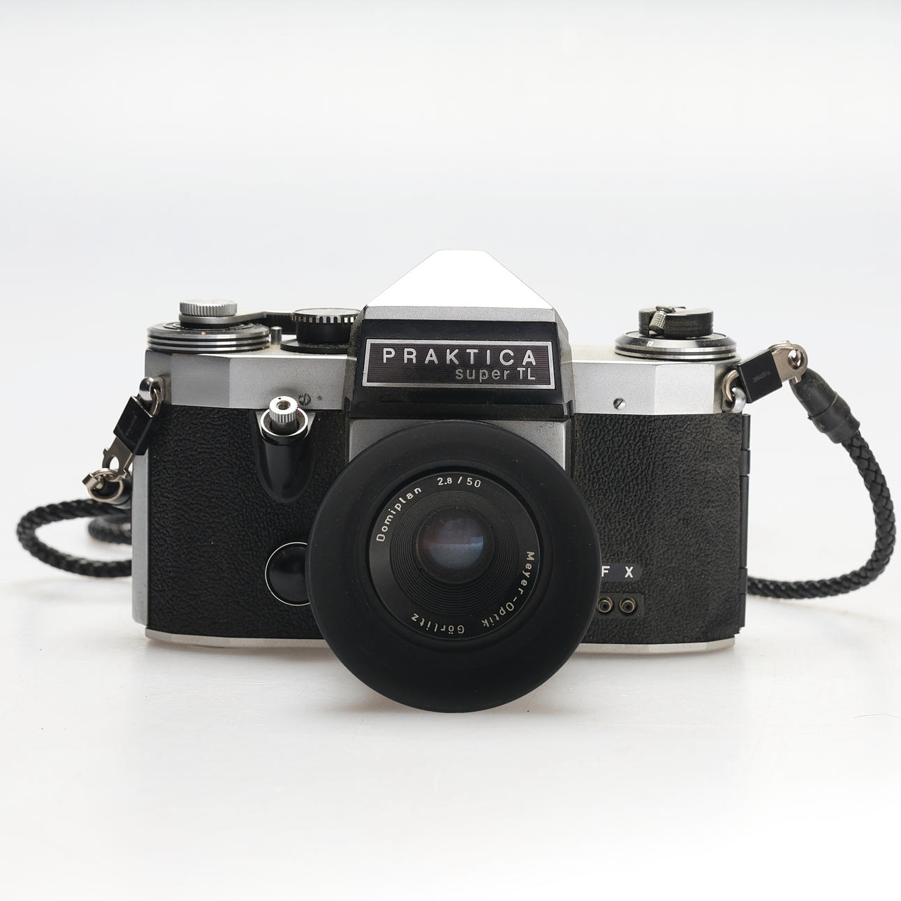 Camera Practica Super TL, analog 35mm SLR camera. Meyer Optik Görlitz-Domiplan 50mm f2.8 lens. (Lens hood Olymnpus)