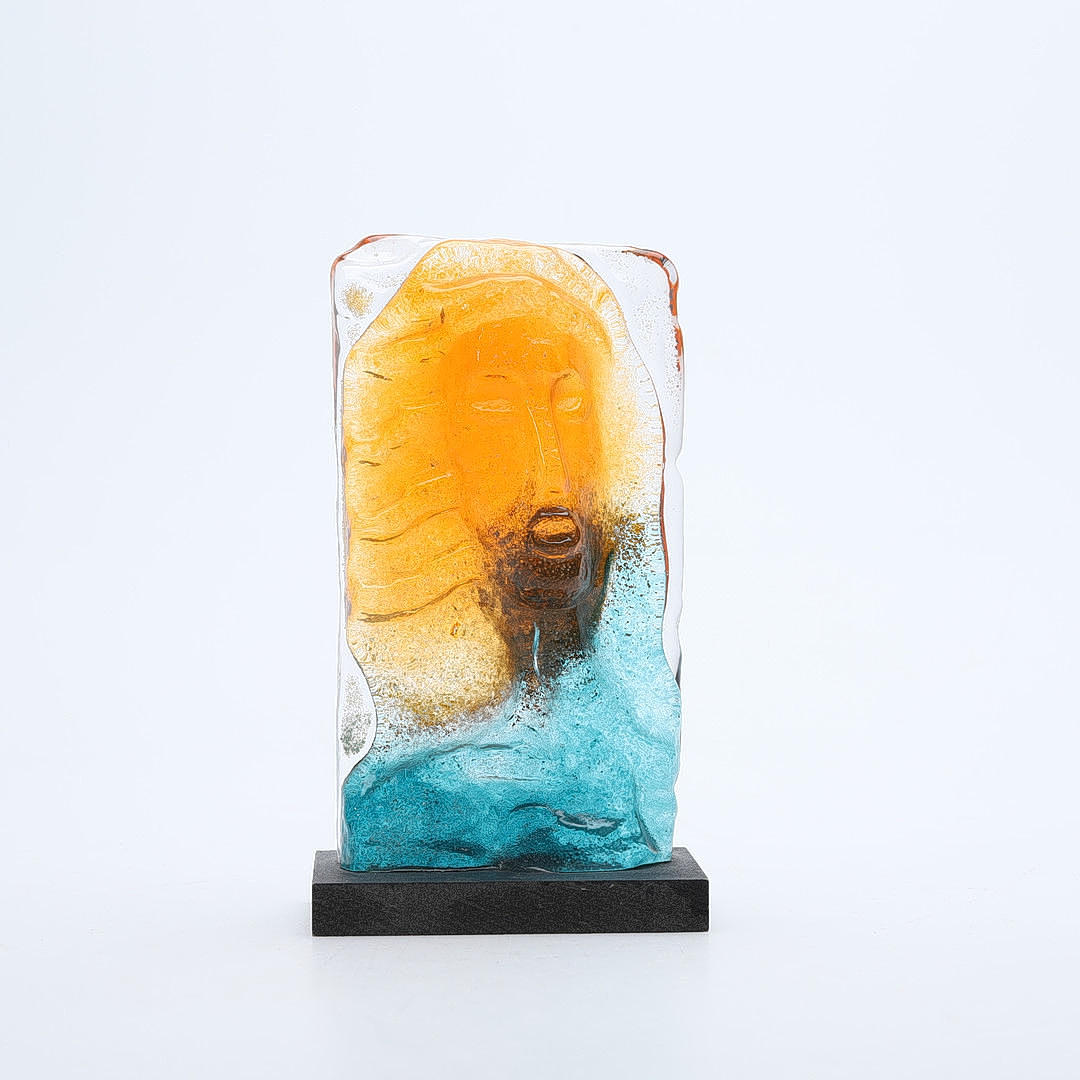 Sandcast glass mounted on plinth.