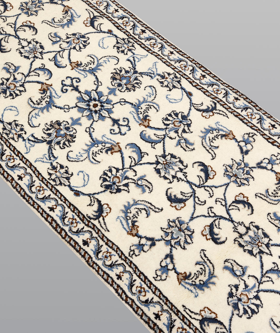 Nain gallery model with bright base color and decor of floral ornaments, palmettes and arabesques in blue and beige tones. The border has bright bottom and floral decor in matching color scheme. The forelock is made of wool and the warp is of cotton.