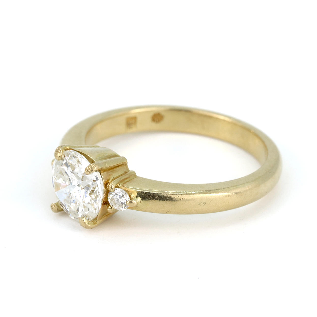 An 18ct yellow gold solitaire ring set with round brilliant cut diamond and diamond to the sides Dia. 1.1ct approx. Colour: G. Clarity SI.