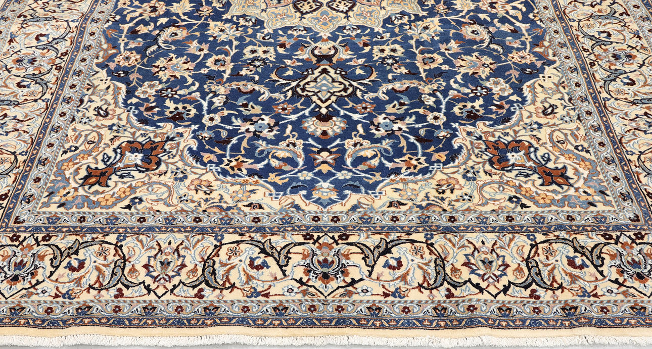 Blue base and a centrally placed medallion in light blue and elements of darker shades.The center field is decorated with corner ornaments as well as floral ornaments, palmettes and arabesques in similar colors. The border has a light base decorated with palmette branches and narrower side borders that frame the whole. The bangs are made of wool with elements of silk and the warp is made of cotton, approx. 292x202 cm.