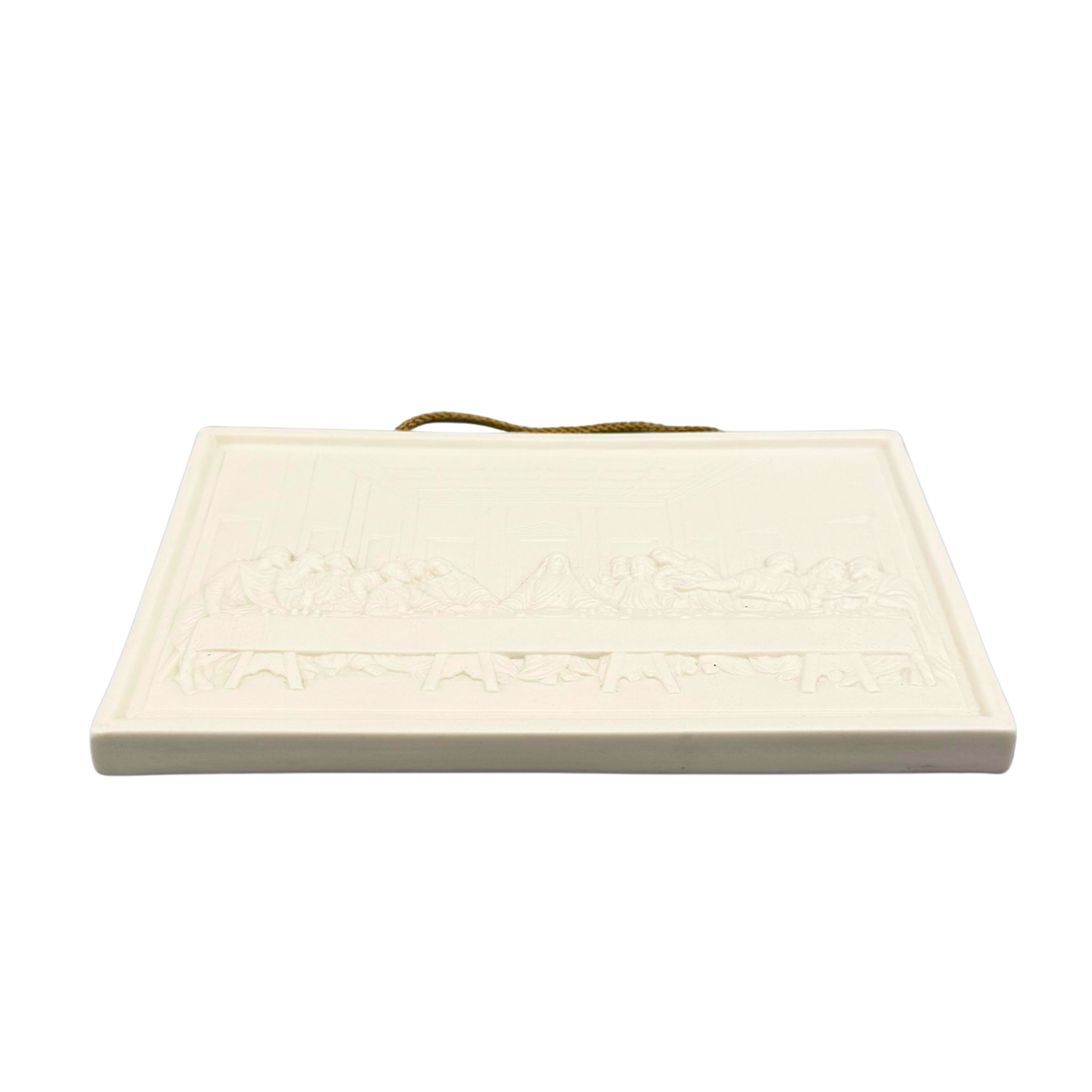 A white, rectangular ceramic wall plate with the motif of the Last Supper of Jesus and his disciples. From the Göbel brand. Stamped on the back