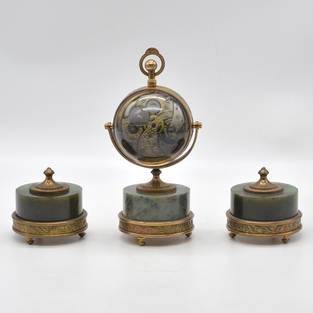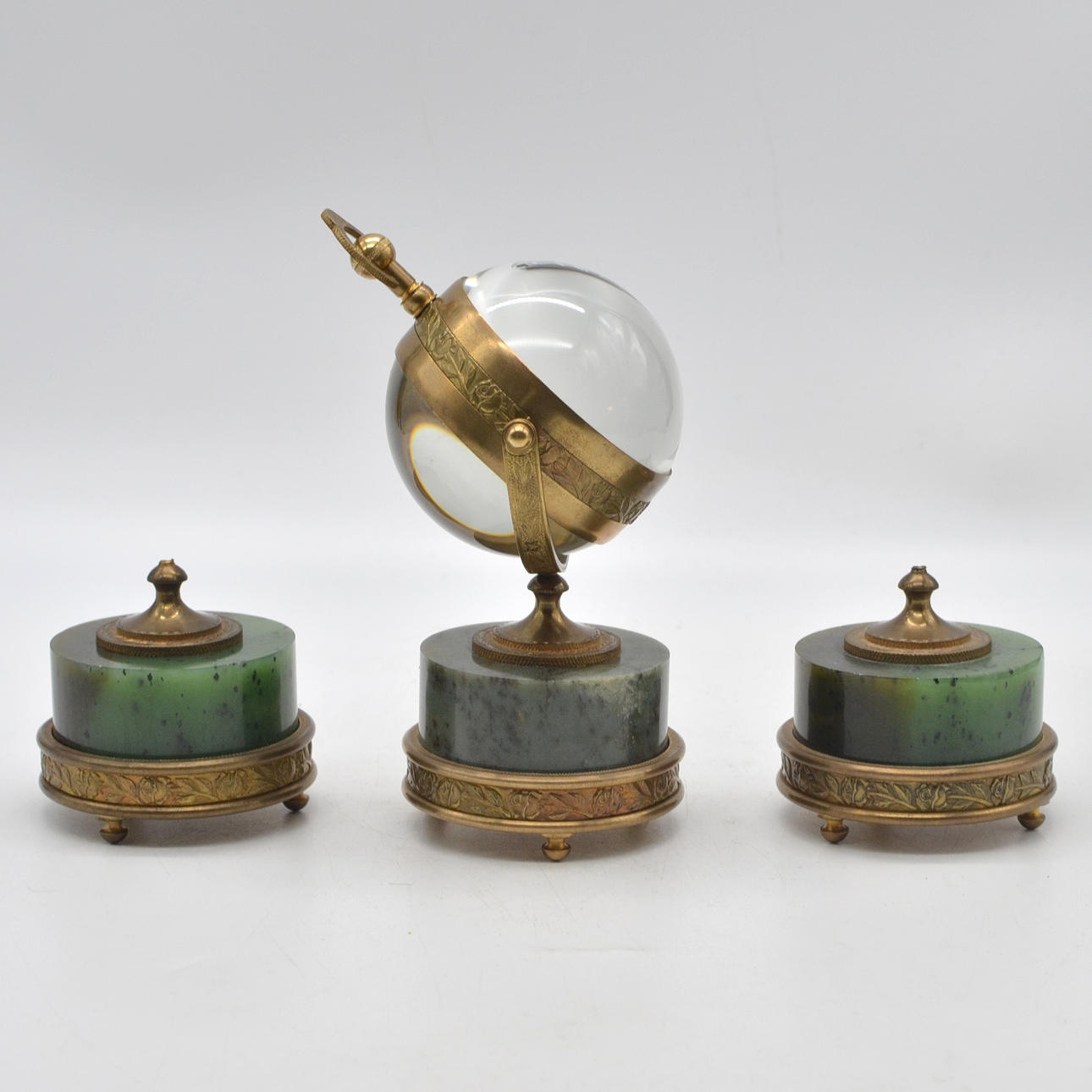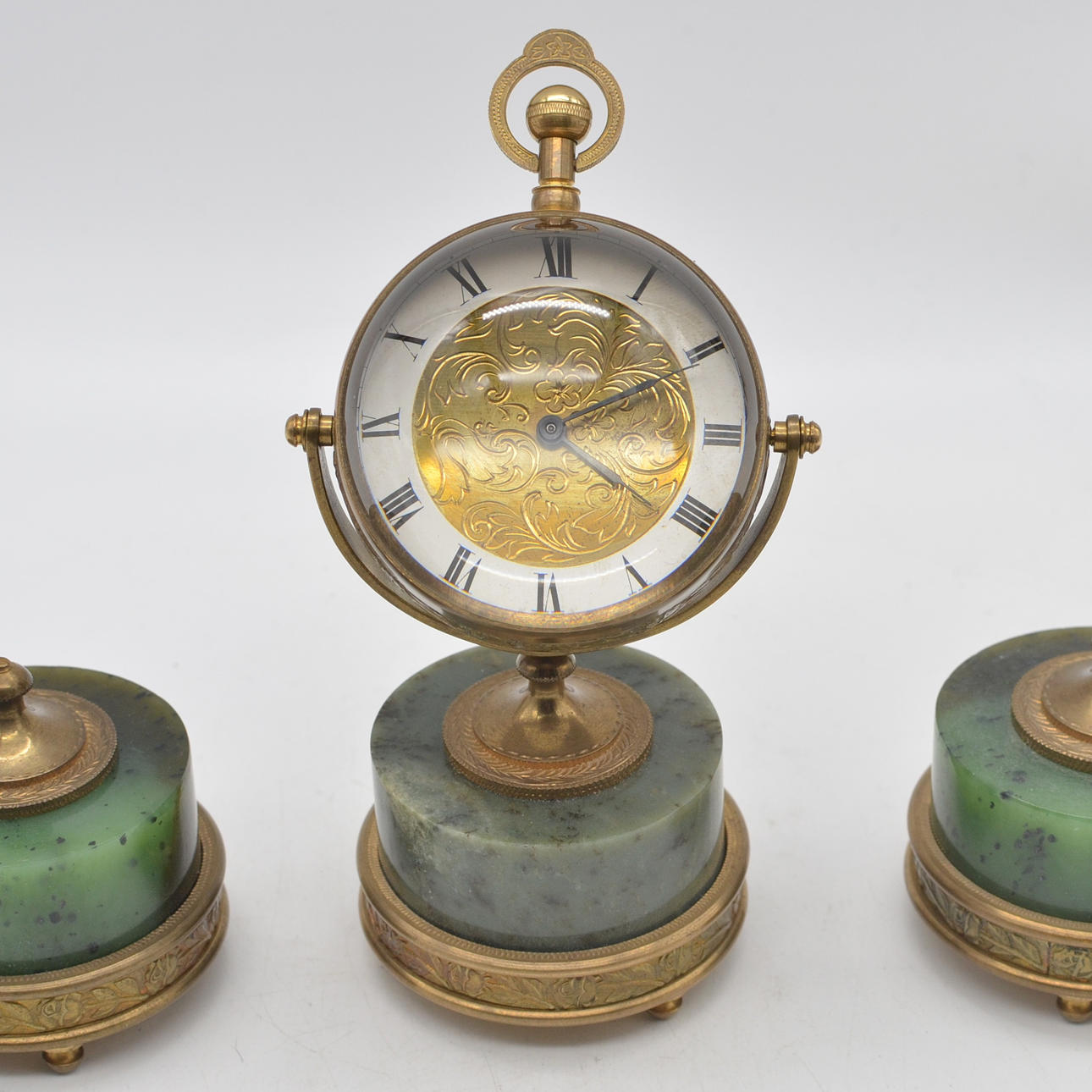 Three-piece table set with ball clock from the 20th century. All three parts consist of cylindrical nephrite on a brass base with surrounding rose decoration and chiselled ornamental decoration. The ball clock is made of glass with a brass mount. The gold-colored dial is engraved with floral decoration.
