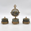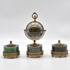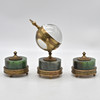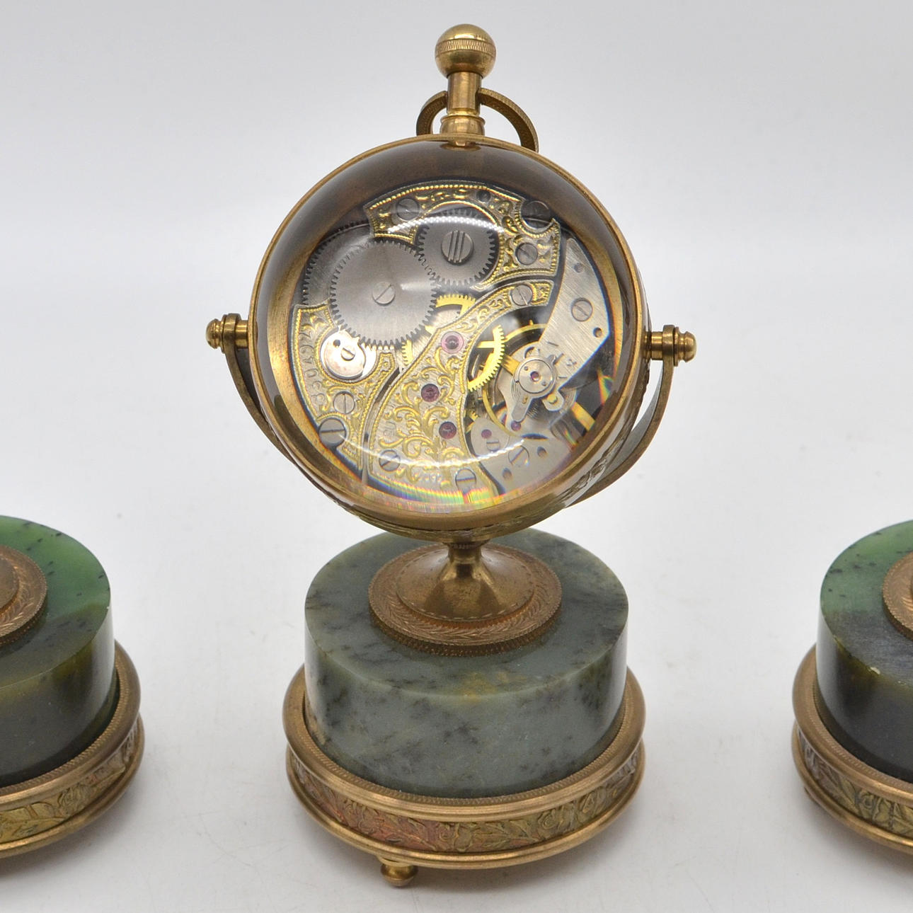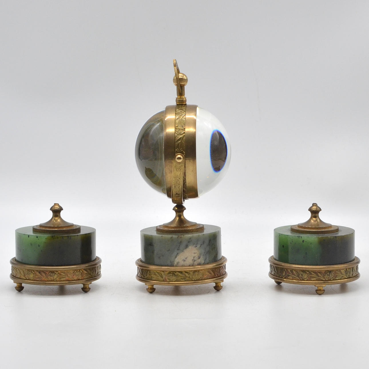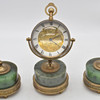 4927260. TABLE SET WITH BALL CLOCK, GLASS/ BRASS/ NEPHRITE, ENGRAVED DIAL, CIRCUMFERENTIAL ROSE DECORATION, 20TH CENTURY.