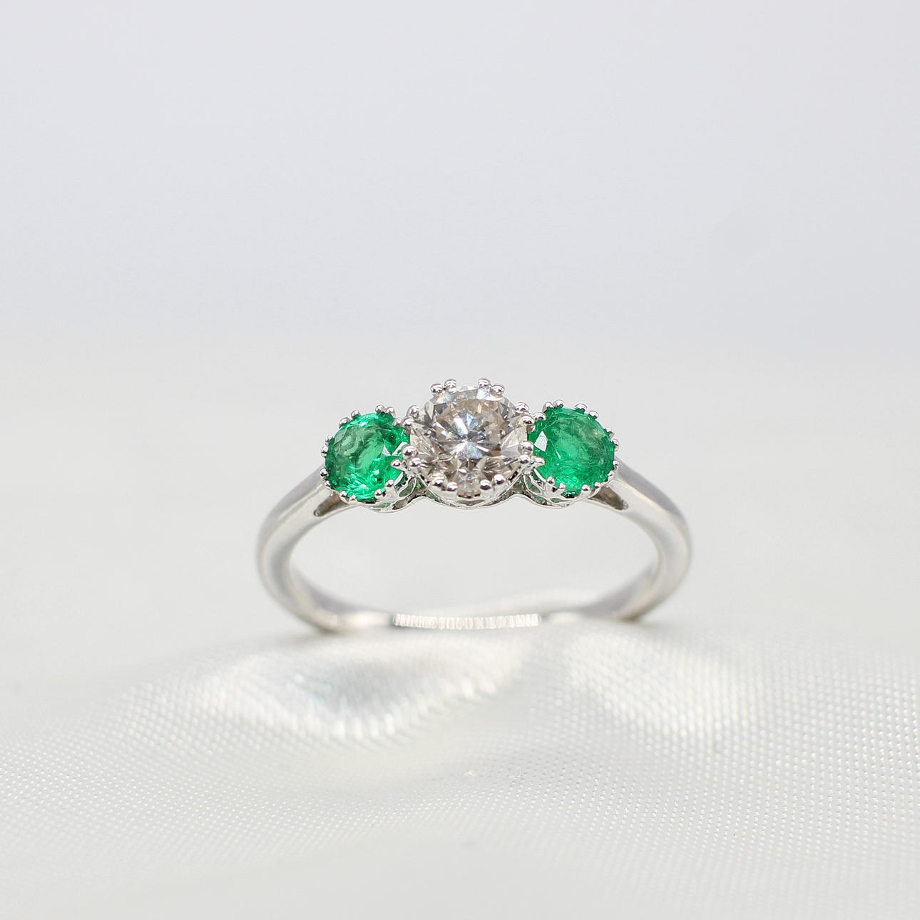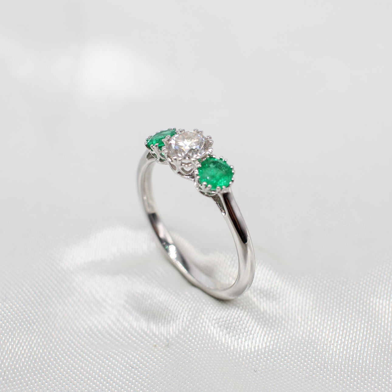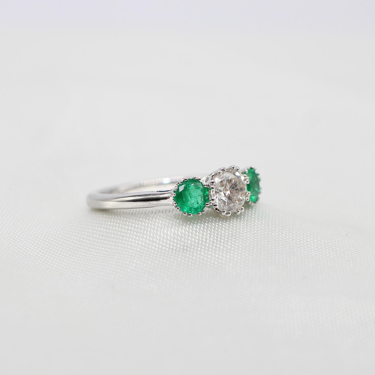 An 18ct White Gold (Stamped 750) Trilogy Ring Set With A Central Round Brilliant Cut Diamond Flanked By Round Cut Emeralds.