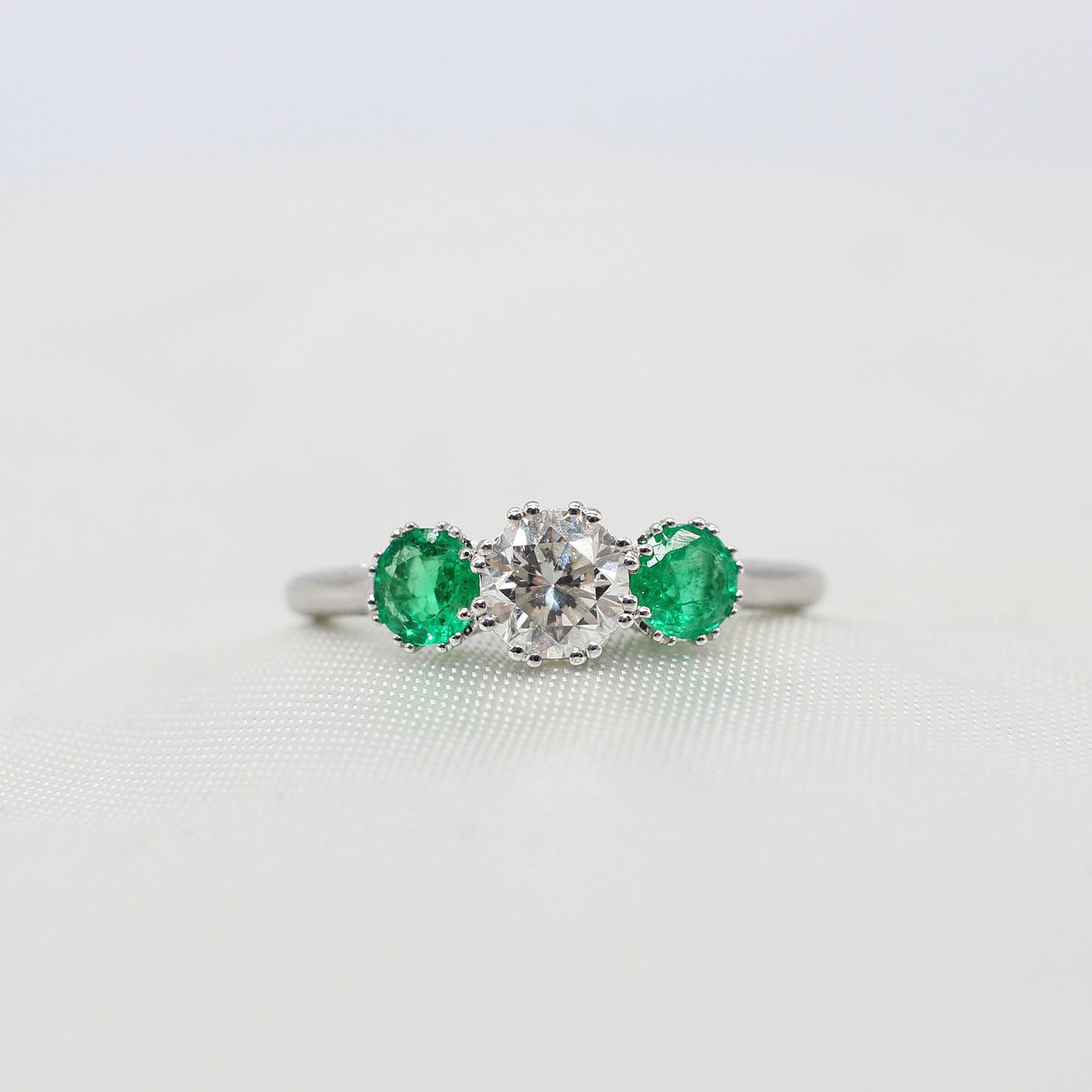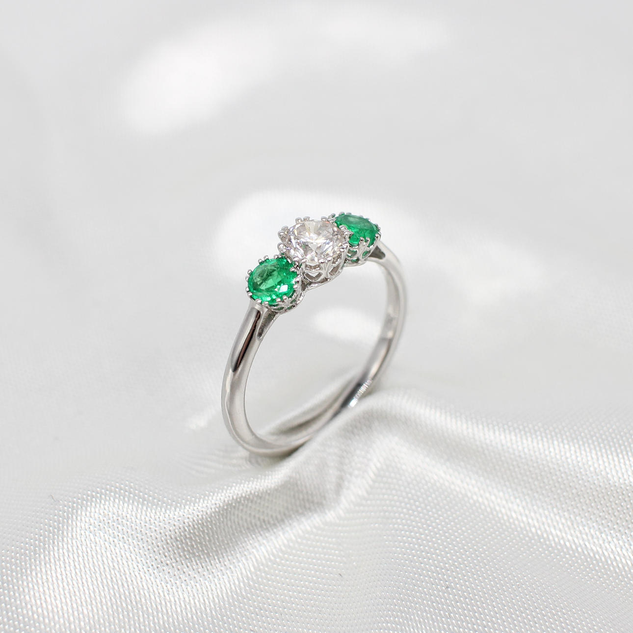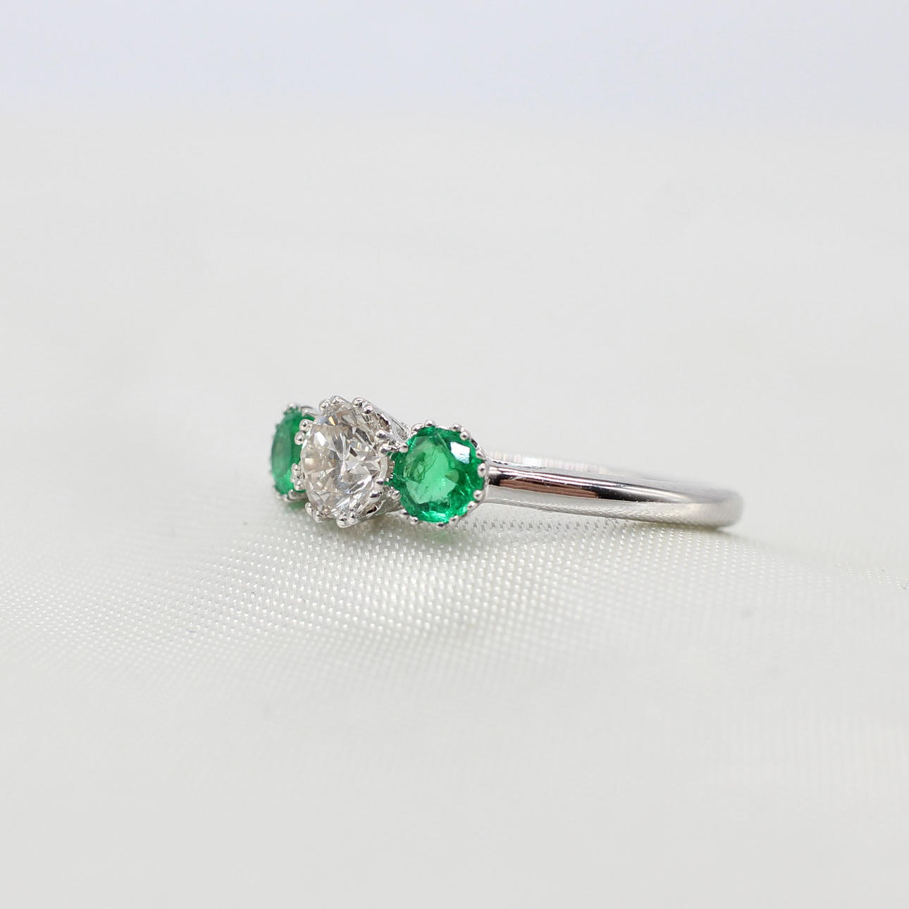 An 18ct White Gold (Stamped 750) Trilogy Ring Set With A Central Round Brilliant Cut Diamond Flanked By Round Cut Emeralds.