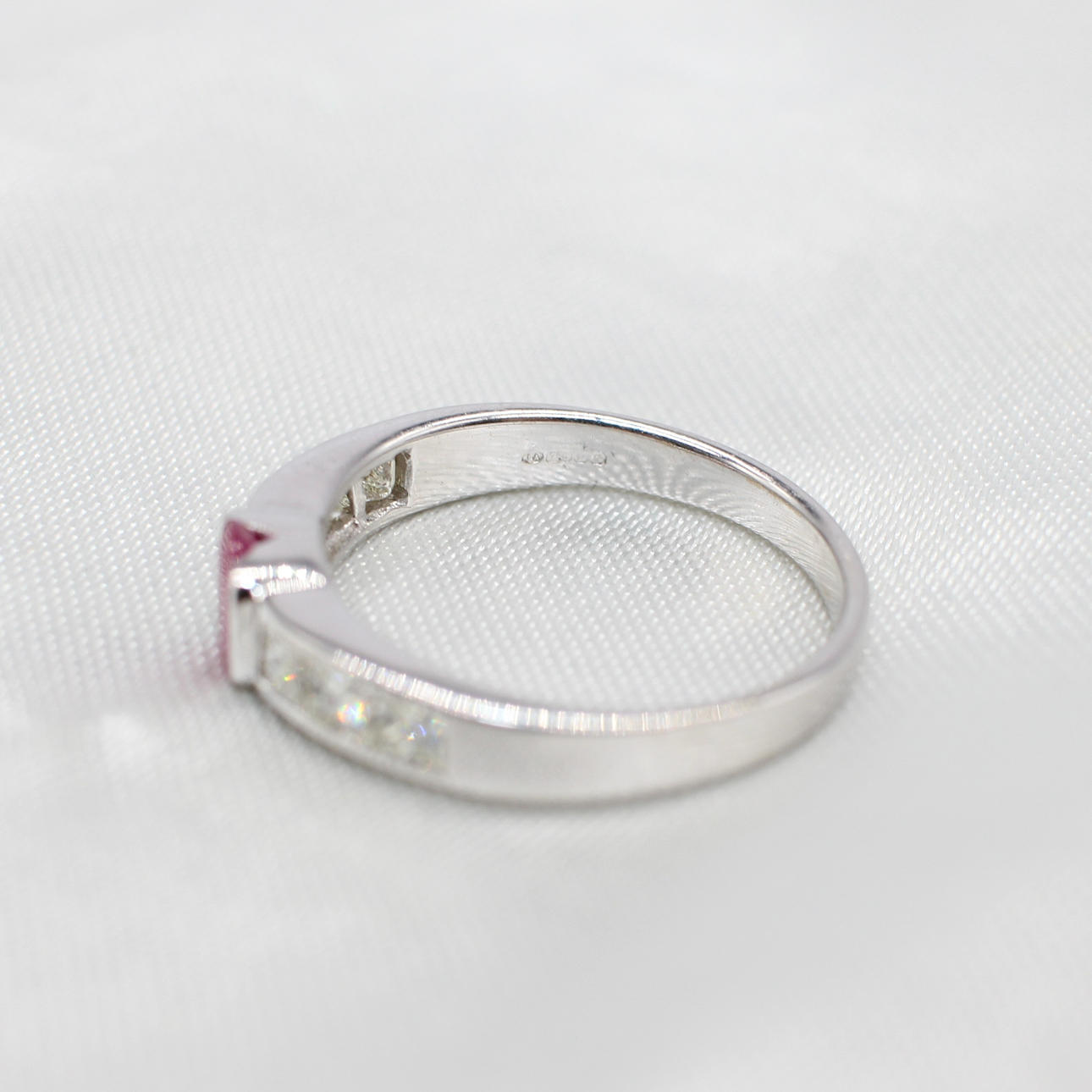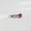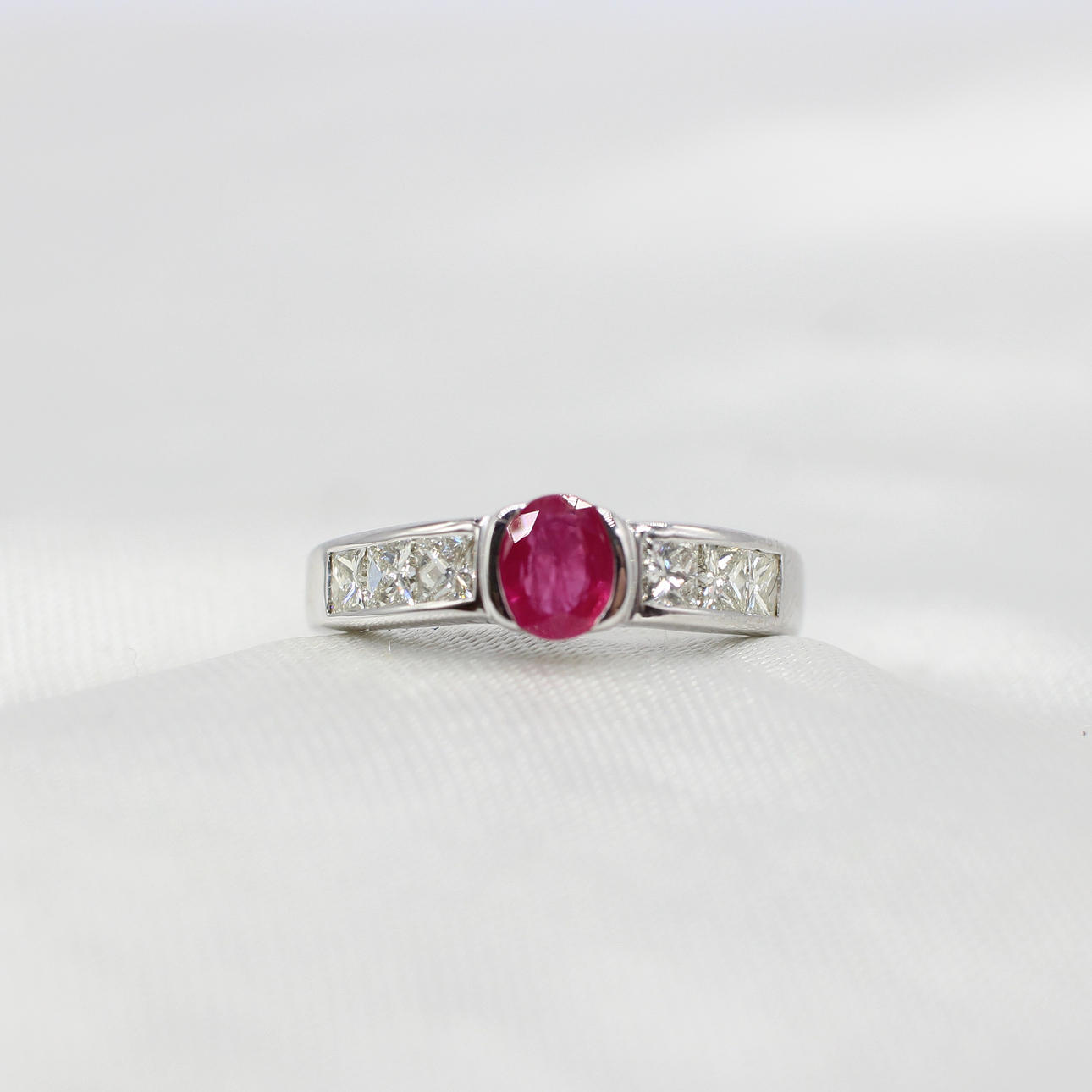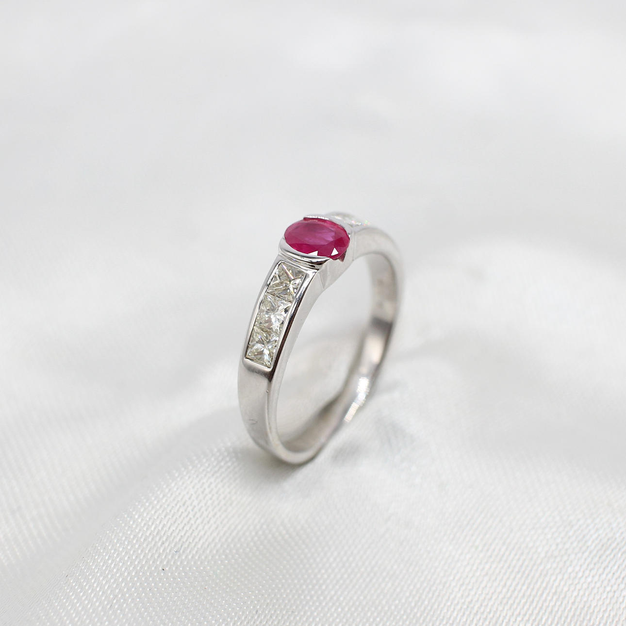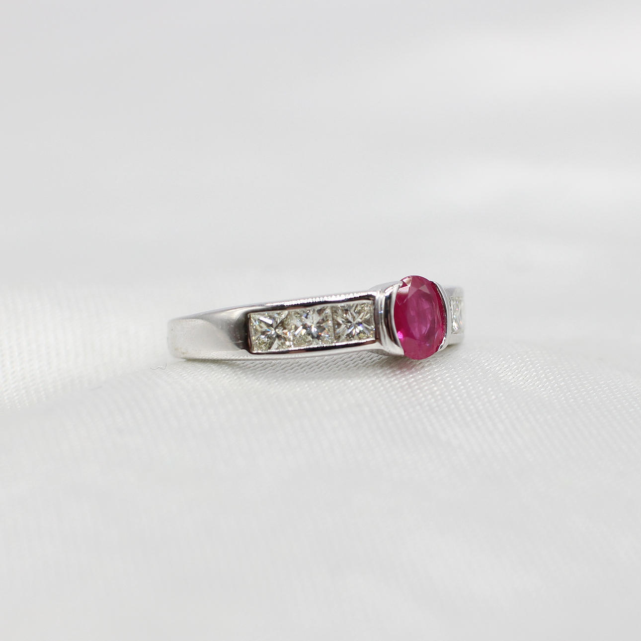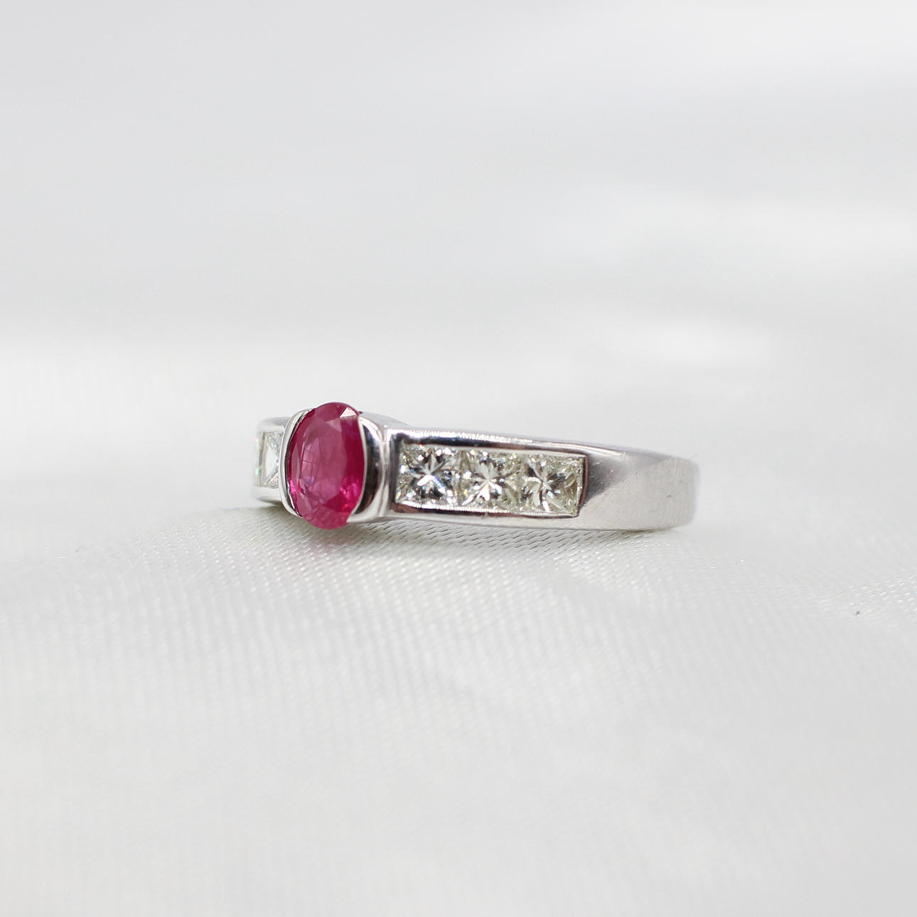 An 18K White Gold (Hallmarked) Ring Set With Oval Ruby And Princess Cut Diamonds Down Each Side.