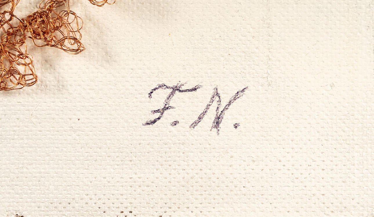 Made of copper wire, partially crocheted. Monogram signed: F.N.