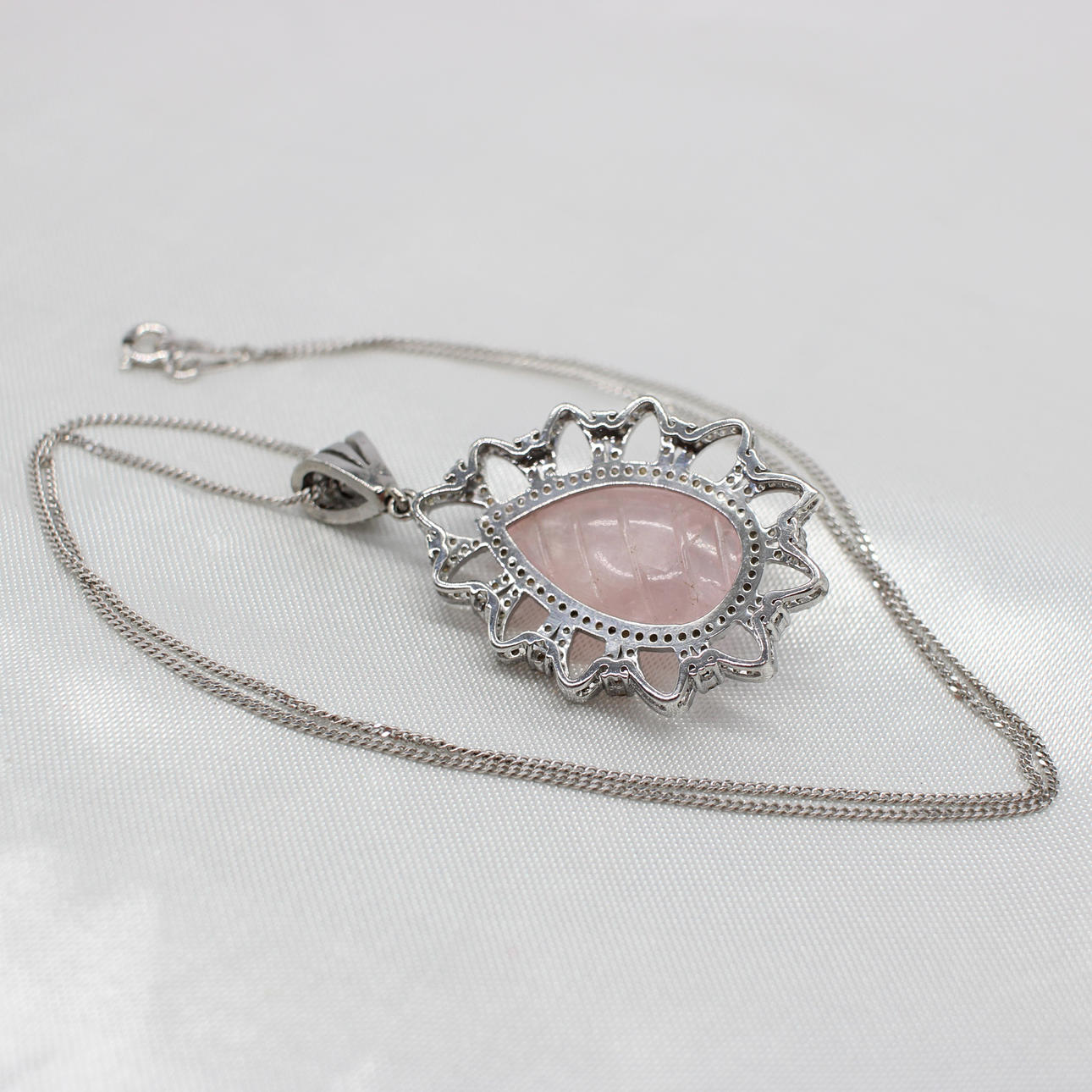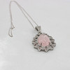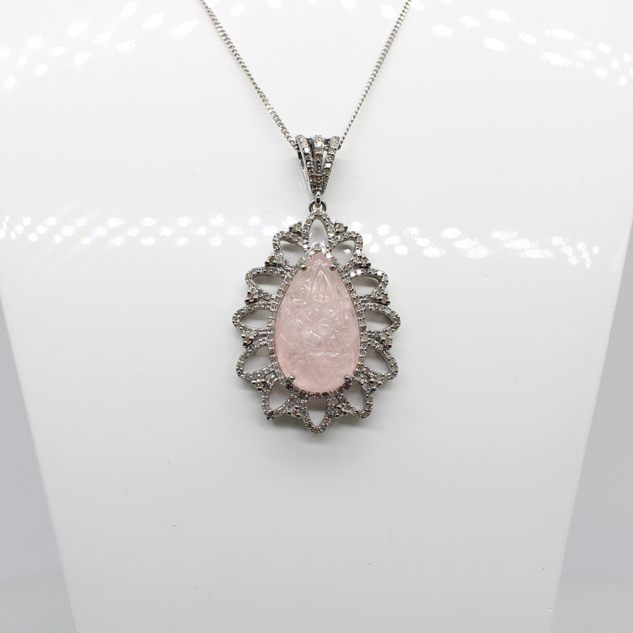 A Silver Pendant (Stamped 925) Set With A Hand Carved Rose Design Pear Shaped Morganite And Diamonds On A Silver (Stamped 925) Chain.